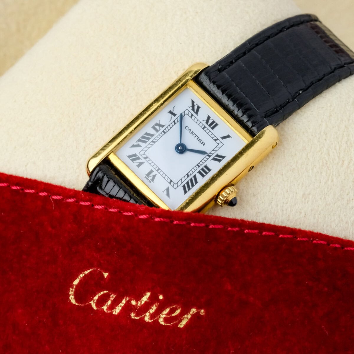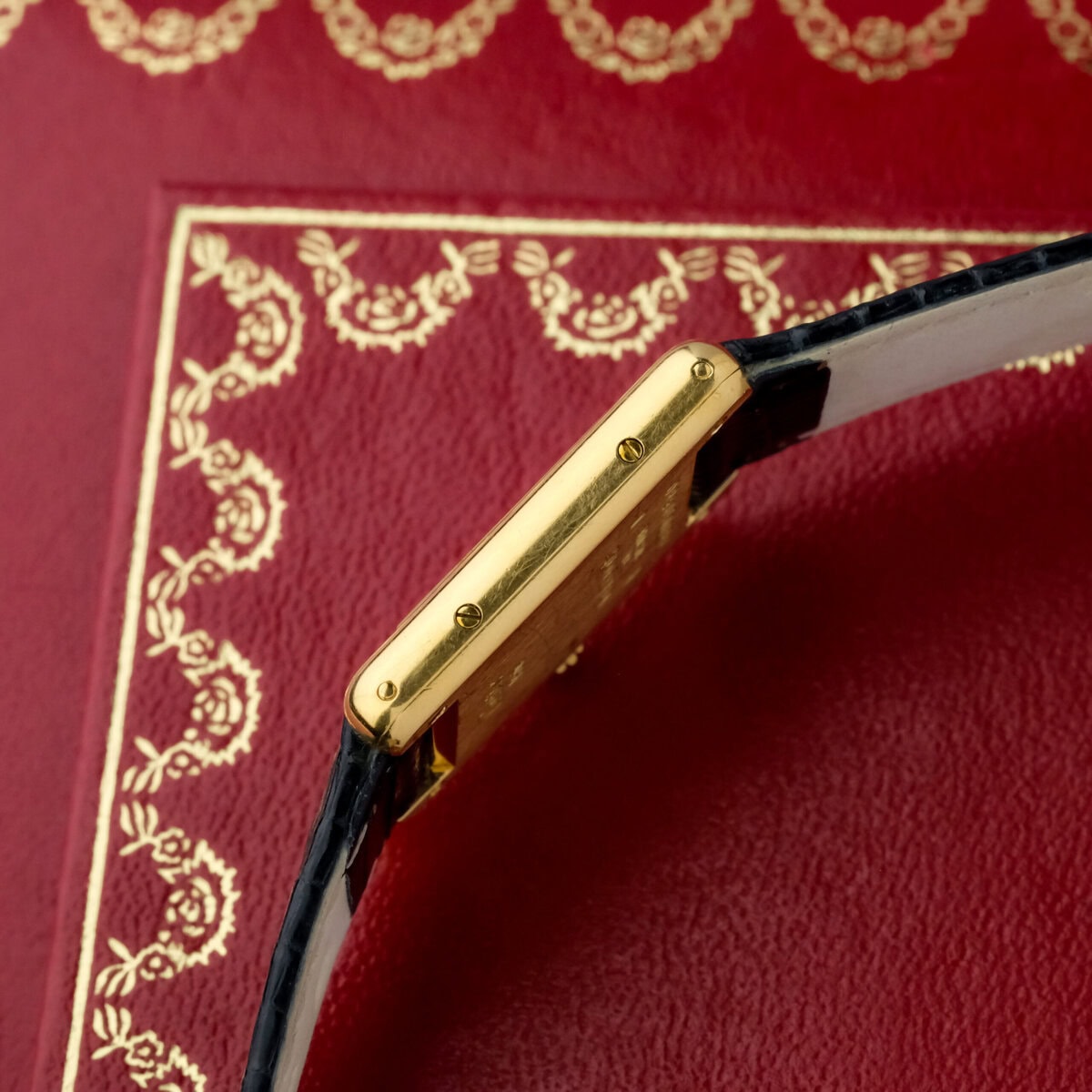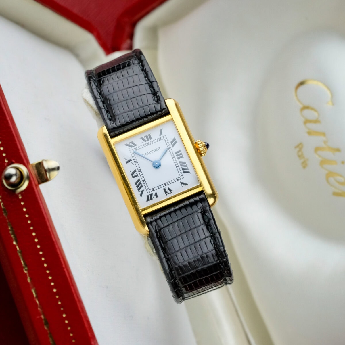 This example comes on a black leather strap (non-Cartier) and is offered without original box or papers. It is in good, worn condition with light signs of use, retaining its beautiful luster and charm.