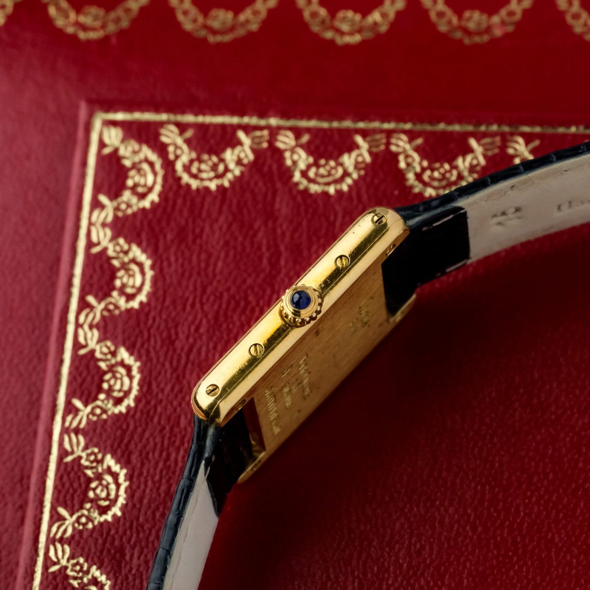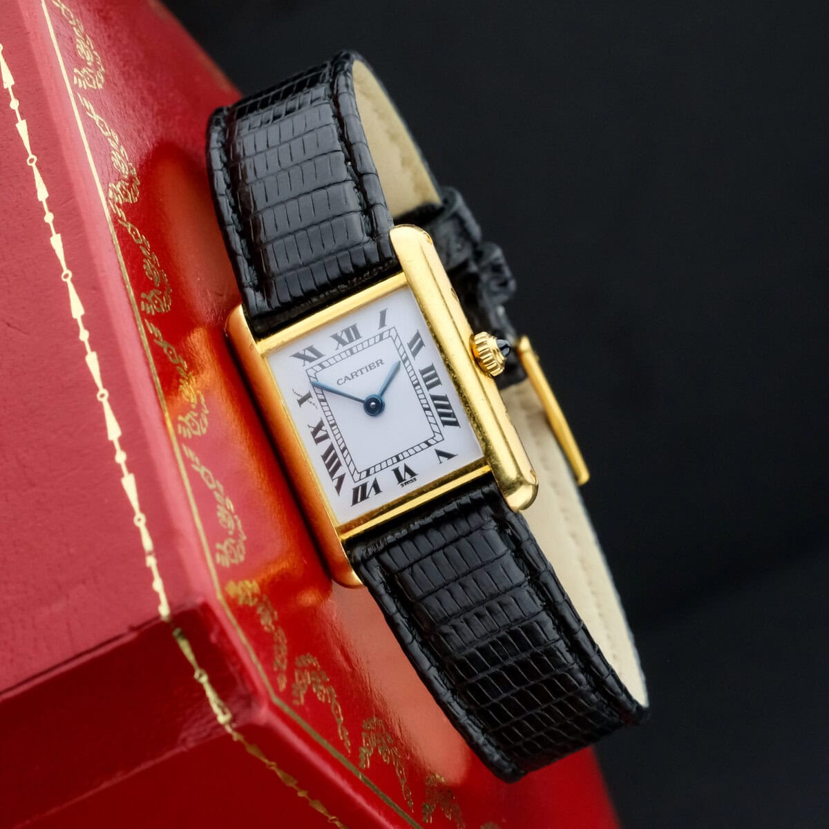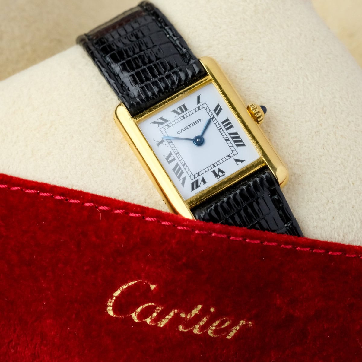 This example comes on a black leather strap (non-Cartier) and is offered without original box or papers. It is in good, worn condition with light signs of use, retaining its beautiful luster and charm.