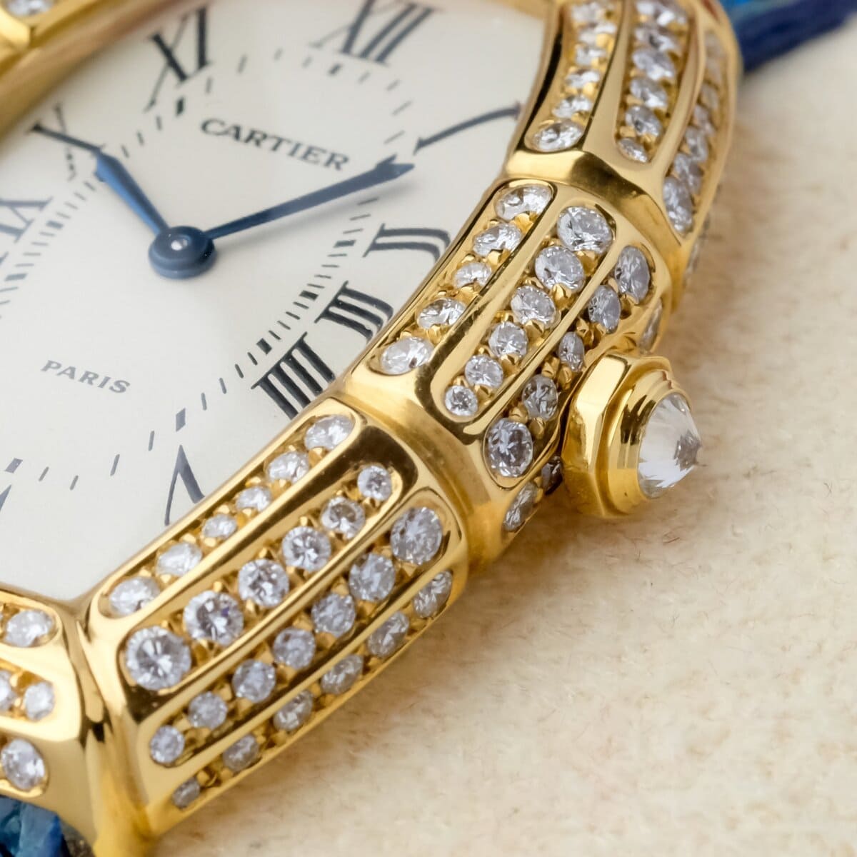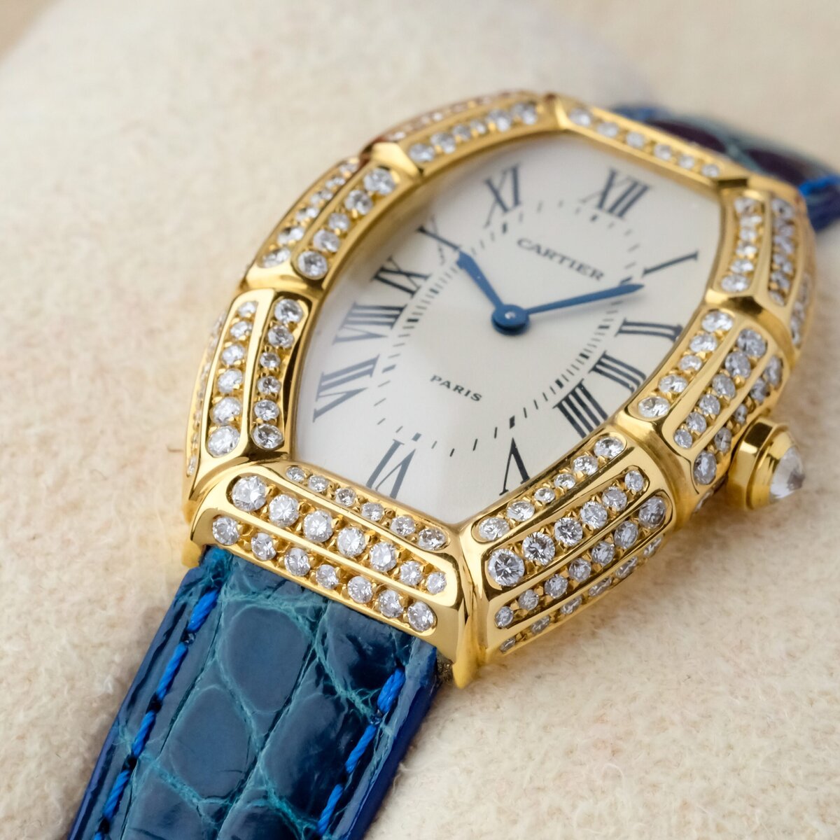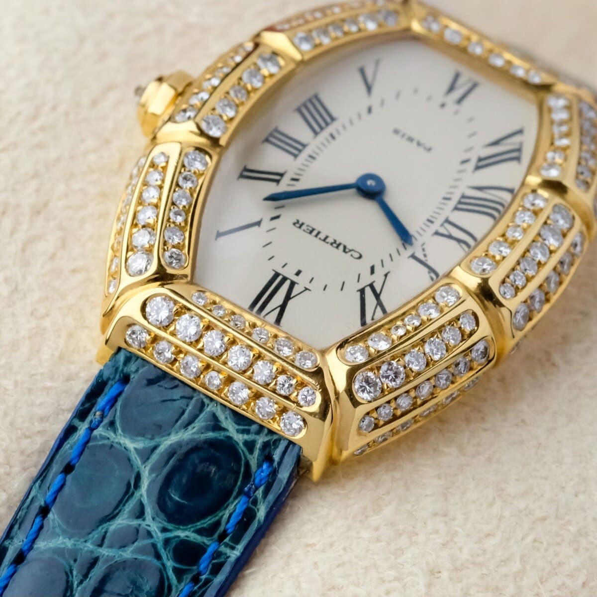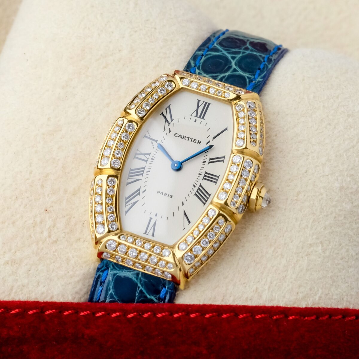 Cartier Tonneau Bamboo “Sertissage” reference WA501931 in 18k yellow gold, powered by a quartz movement. The watch features the signature curved Tonneau case with Bamboo style lugs and is fully set with Cartier factory diamonds, totaling approximately 2.30 carats. The diamond setting is uniform and precise, showcasing Cartier’s high jewelry craftsmanship.