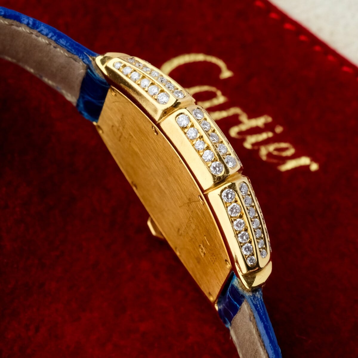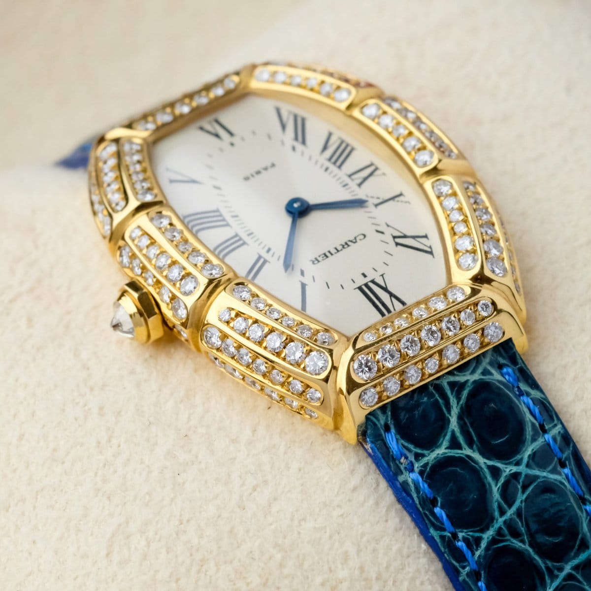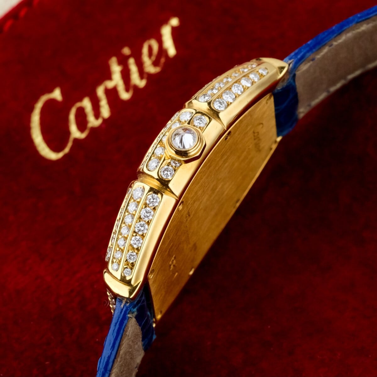 The original Cartier folding clasp is also crafted in 18k yellow gold and fully diamond set, matching the case in both execution and quality. The dial is clean and well preserved, and the watch remains in excellent overall condition.