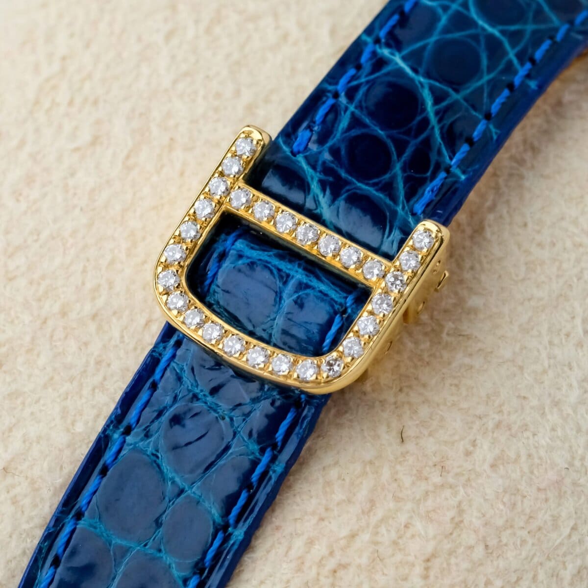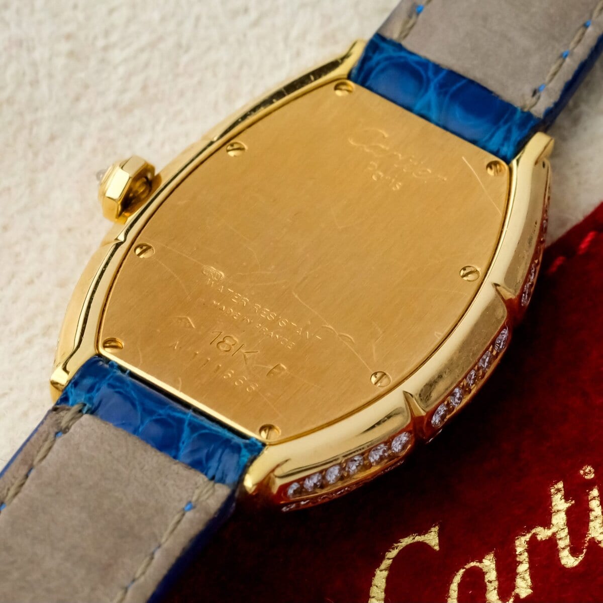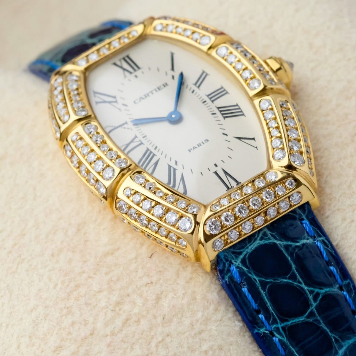 The original Cartier folding clasp is also crafted in 18k yellow gold and fully diamond set, matching the case in both execution and quality. The dial is clean and well preserved, and the watch remains in excellent overall condition.