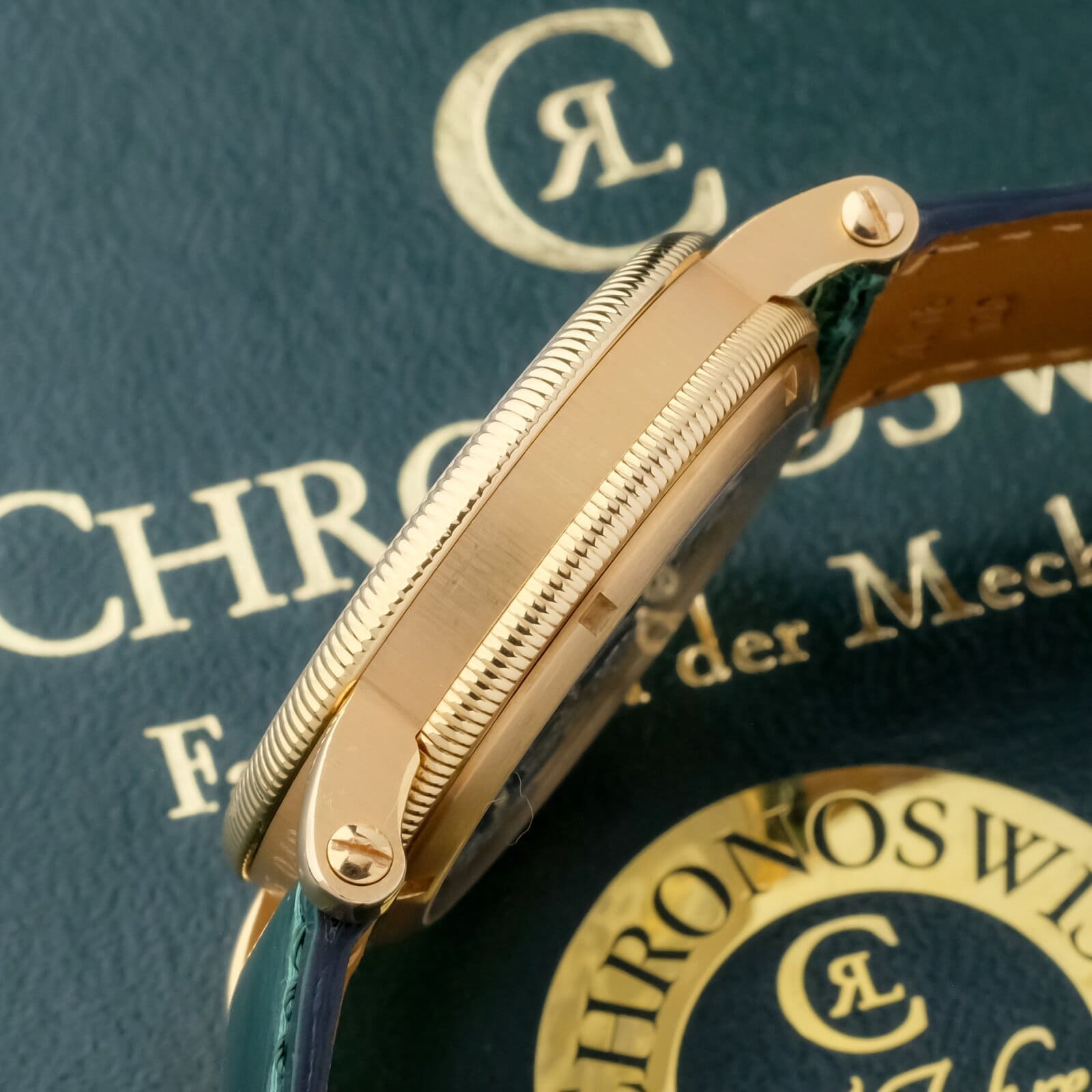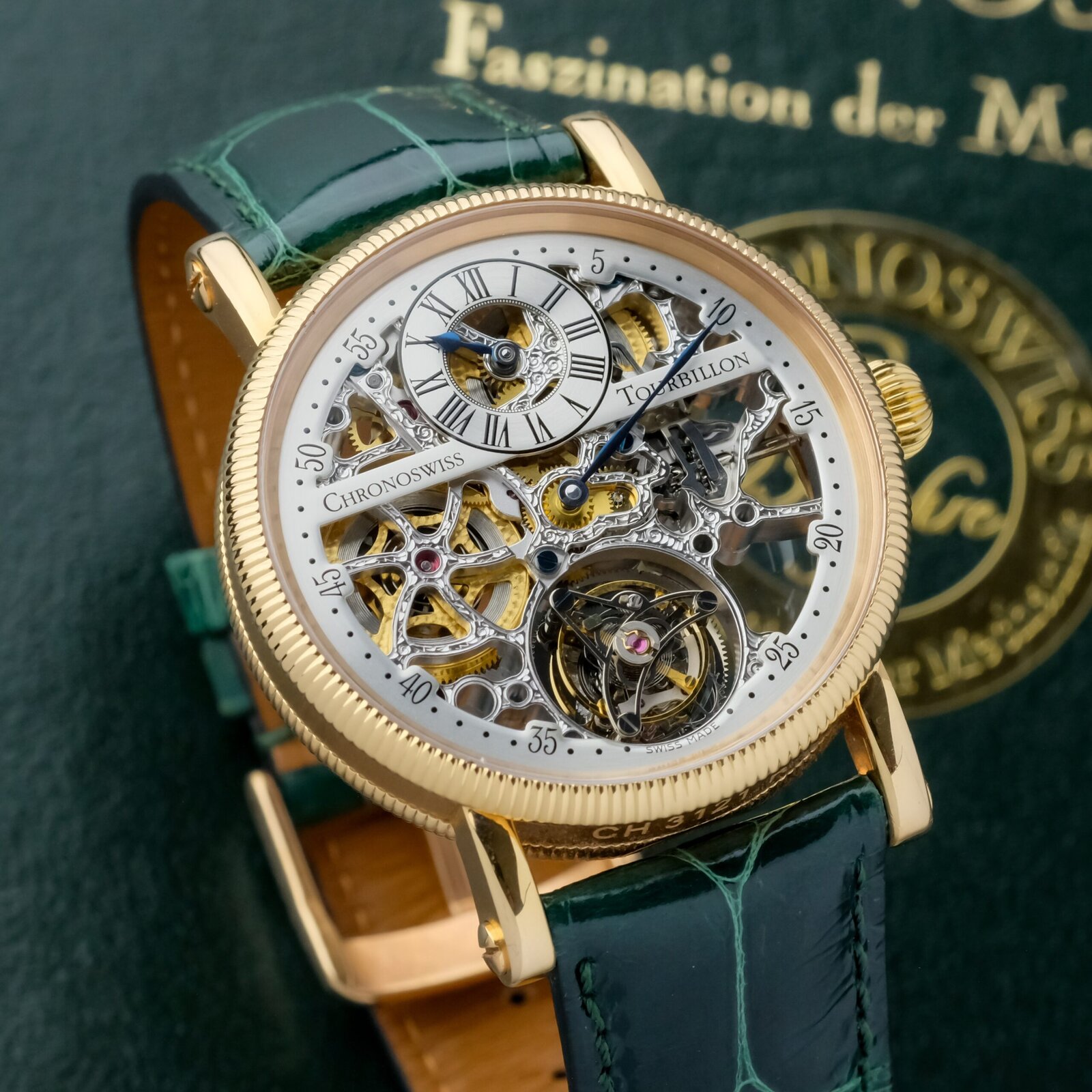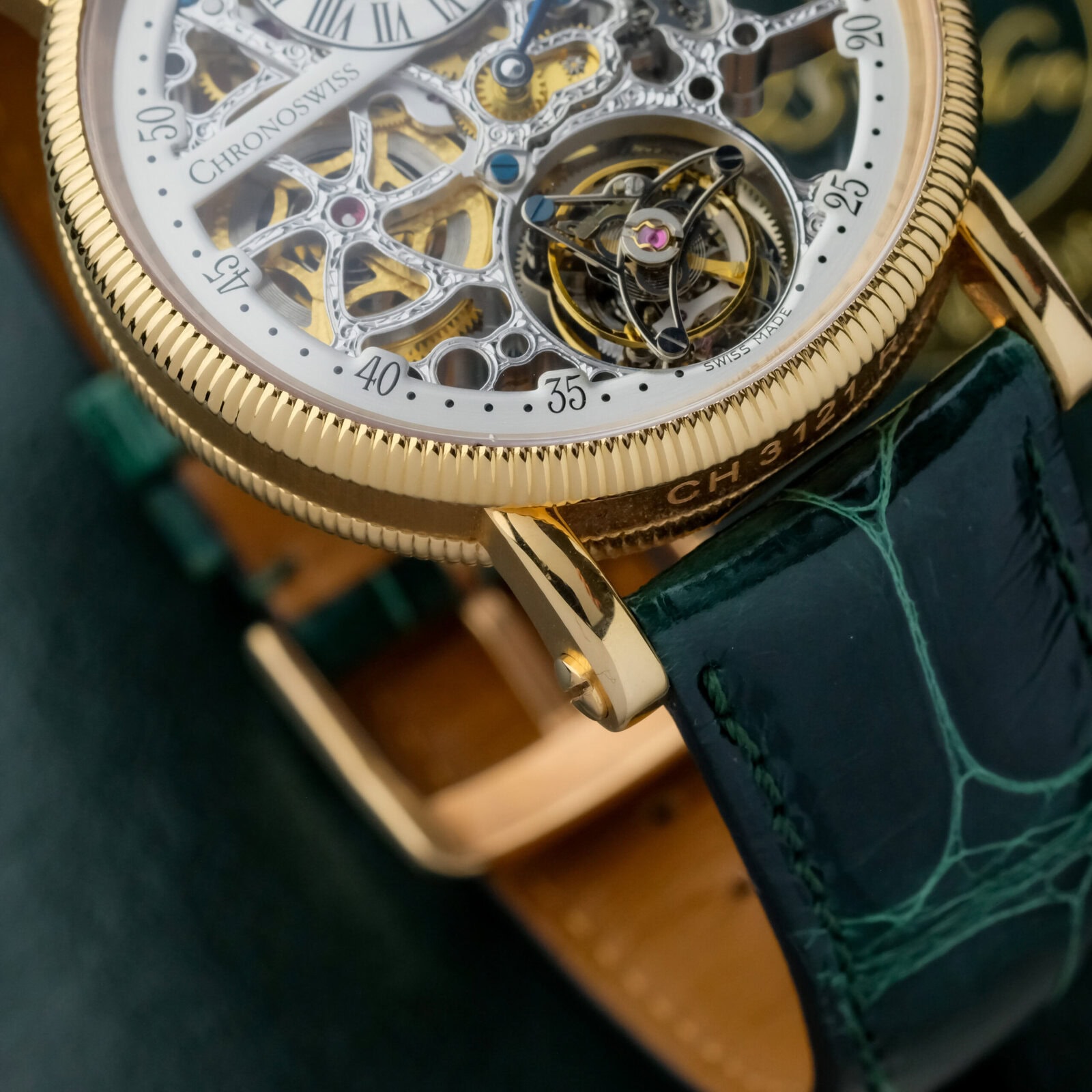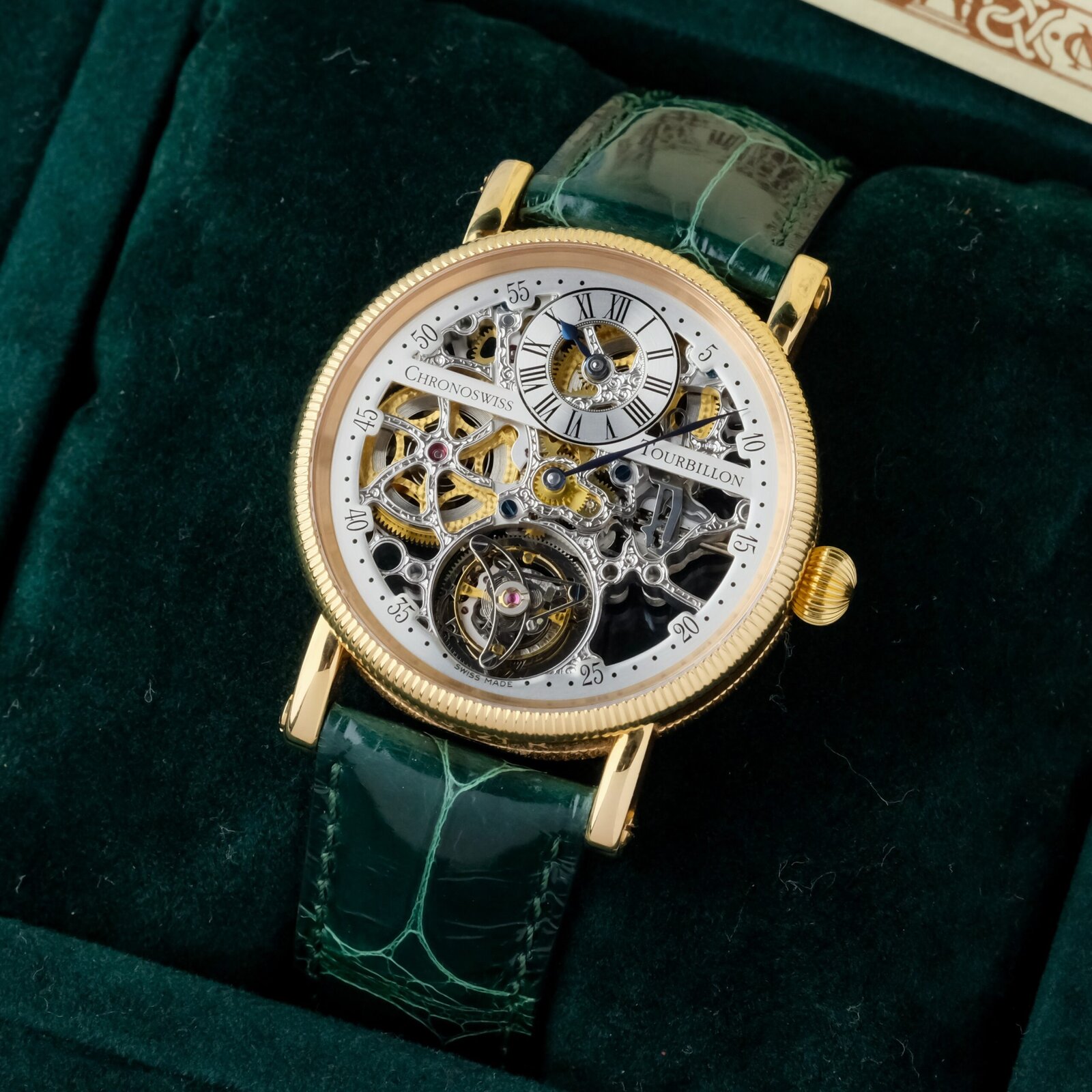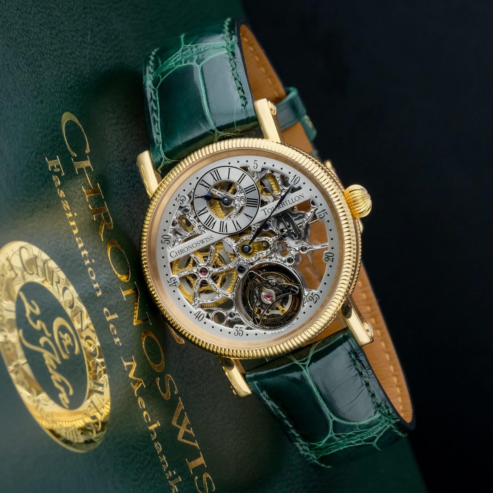 Fitted with a green leather strap, the watch is offered as a full set including a large wooden presentation box. A rare and expressive Chronoswiss, combining skeletonization, regulator display and tourbillon complication in a distinctive design.