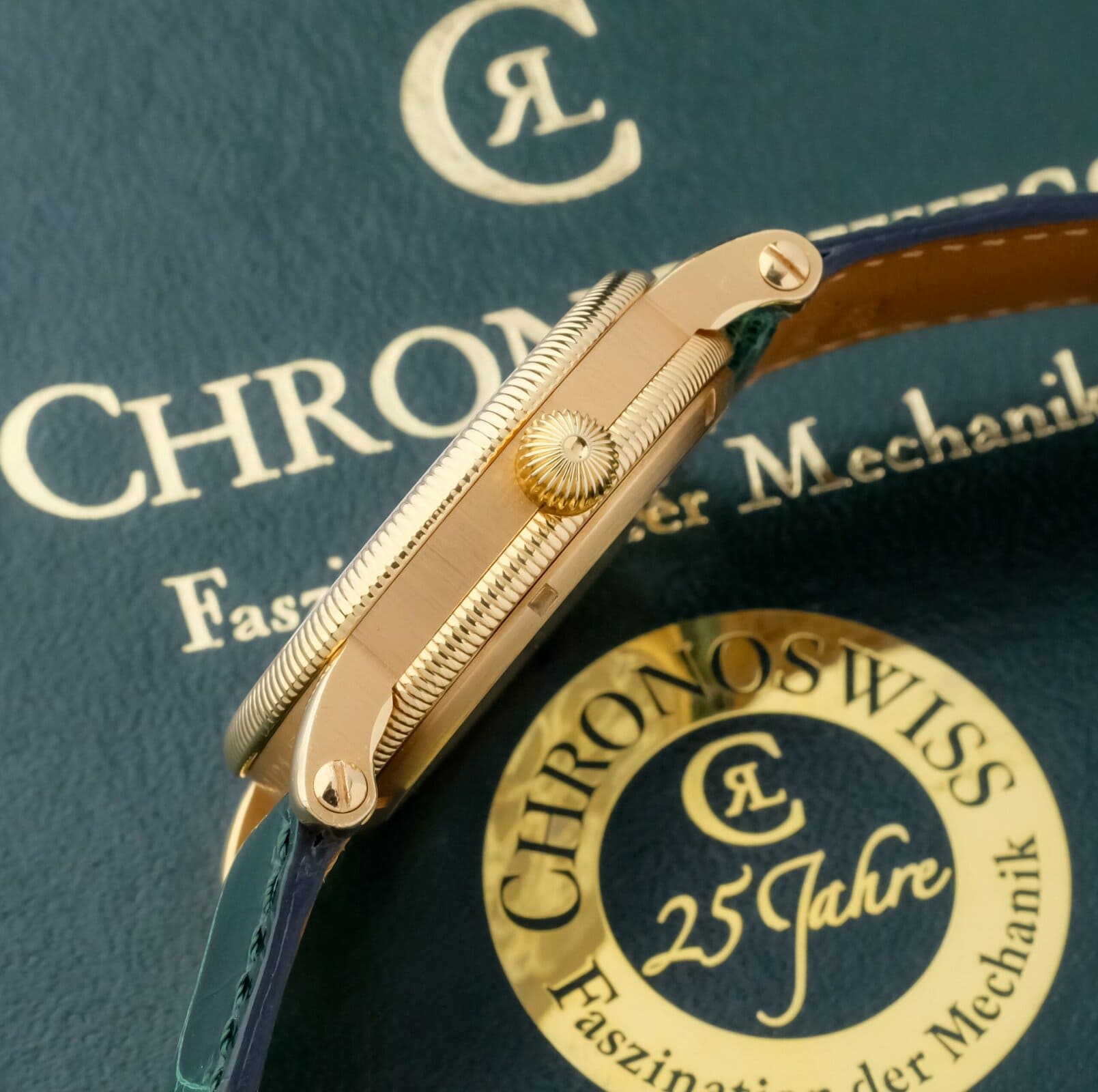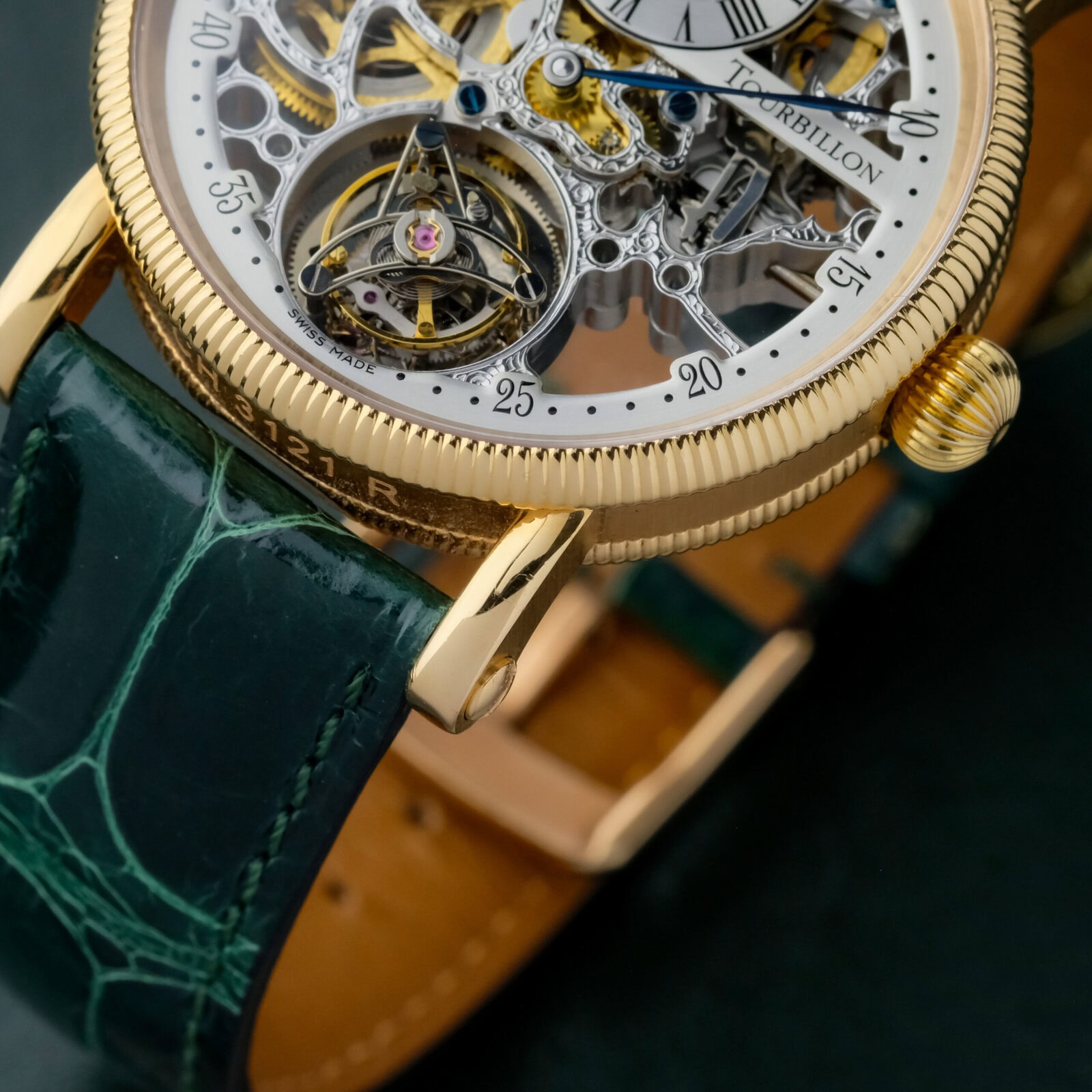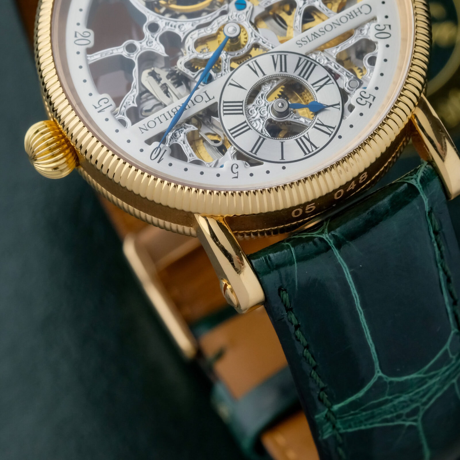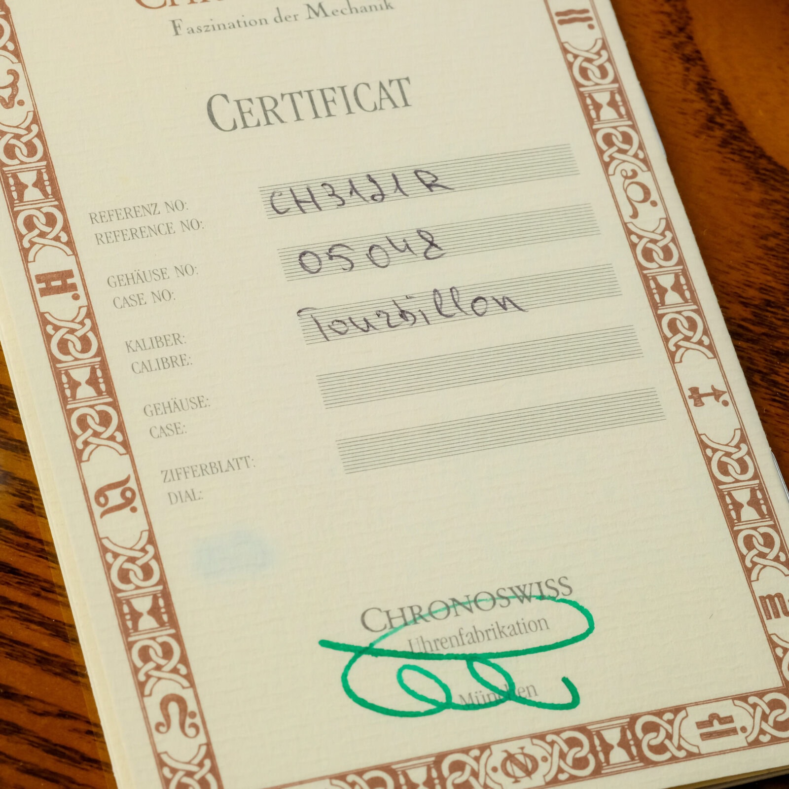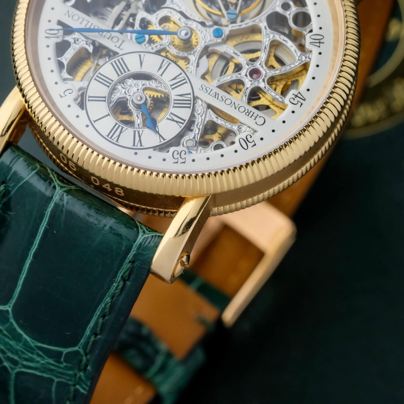 Fitted with a green leather strap, the watch is offered as a full set including a large wooden presentation box. A rare and expressive Chronoswiss, combining skeletonization, regulator display and tourbillon complication in a distinctive design.