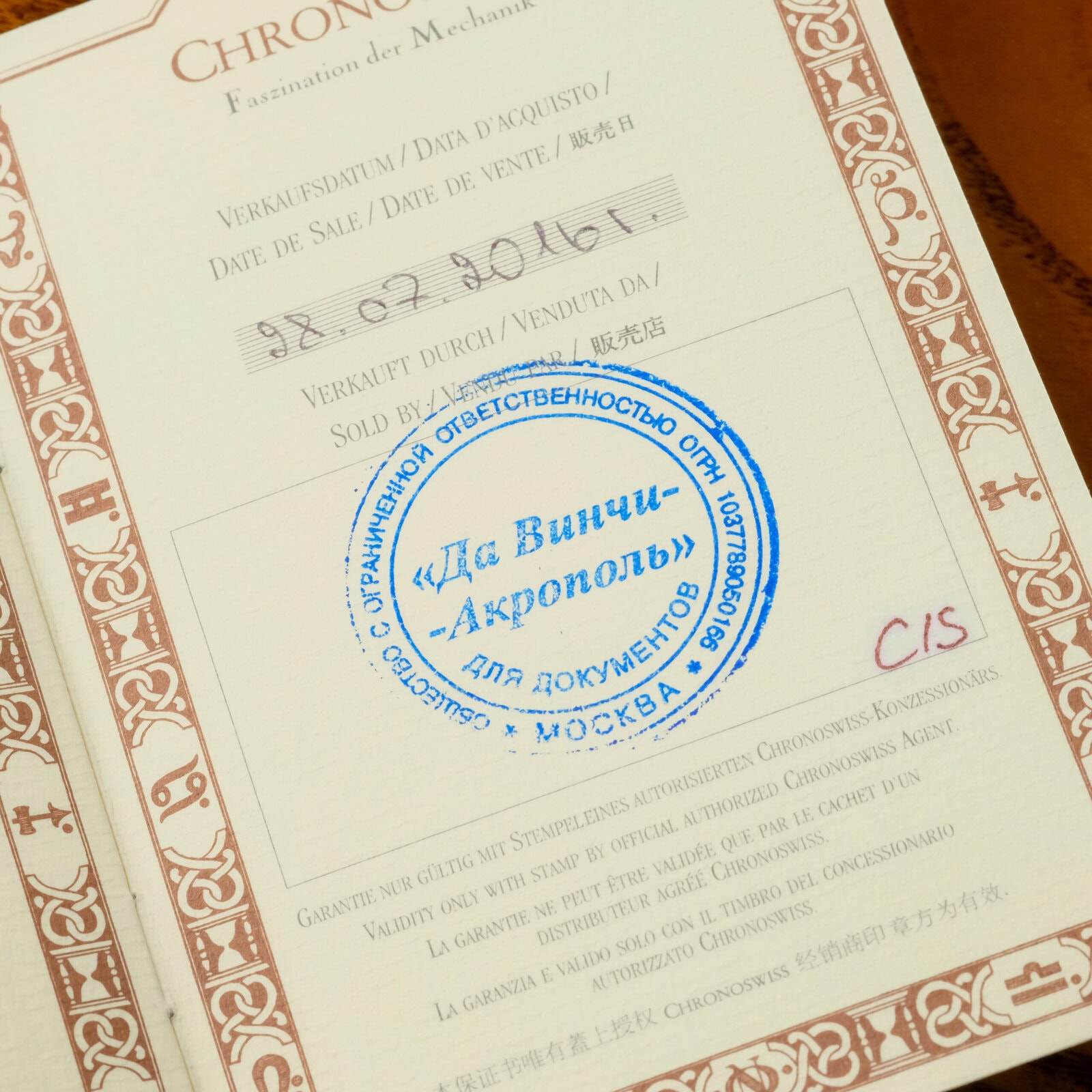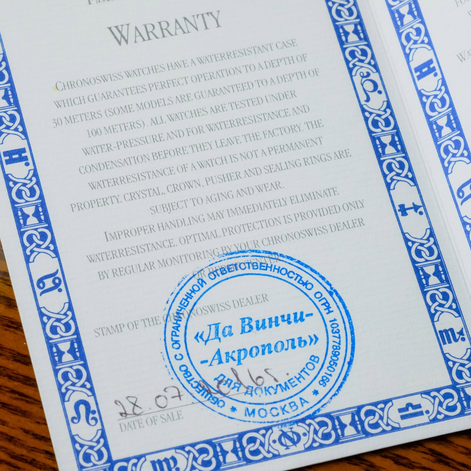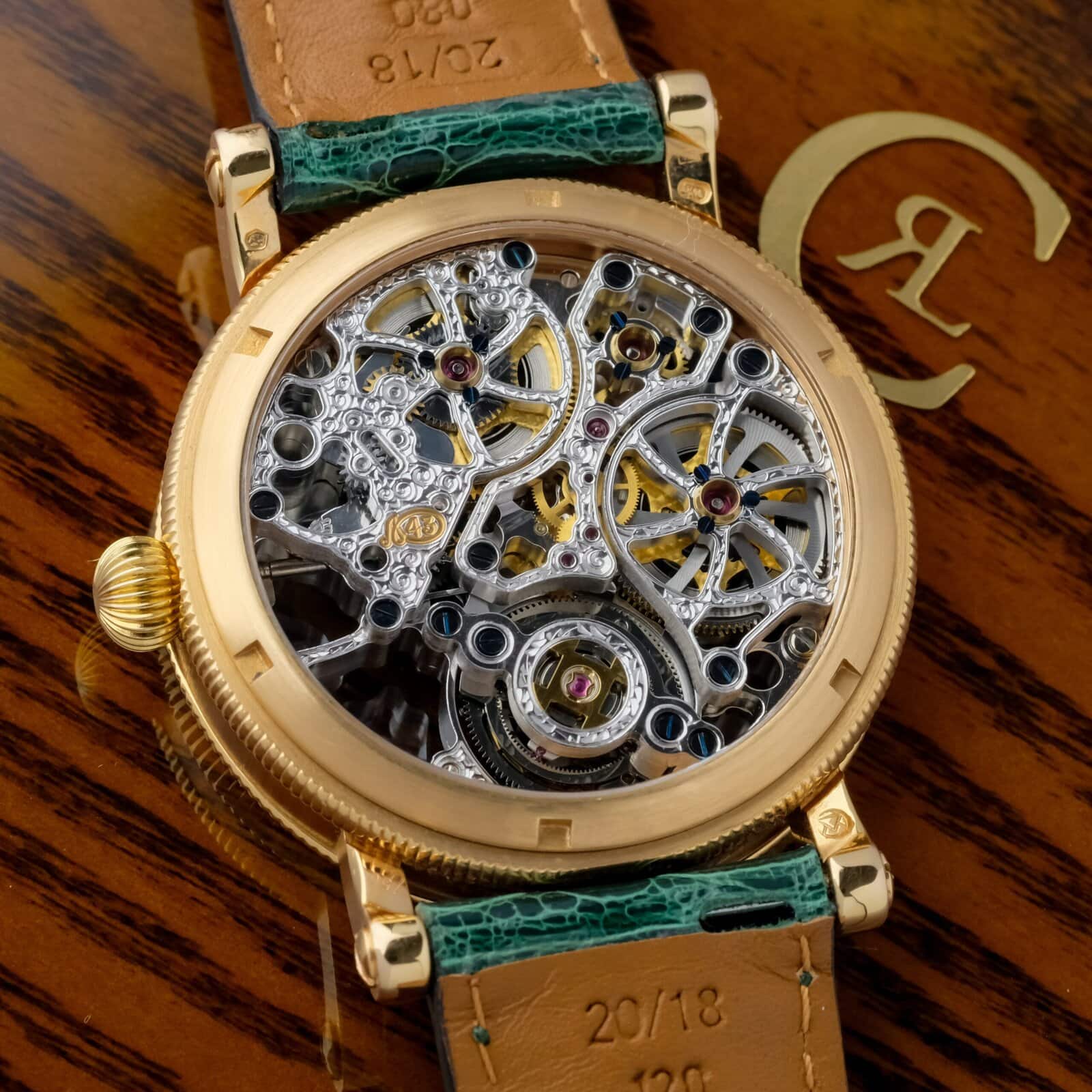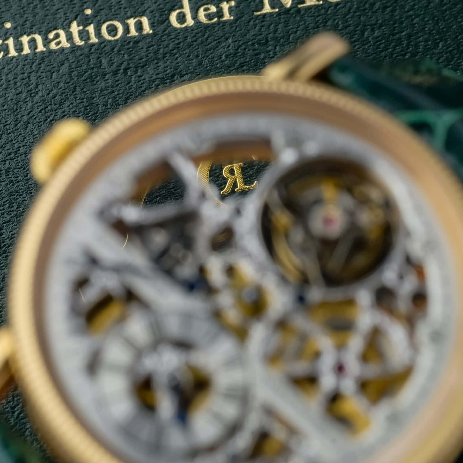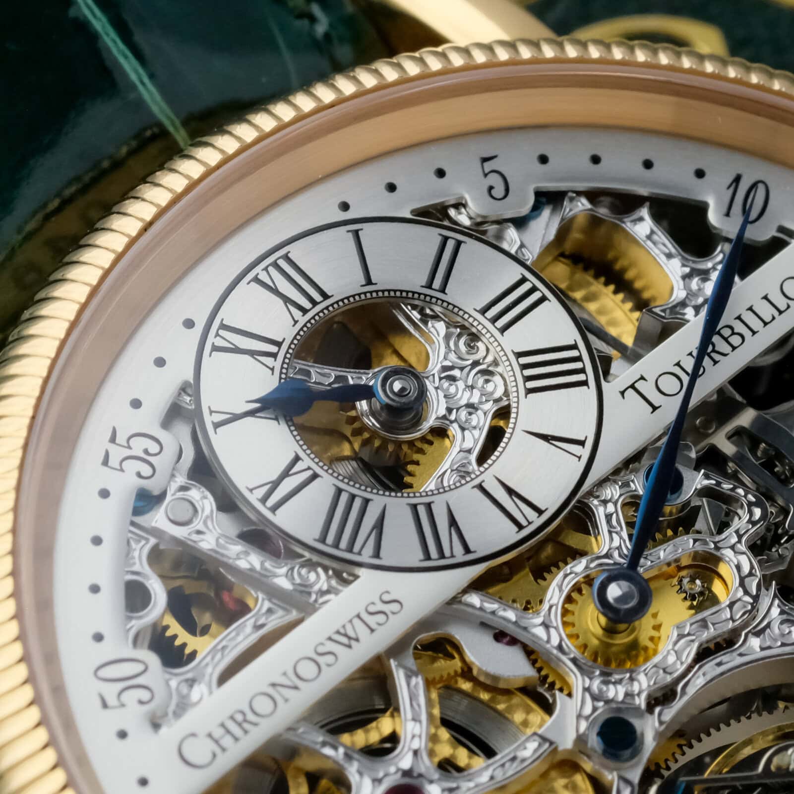 Fitted with a green leather strap, the watch is offered as a full set including a large wooden presentation box. A rare and expressive Chronoswiss, combining skeletonization, regulator display and tourbillon complication in a distinctive design.