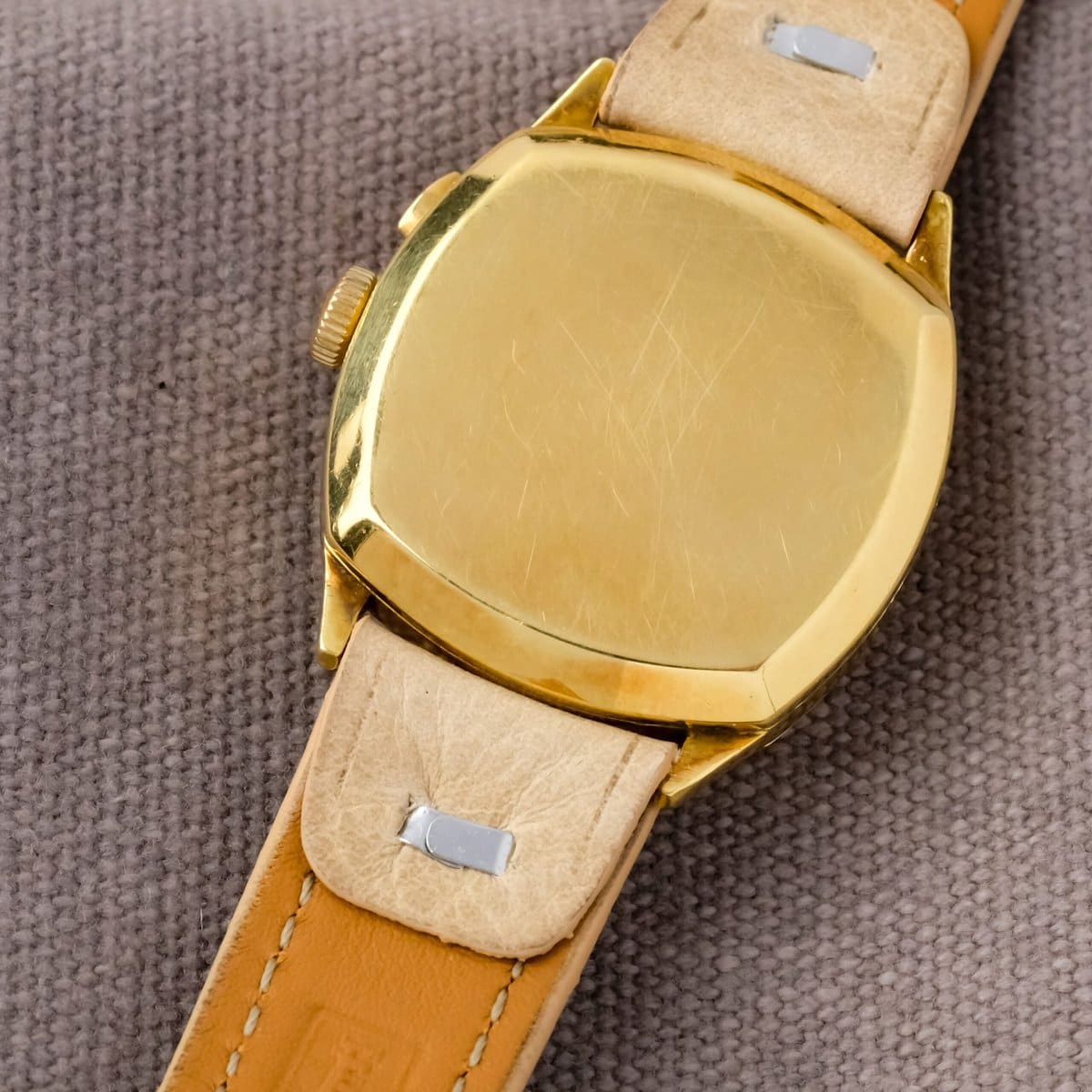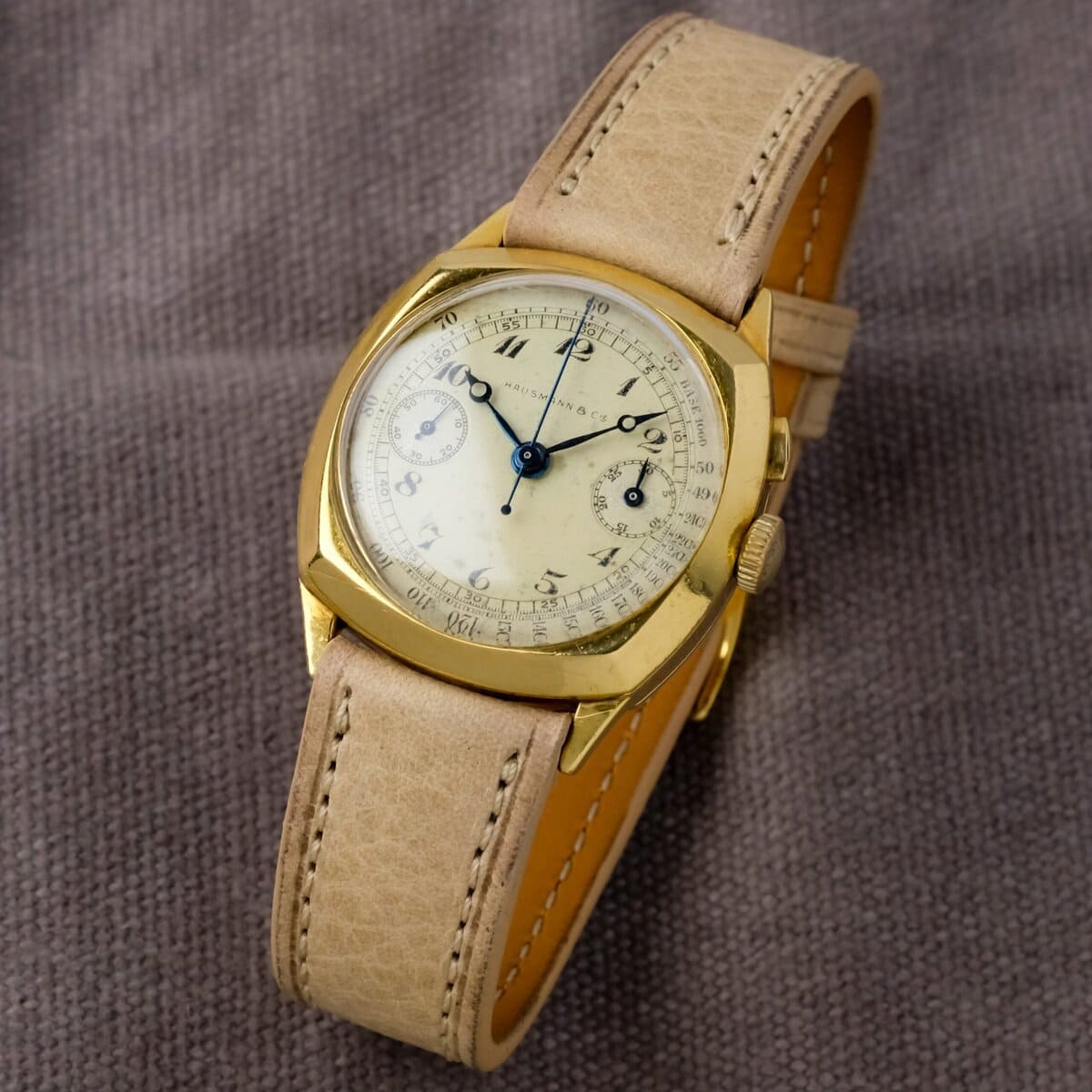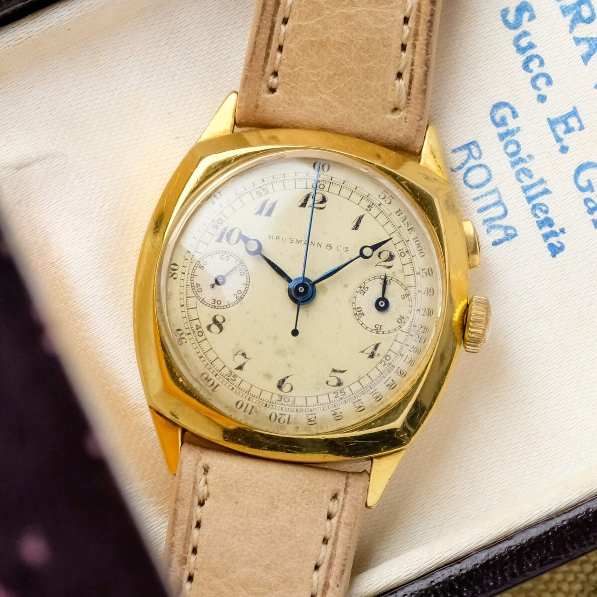 Hausmann & Co. chronograph from the 1930s with a yellow gold cushion case and hand wound Landeron 13 movement. The case shows well preserved lines and surface wear consistent with the age of the watch, giving it an attractive and authentic vintage character. The dial layout reflects the design language of the period, and the chronograph functions operate as expected for a Landeron based movement. The watch is offered without original papers but includes a period correct box from an Italian jeweler, matching the era of the piece. A well kept and representative example of an early twentieth century chronograph from a respected Roman retailer, featuring a desirable cushion case and an important vintage movement.