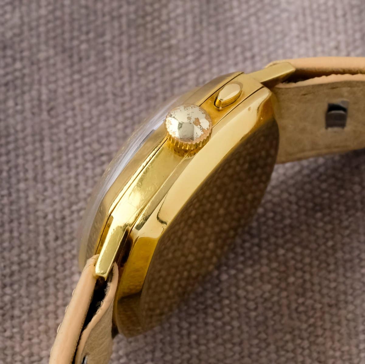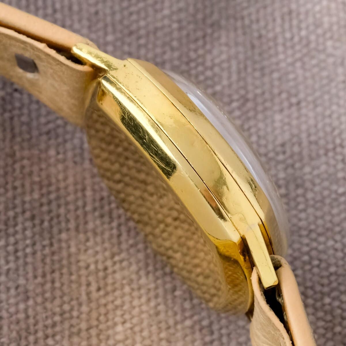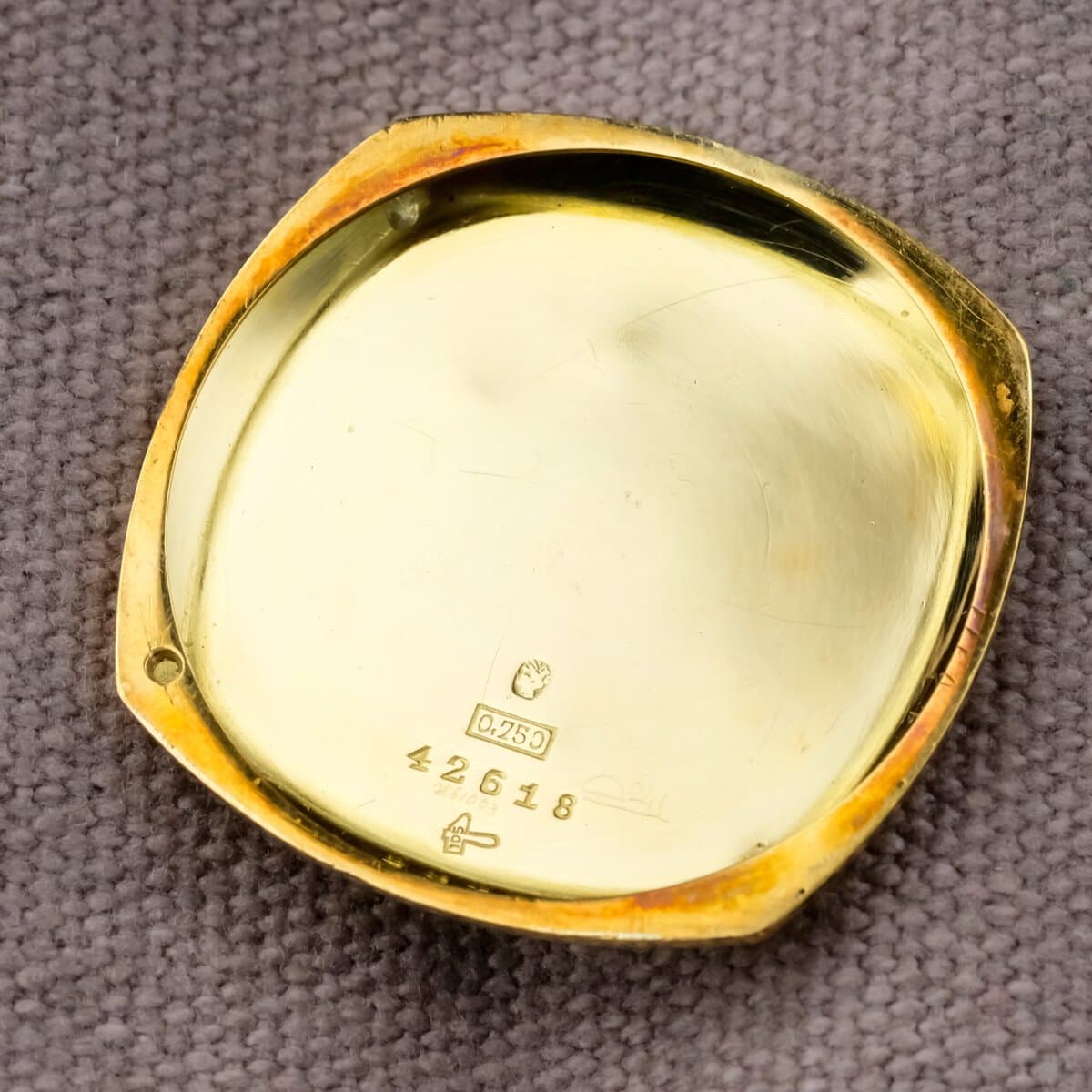 Hausmann & Co. chronograph from the 1930s with a yellow gold cushion case and hand wound Landeron 13 movement. The case shows well preserved lines and surface wear consistent with the age of the watch, giving it an attractive and authentic vintage character. The dial layout reflects the design language of the period, and the chronograph functions operate as expected for a Landeron based movement. The watch is offered without original papers but includes a period correct box from an Italian jeweler, matching the era of the piece. A well kept and representative example of an early twentieth century chronograph from a respected Roman retailer, featuring a desirable cushion case and an important vintage movement.