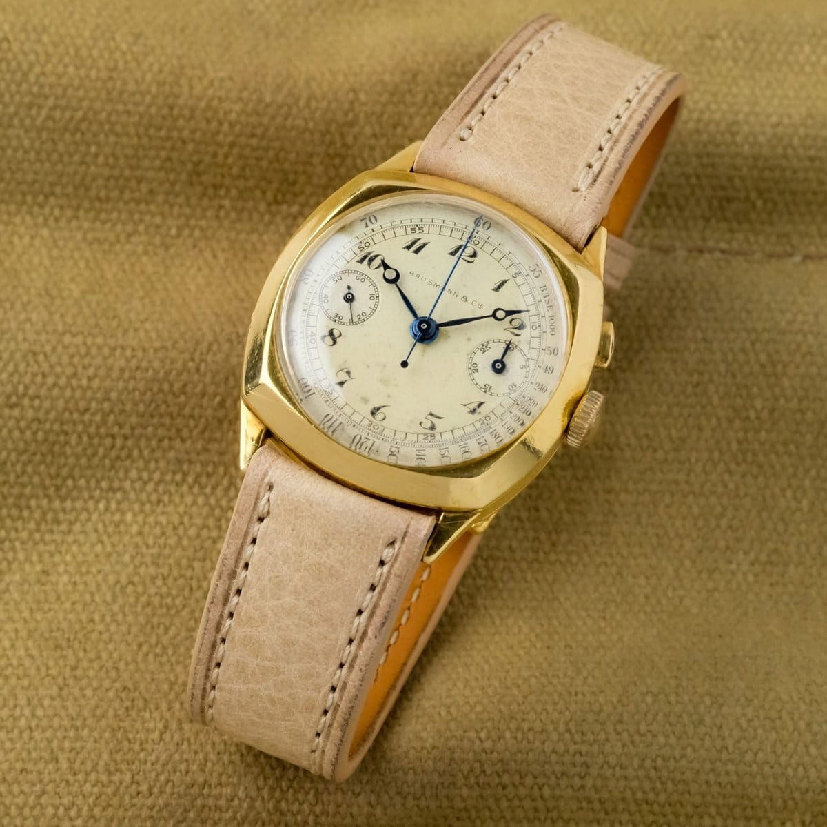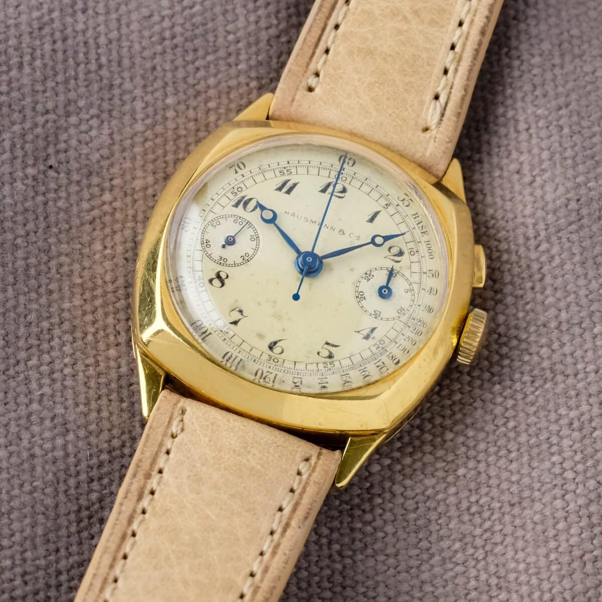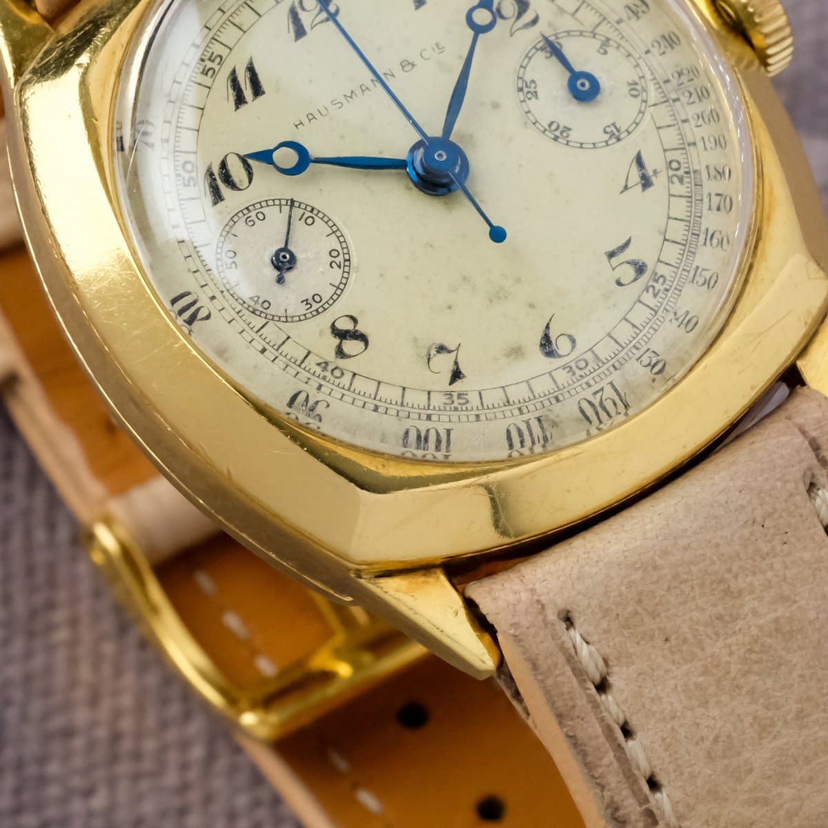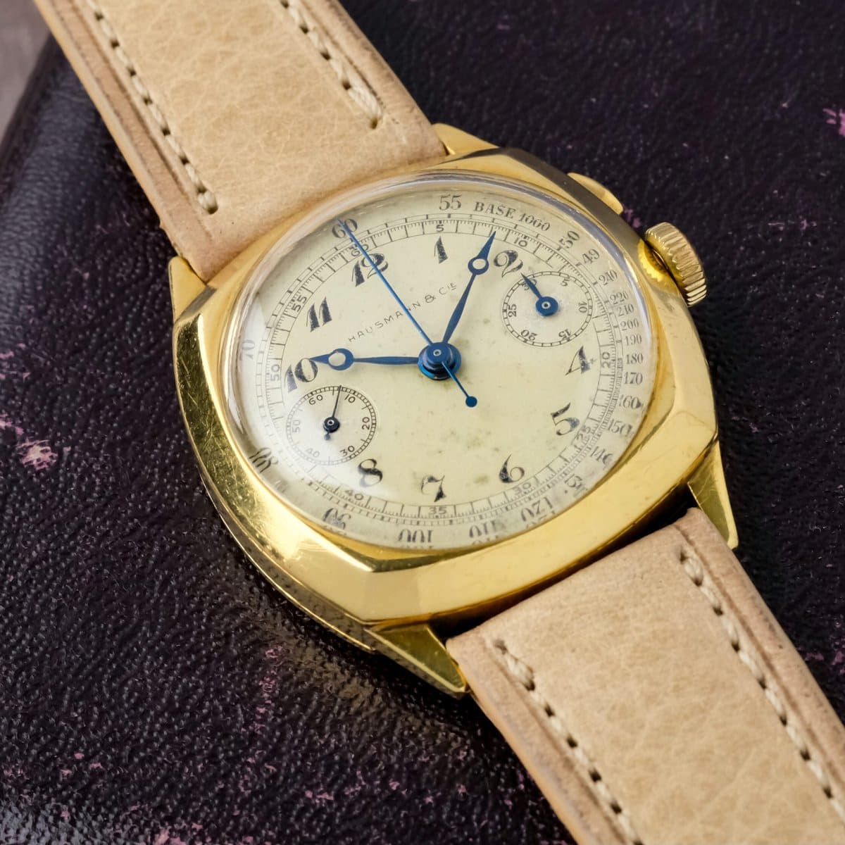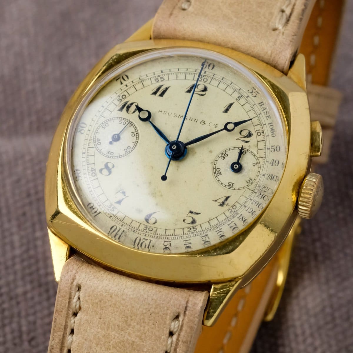 Hausmann & Co. chronograph from the 1930s with a yellow gold cushion case and hand wound Landeron 13 movement. The case shows well preserved lines and surface wear consistent with the age of the watch, giving it an attractive and authentic vintage character.