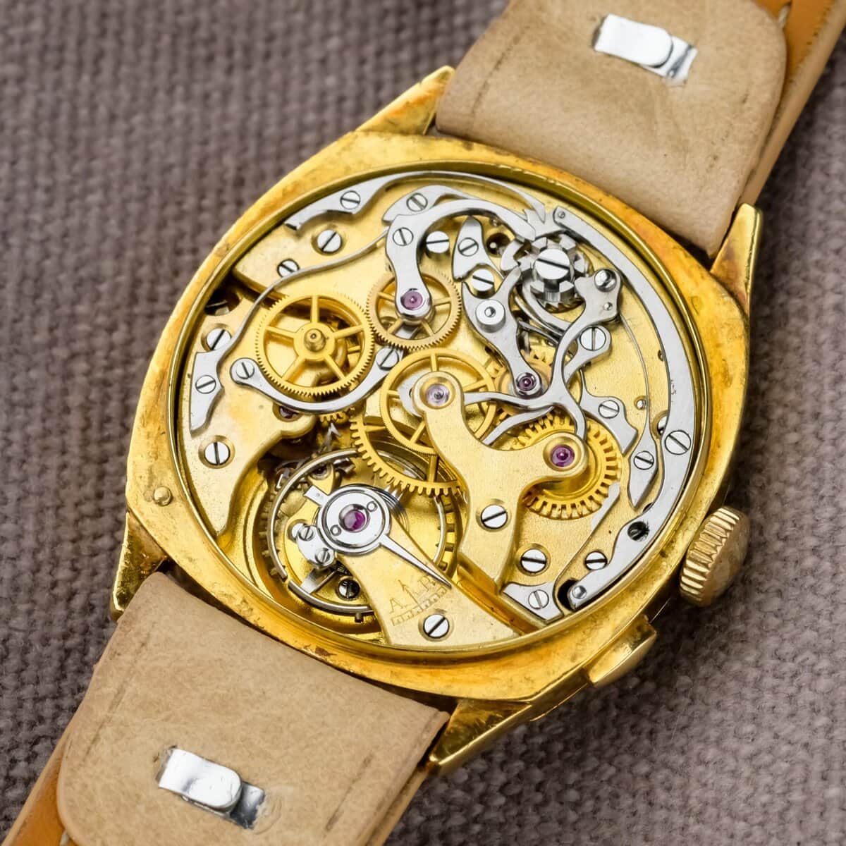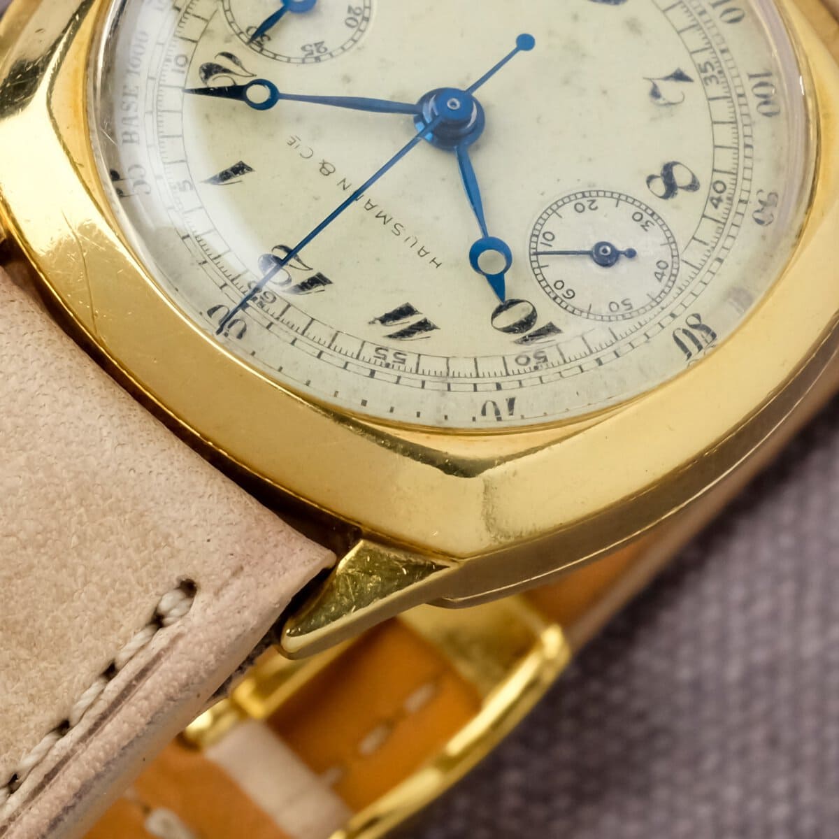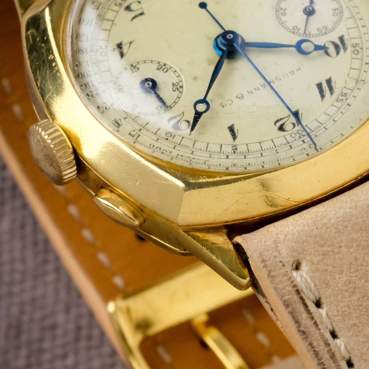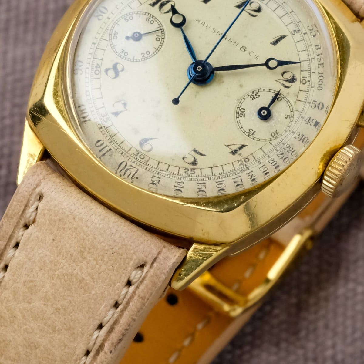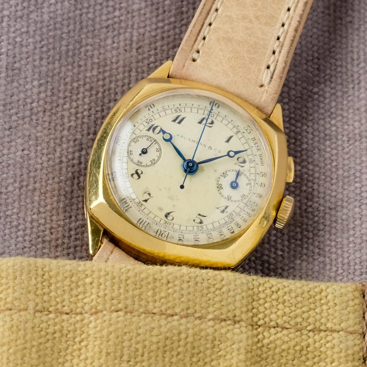 Hausmann & Co. chronograph from the 1930s with a yellow gold cushion case and hand wound Landeron 13 movement. The case shows well preserved lines and surface wear consistent with the age of the watch, giving it an attractive and authentic vintage character.