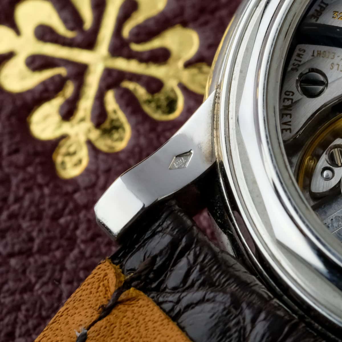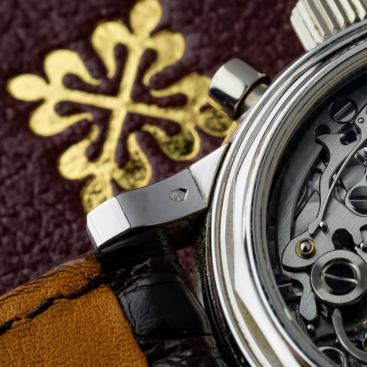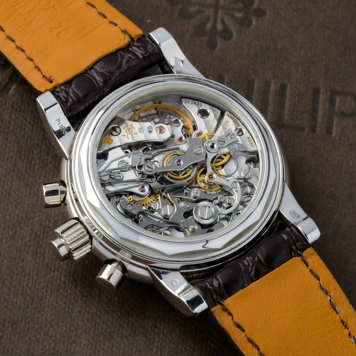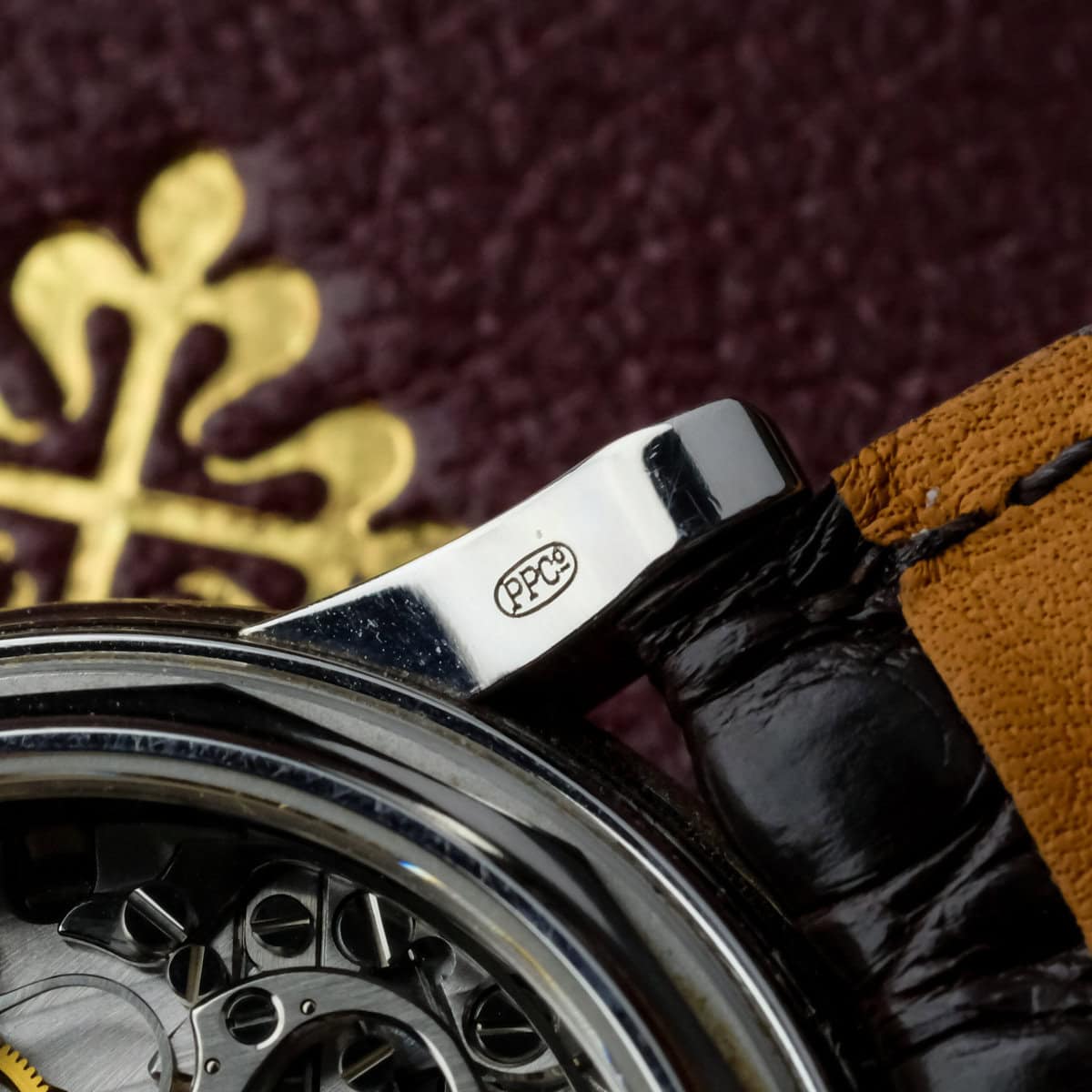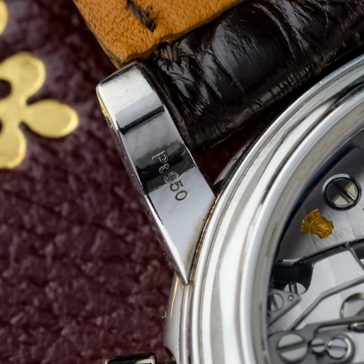 The platinum case is distinguished by the signature oversized crown, a defining characteristic of the 5004, enhancing usability for the highly complex movement. The watch presents in very good overall condition, with well preserved case surfaces and a strong, crisp appearance.