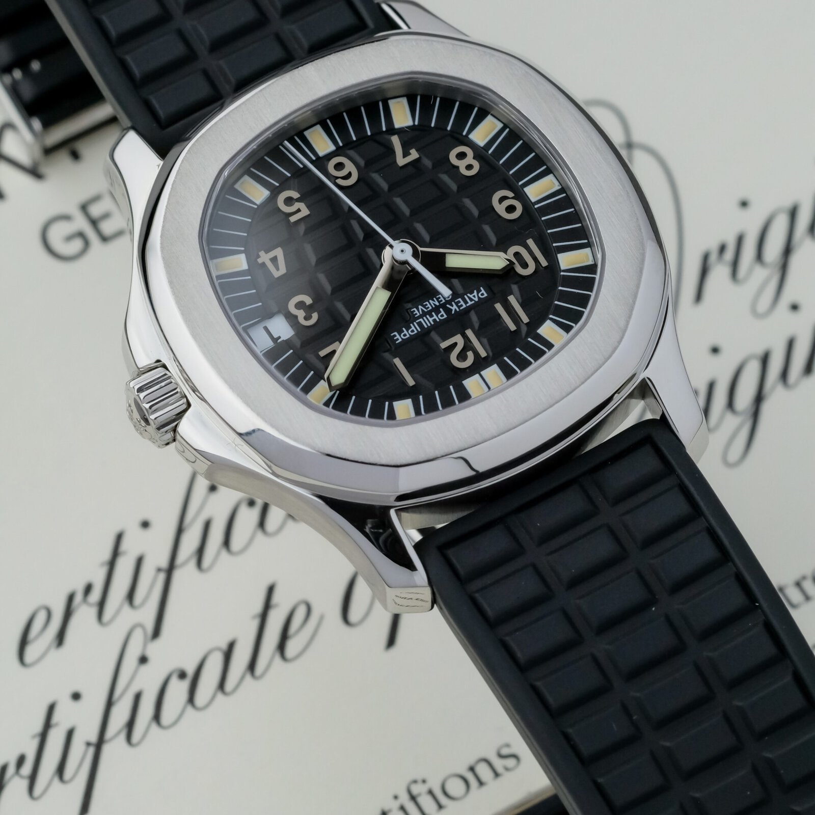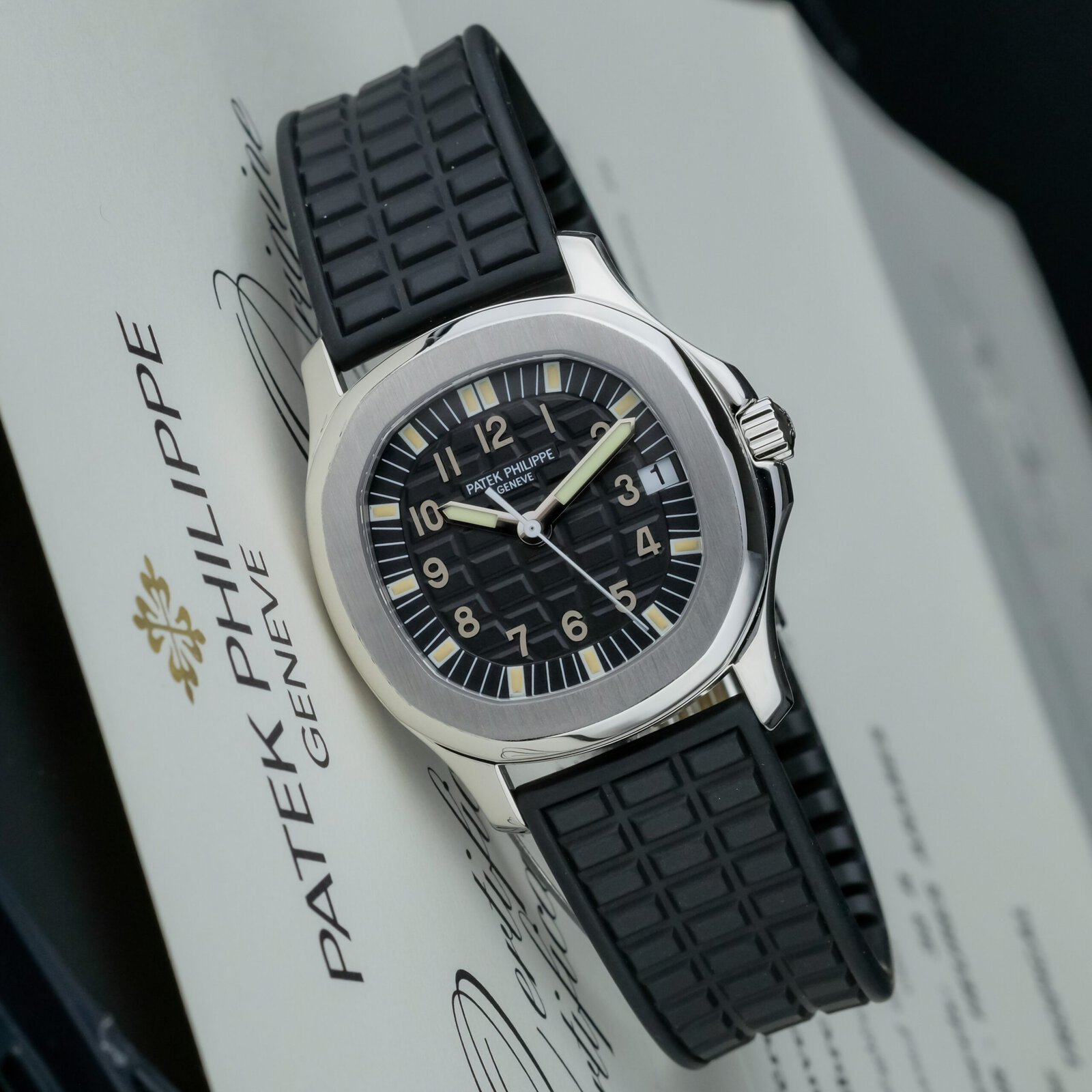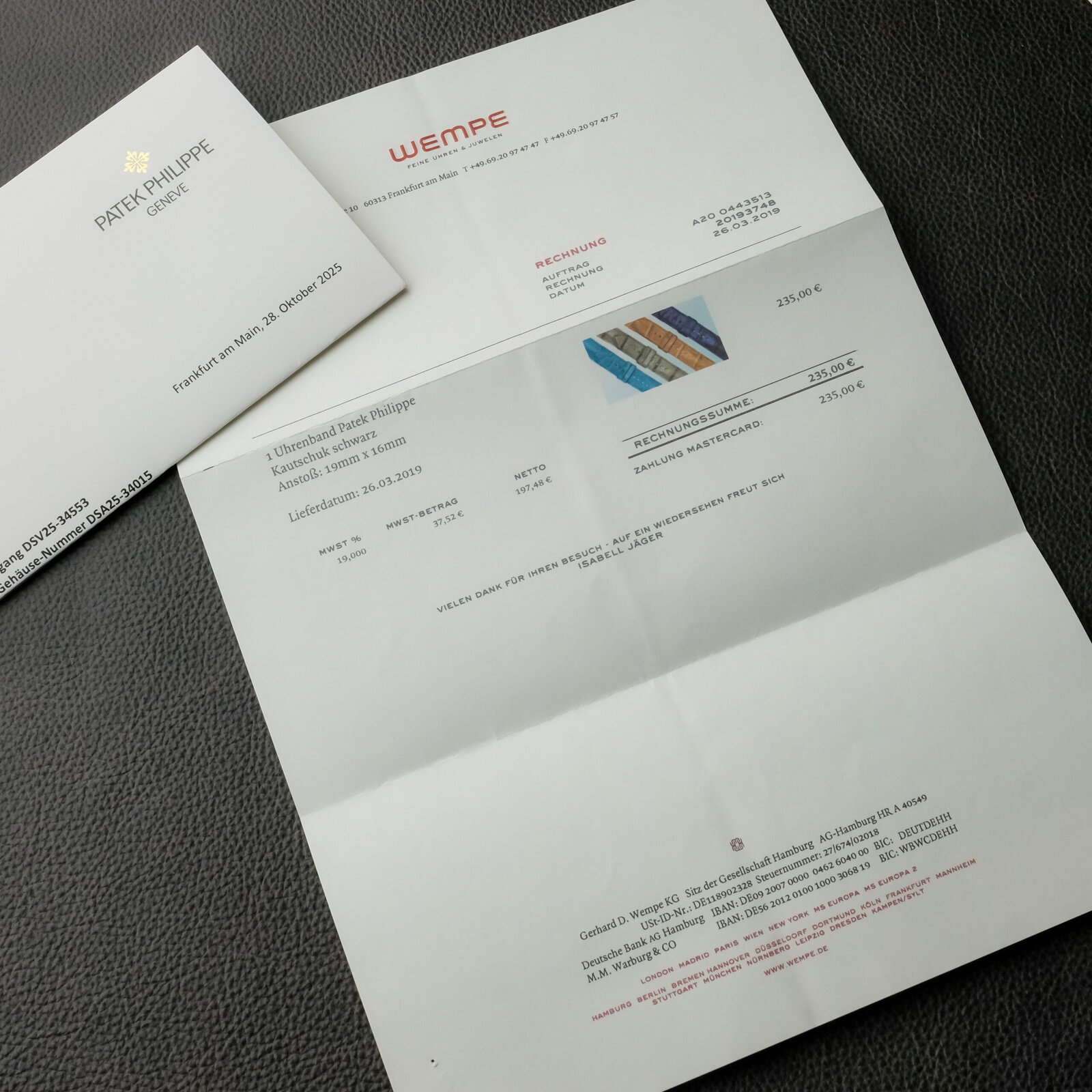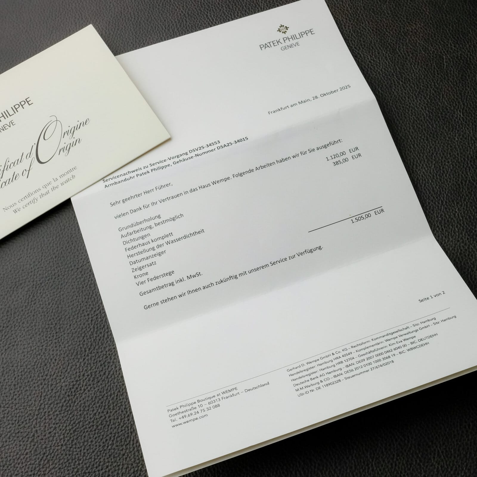 The black dial is clean and well preserved with excellent legibility. The watch has received a Patek Philippe service in October 2025 and has not been worn since, presenting in perfect condition. It is fitted with a black rubber strap and a stainless steel Patek Philippe double folding clasp. Additional service receipts as well as the invoice for the strap are included.