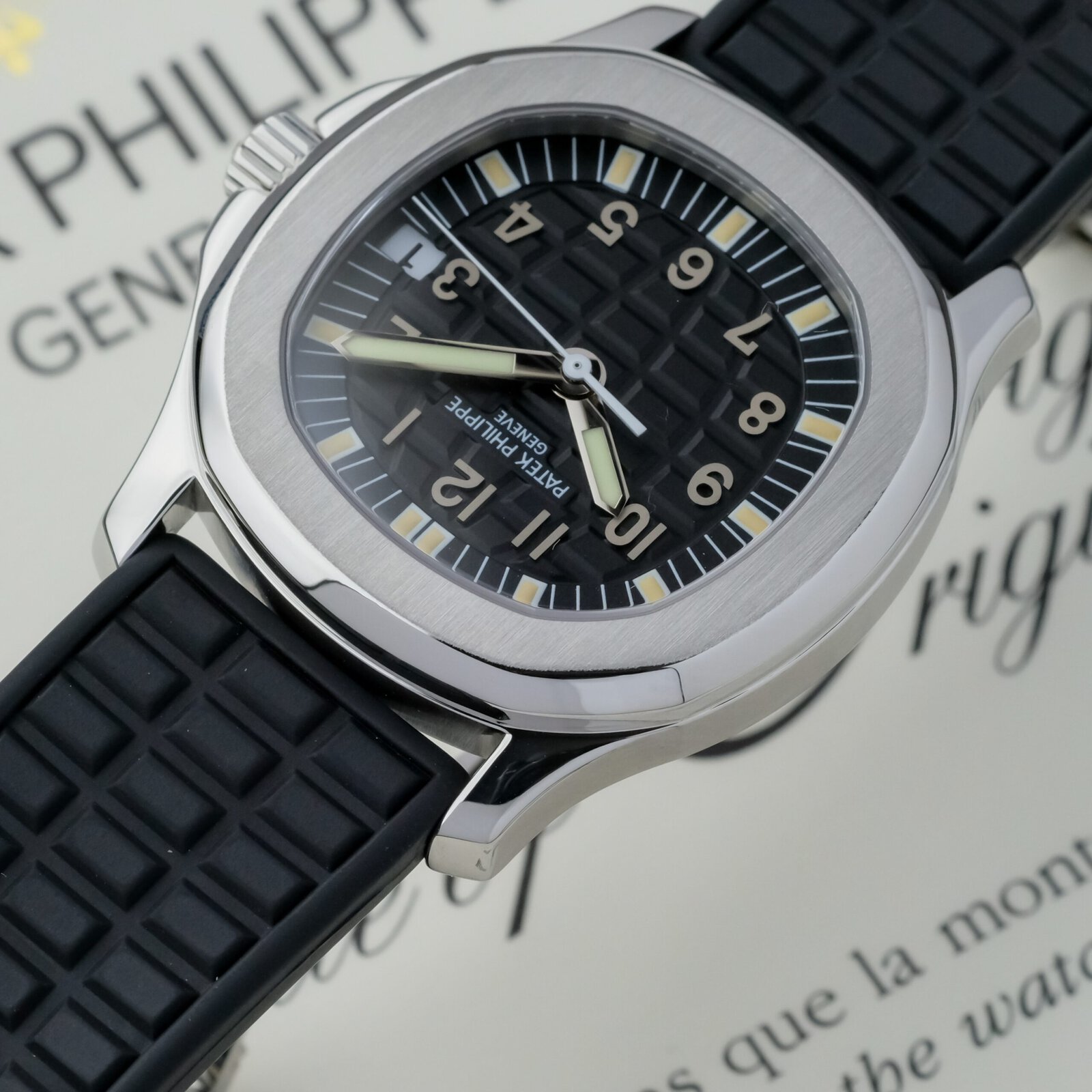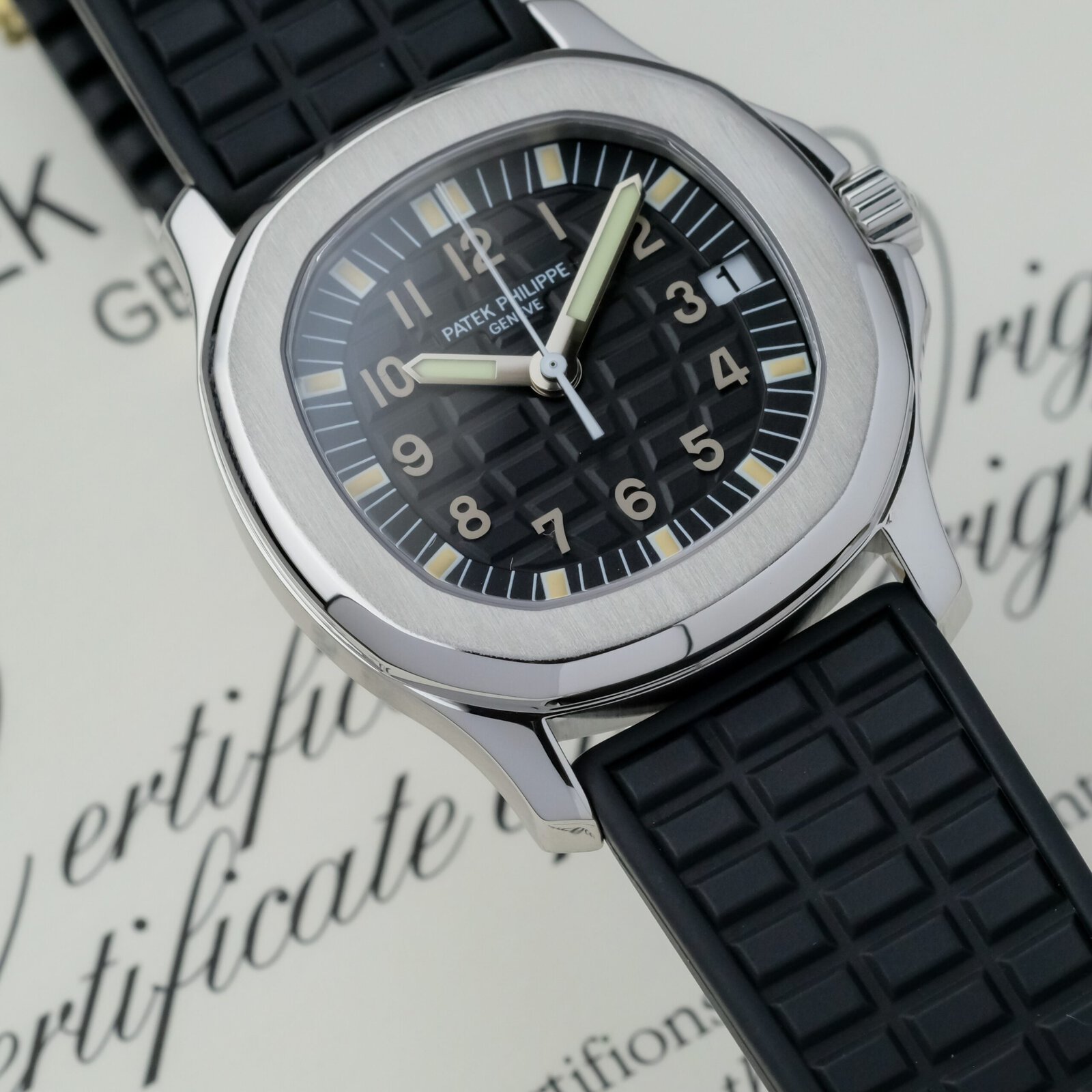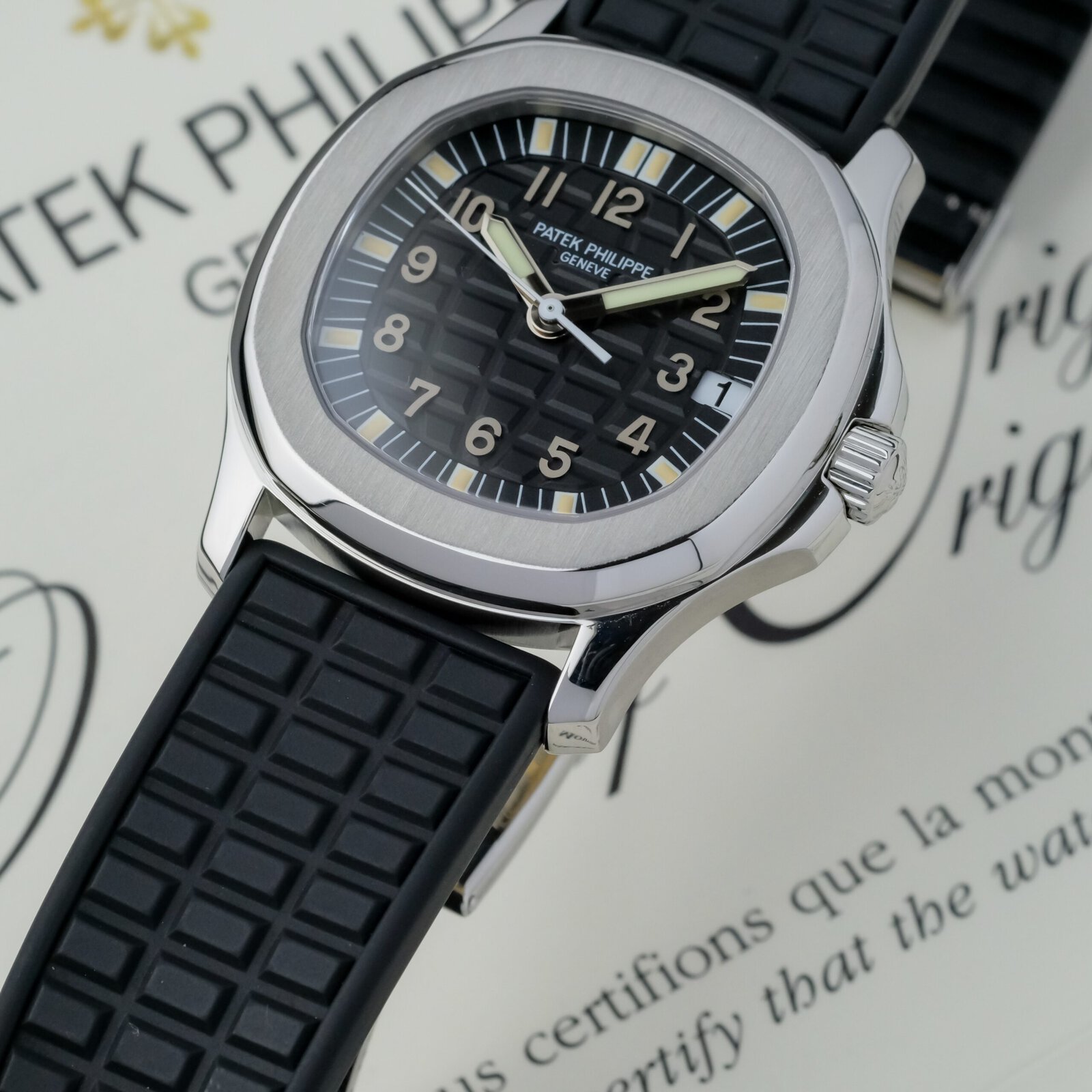 The black dial is clean and well preserved with excellent legibility. The watch has received a Patek Philippe service in October 2025 and has not been worn since, presenting in perfect condition. It is fitted with a black rubber strap and a stainless steel Patek Philippe double folding clasp. Additional service receipts as well as the invoice for the strap are included.
