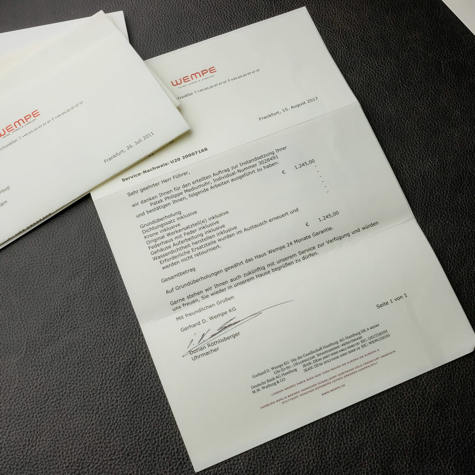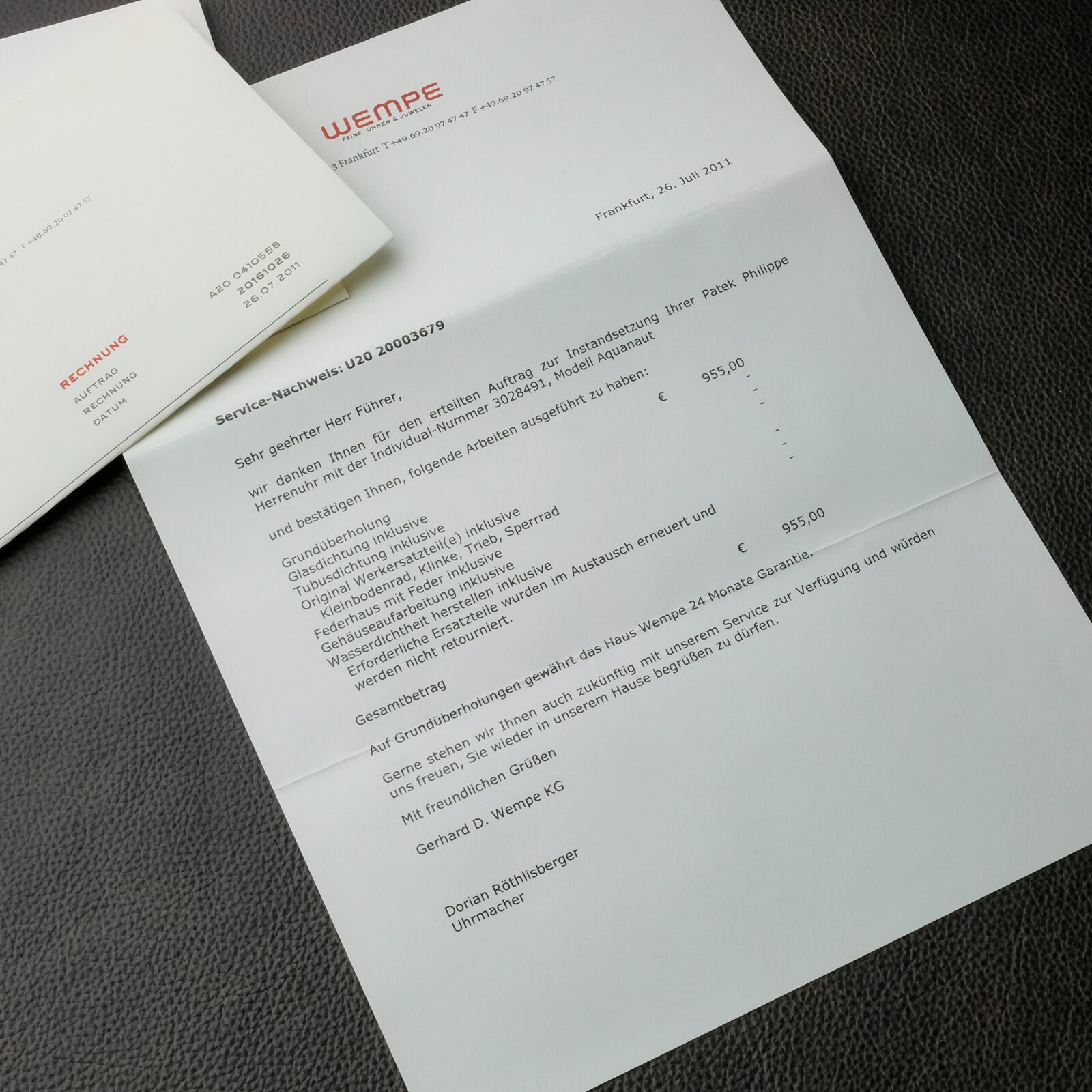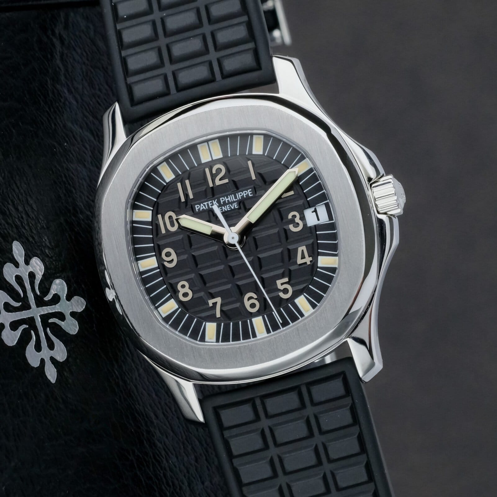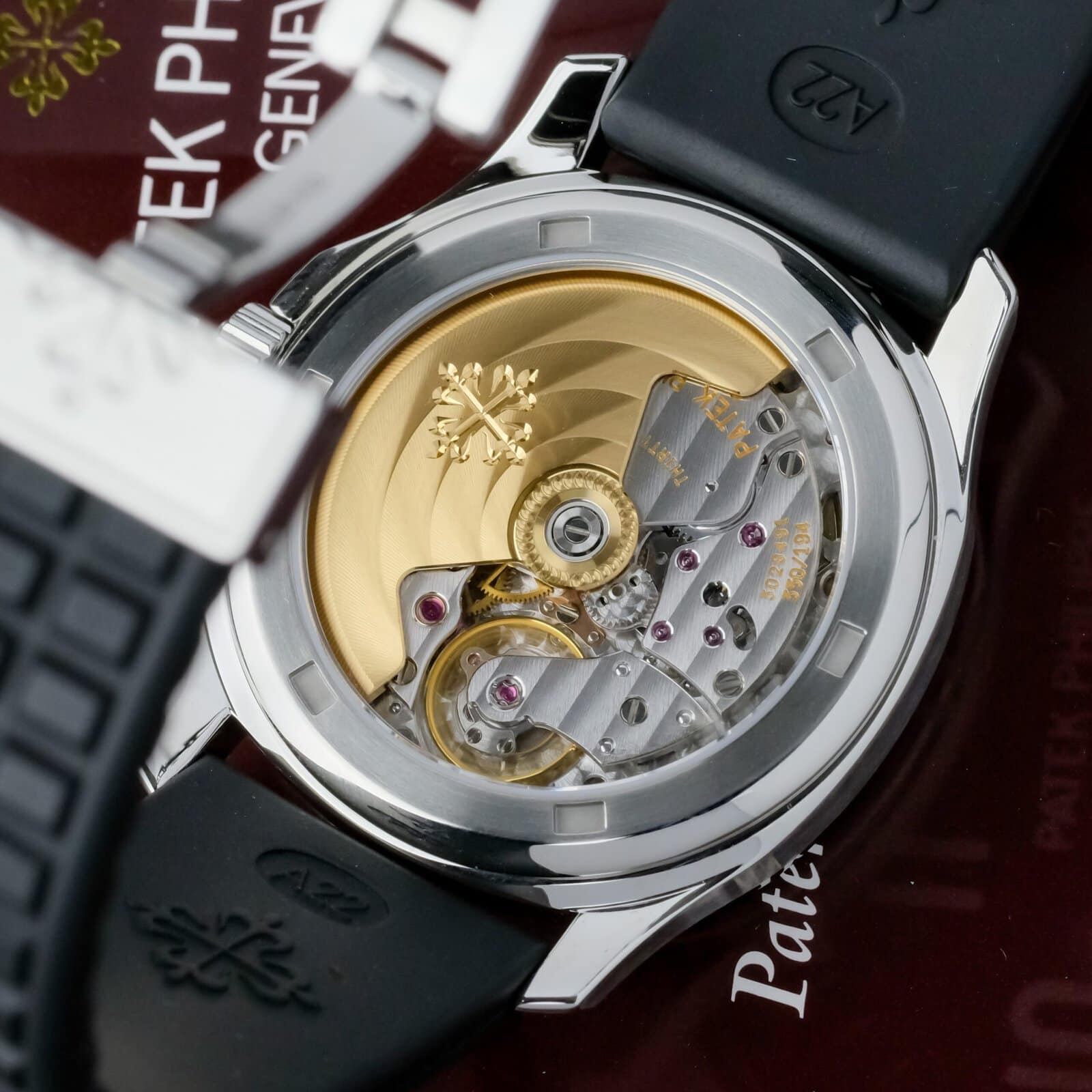 The black dial is clean and well preserved with excellent legibility. The watch has received a Patek Philippe service in October 2025 and has not been worn since, presenting in perfect condition. It is fitted with a black rubber strap and a stainless steel Patek Philippe double folding clasp. Additional service receipts as well as the invoice for the strap are included.