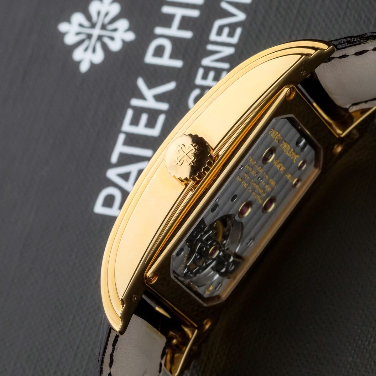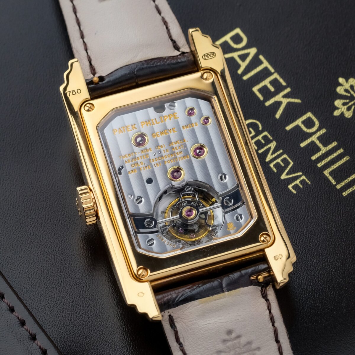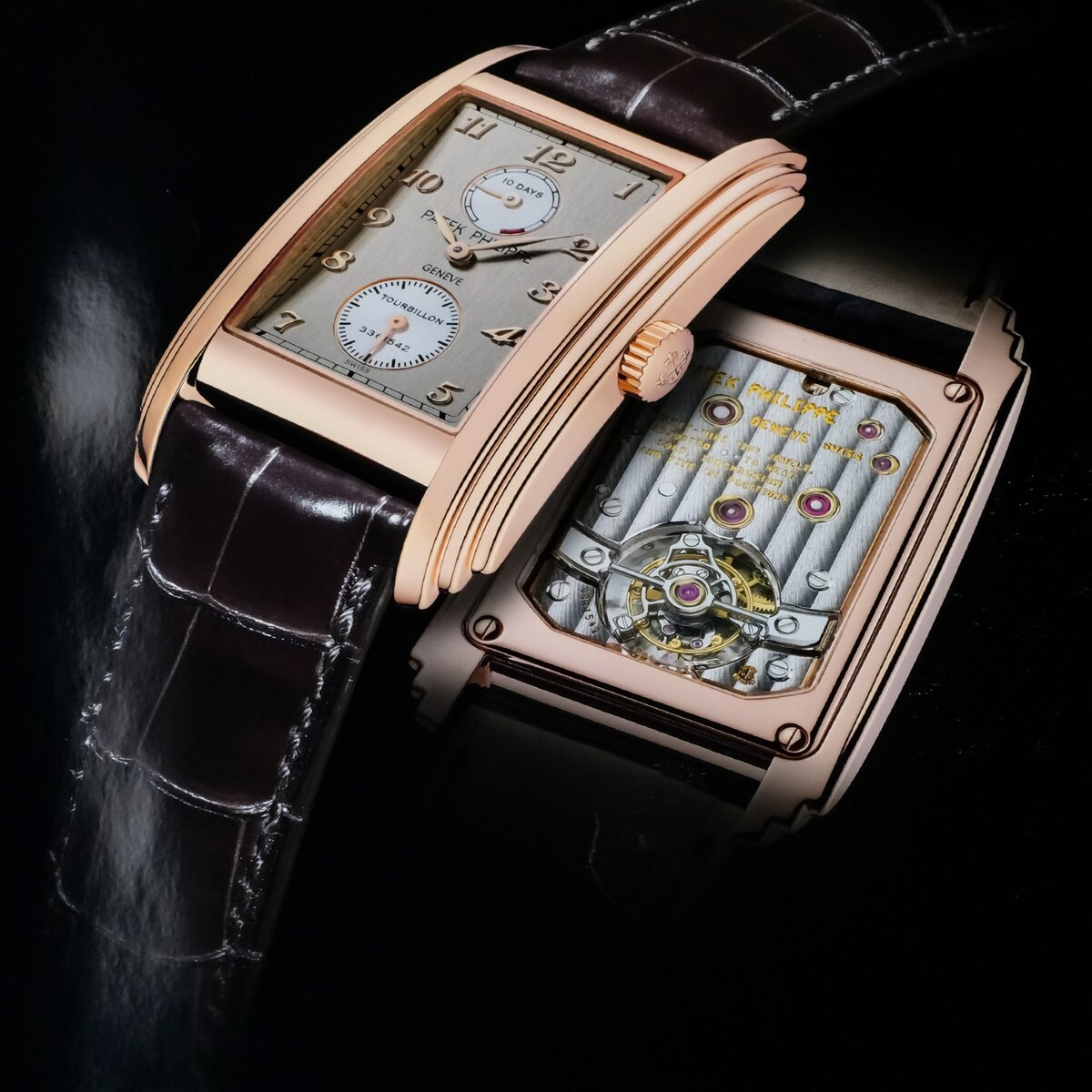 Patek Philippe Grand Complication reference 5101R 001 in 18k rose gold, measuring 29.6 by 51.7 millimeters and powered by a hand wound movement with a ten day power reserve. The long rectangular case follows the characteristic Art Deco inspired design of the reference and features a sapphire display back showcasing the tourbillon on the reverse of the movement.