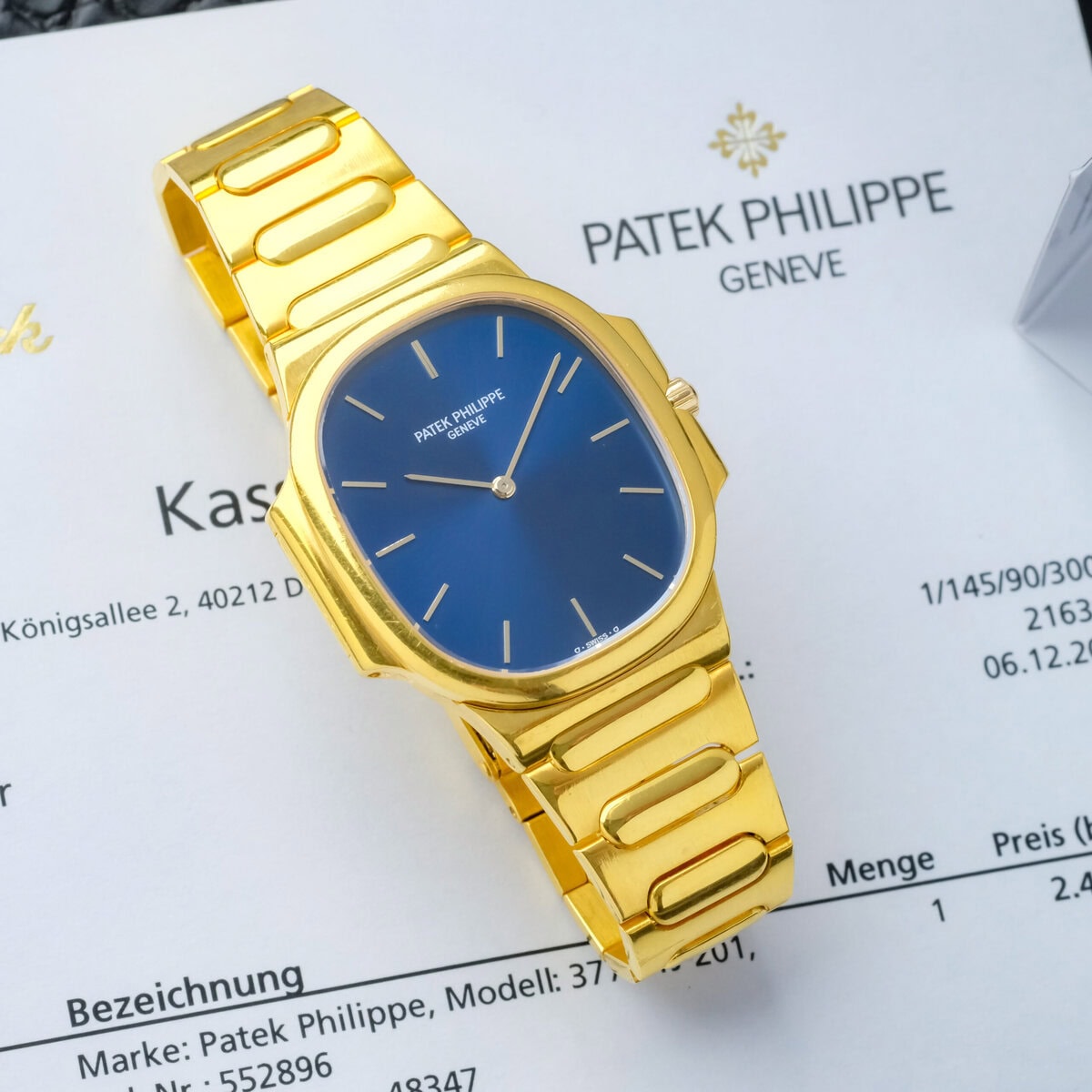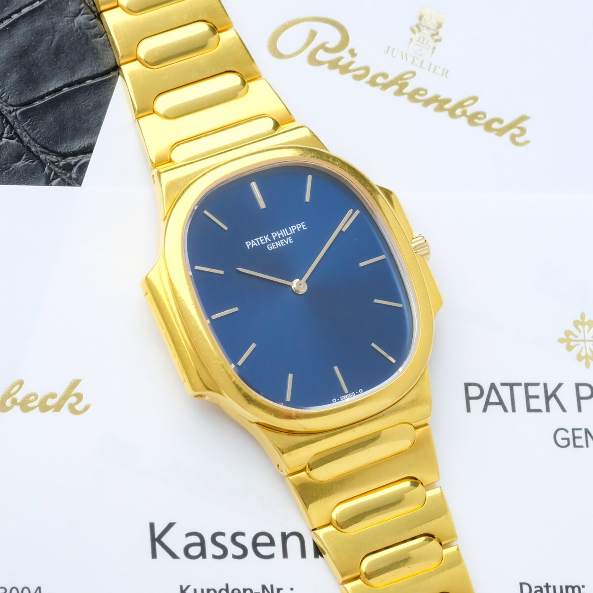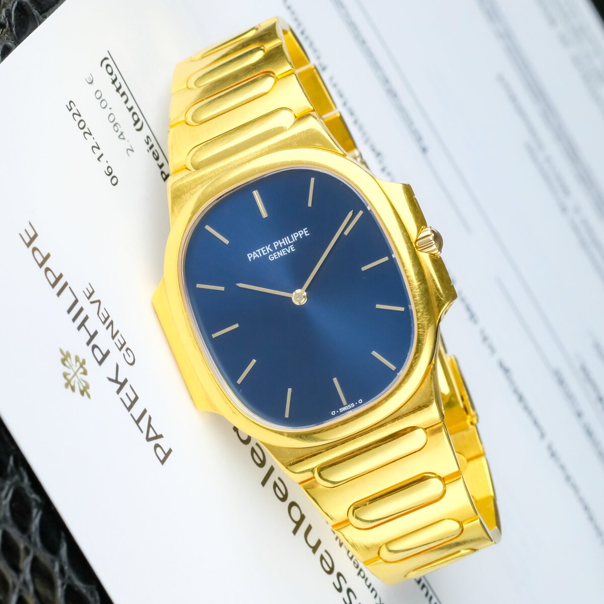 Patek Philippe Nautellipse reference 3770 in solid 18k yellow gold, measuring 35.5 by 39 millimeters and powered by a quartz movement. Produced in the 1980s, this reference represents a very rare crossover between two of Patek Philippe’s most important design lines, combining the integrated sports character of the Nautilus with the refined elliptical case language of the Golden Ellipse.