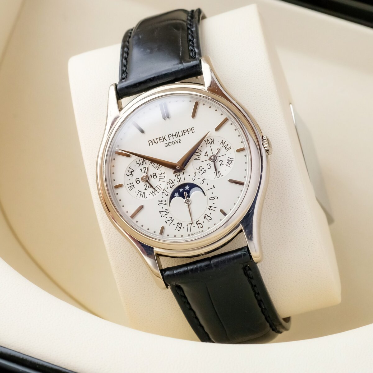 Patek Philippe Perpetual Calendar reference 5140G in 18k white gold, measuring 37 millimeters and powered by the ultra thin automatic micro rotor caliber 240 Q. This reference is known for its elegant proportions and the classical perpetual calendar layout that has become a hallmark of Patek Philippe’s grand complications.