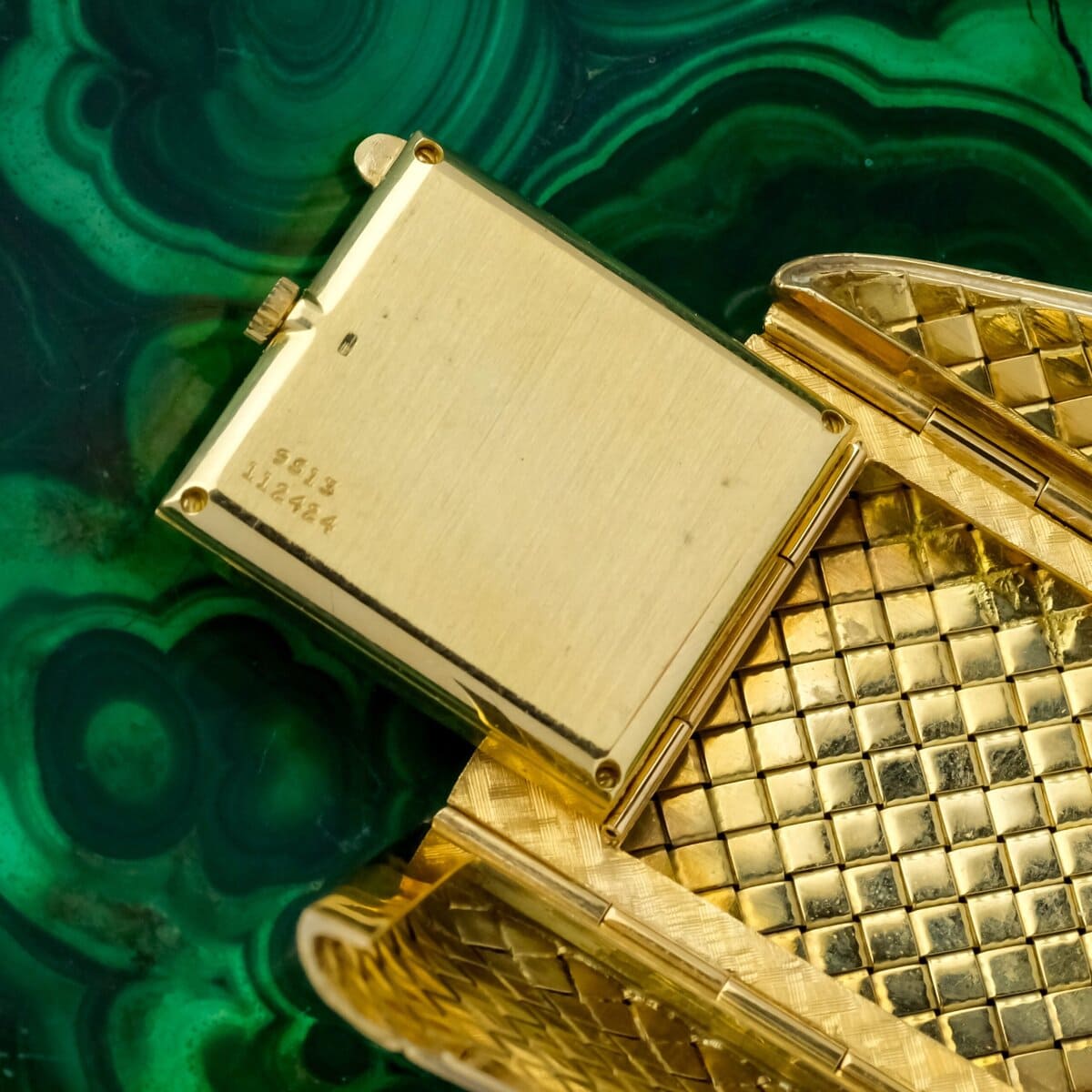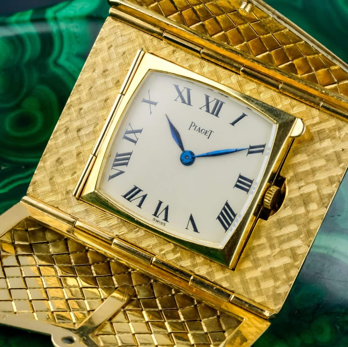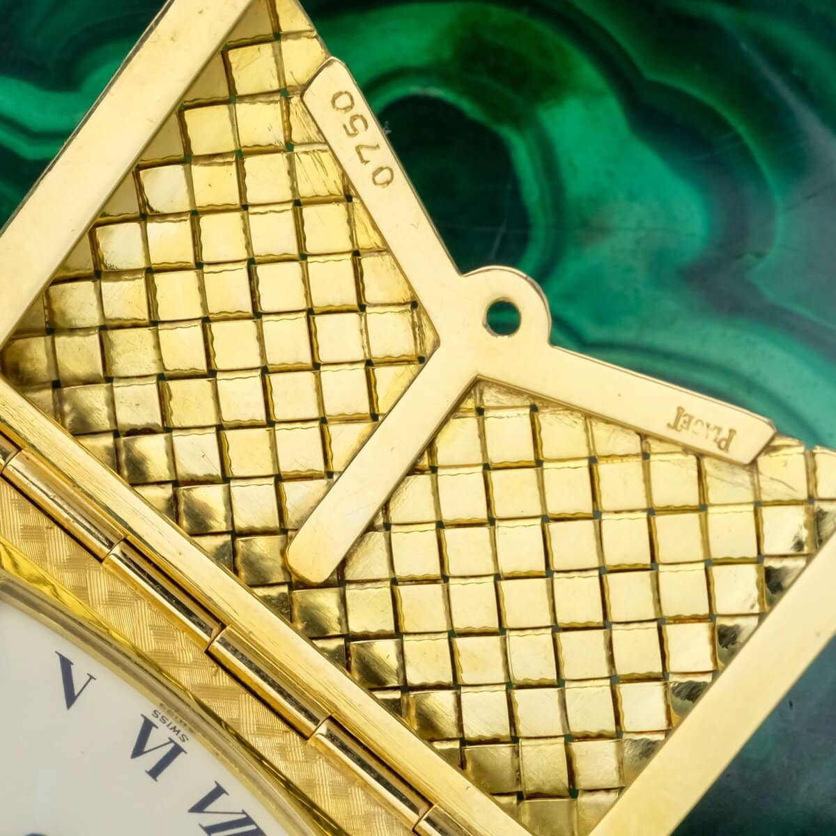 Piaget pocket watch ref. 9513 in 18k yellow gold, designed in the form of a clutch style handbag. The case measures 31 by 42 millimeters and dates to around the 1970s. It features an intricate construction with woven gold strands forming the outer structure, hinged to reveal a matte finished central section that houses the movement. This design showcases Piaget’s mastery of decorative goldwork during this era.