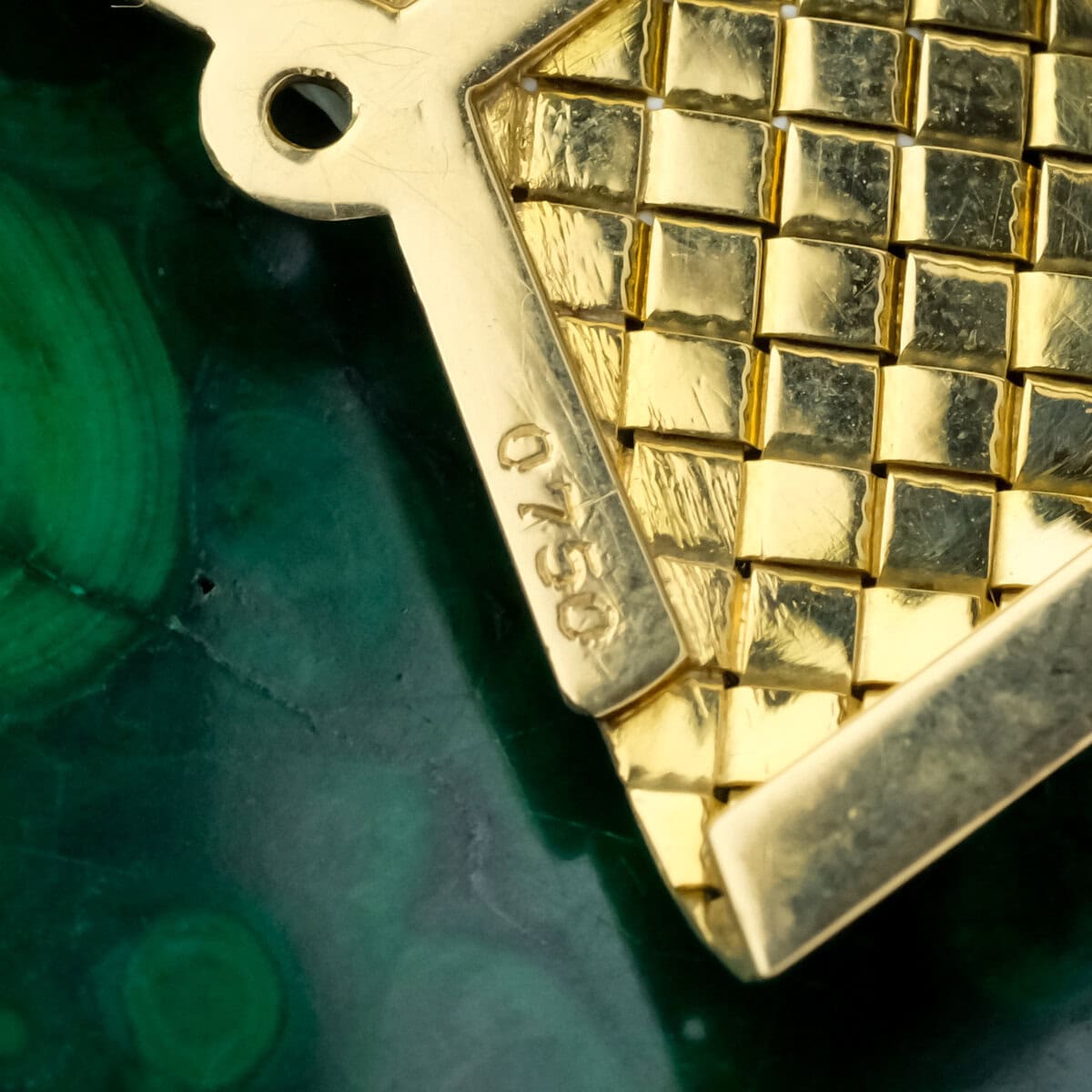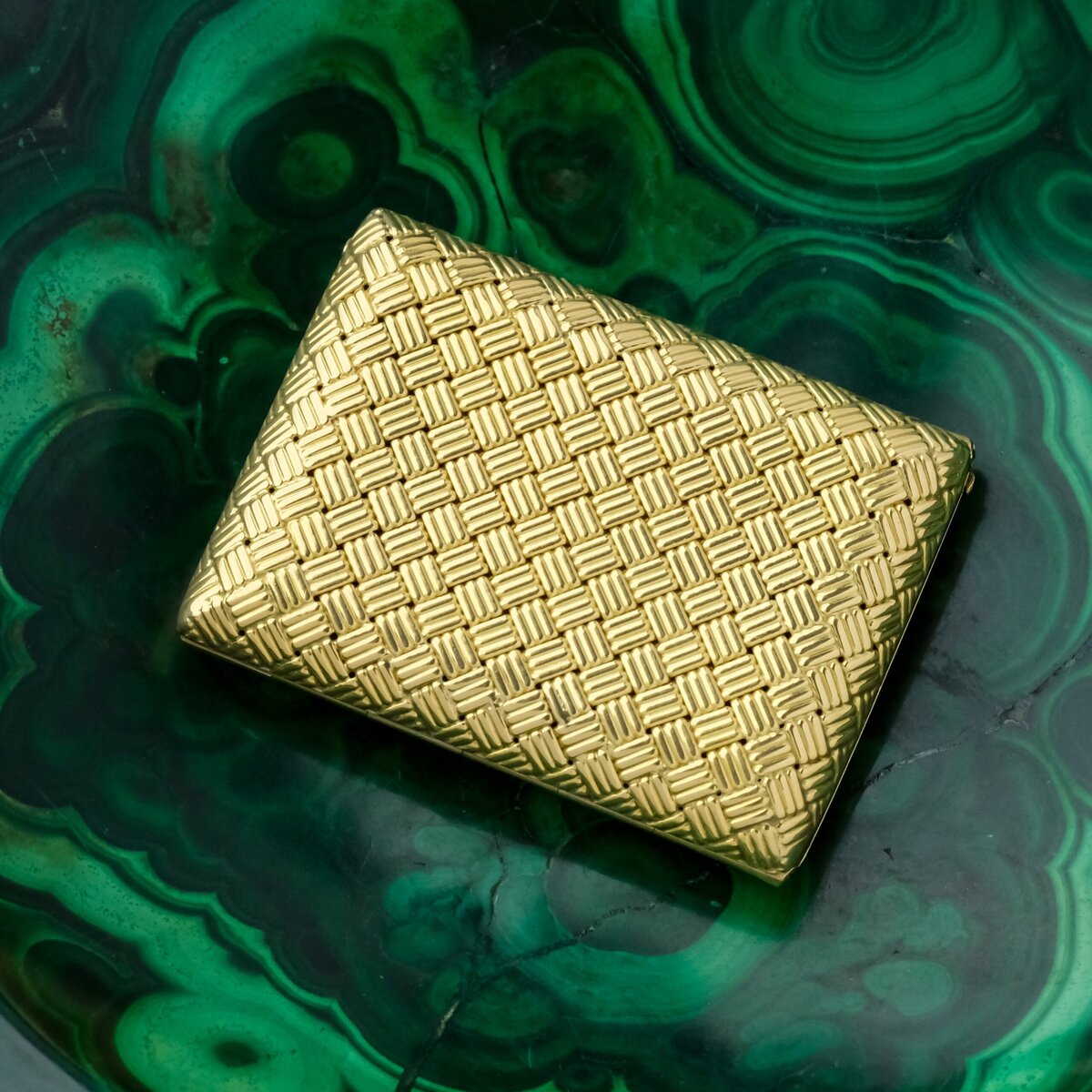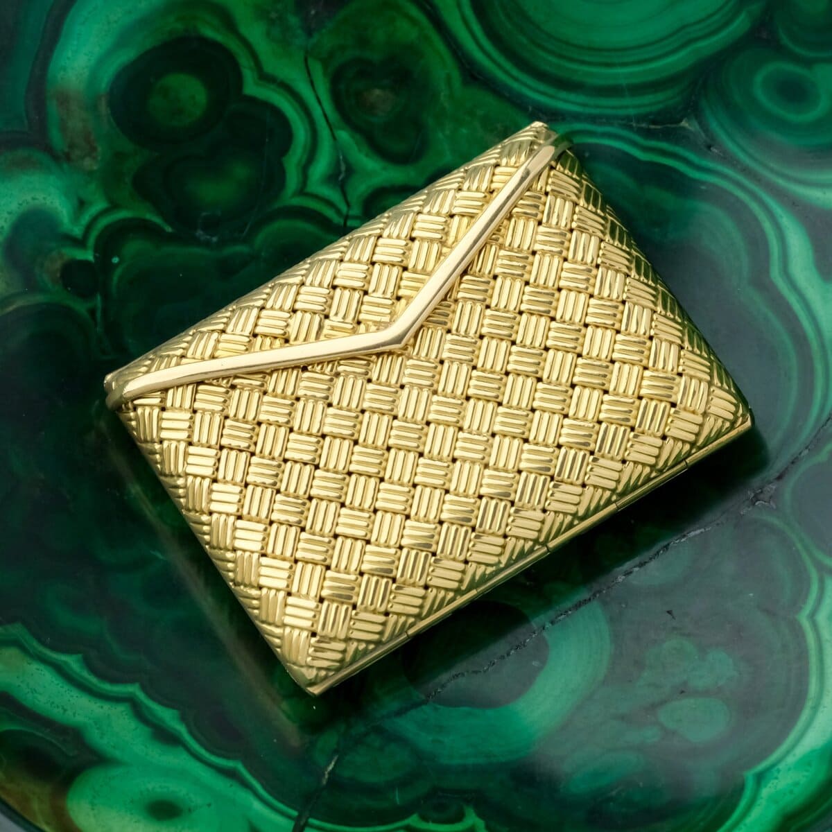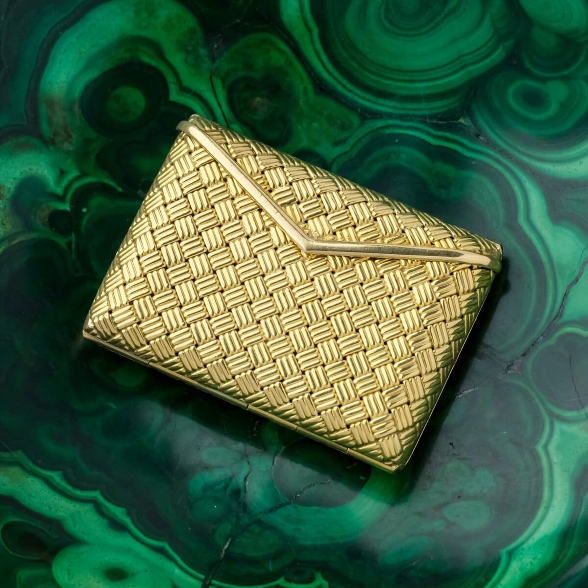 Piaget pocket watch ref. 9513 in 18k yellow gold, designed in the form of a clutch style handbag. The case measures 31 by 42 millimeters and dates to around the 1970s. It features an intricate construction with woven gold strands forming the outer structure, hinged to reveal a matte finished central section that houses the movement. This design showcases Piaget’s mastery of decorative goldwork during this era.