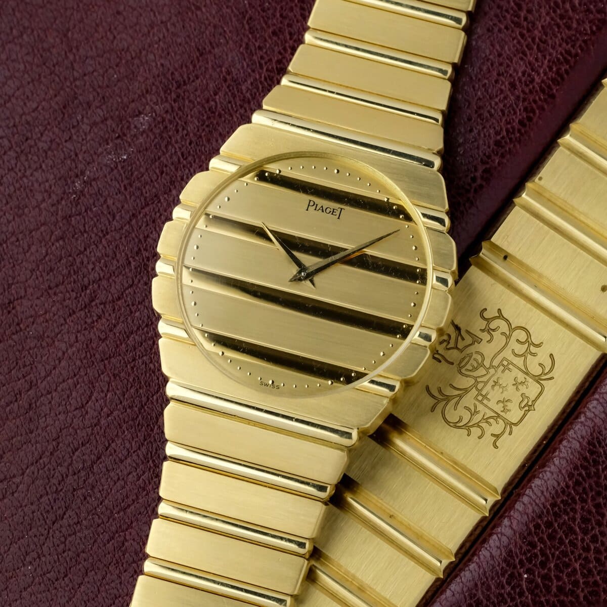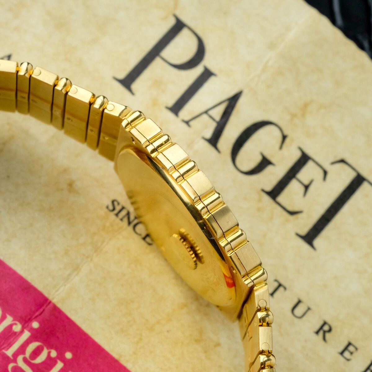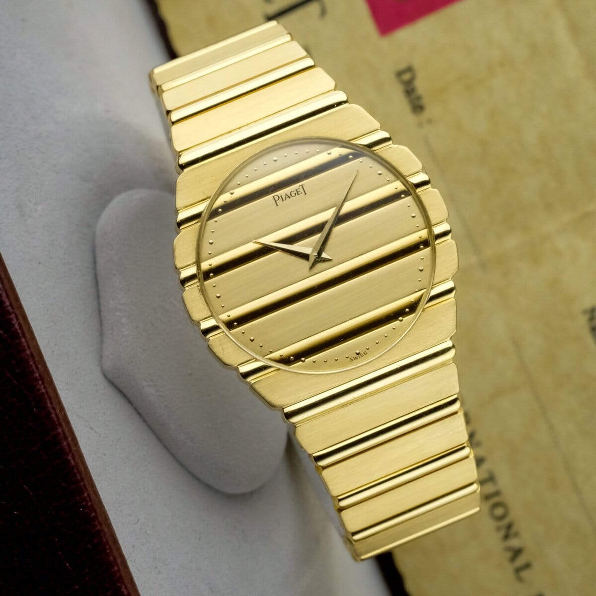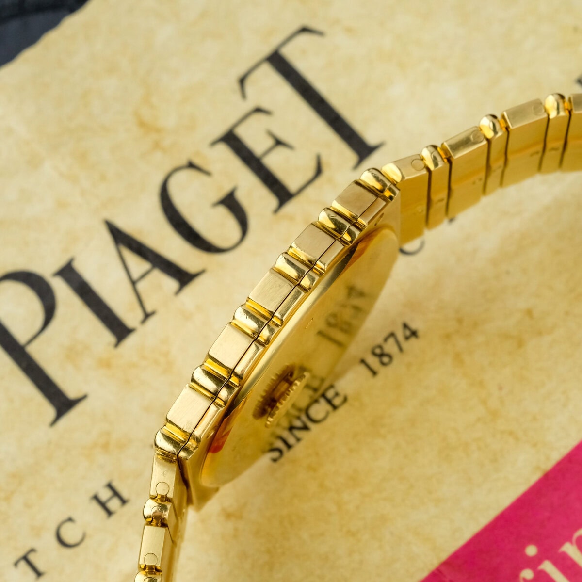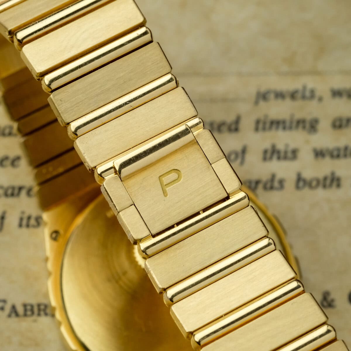 Piaget Polo Jumbo reference 7661 in 18k yellow gold, powered by a quartz movement and fitted with the desirable no quartz dial, giving the watch a cleaner and more traditional appearance. The integrated gold bracelet measures approximately 18.5 centimeters in length, offering a strong and well balanced wrist presence typical of the Jumbo execution.