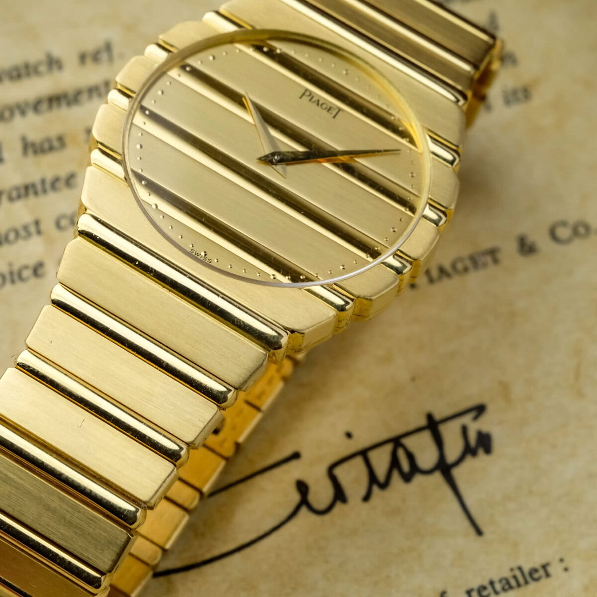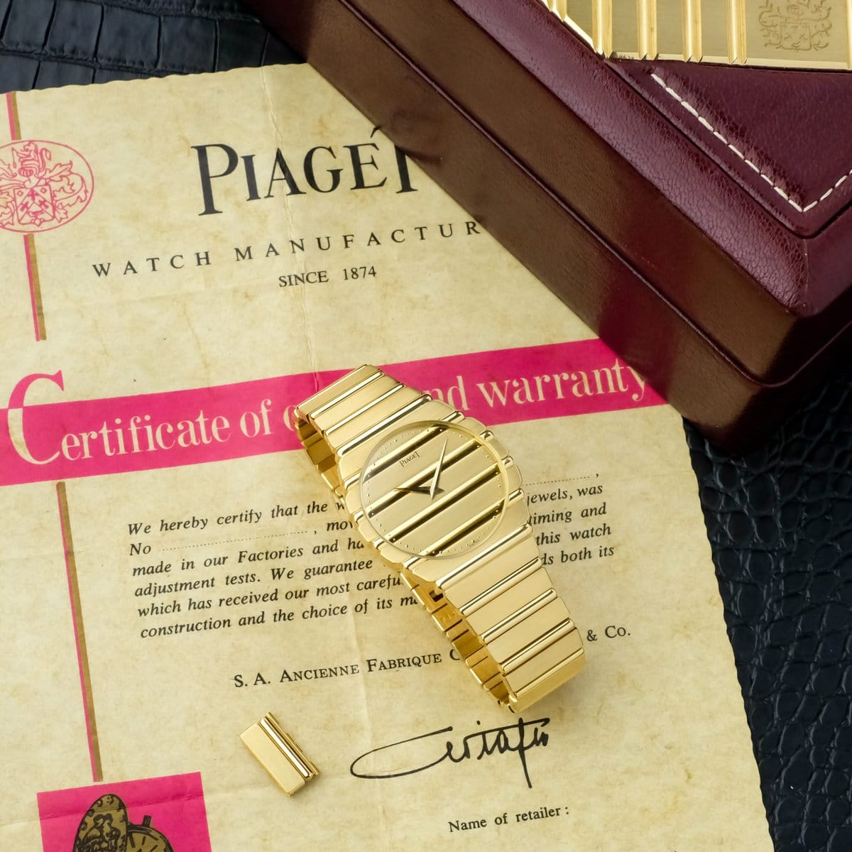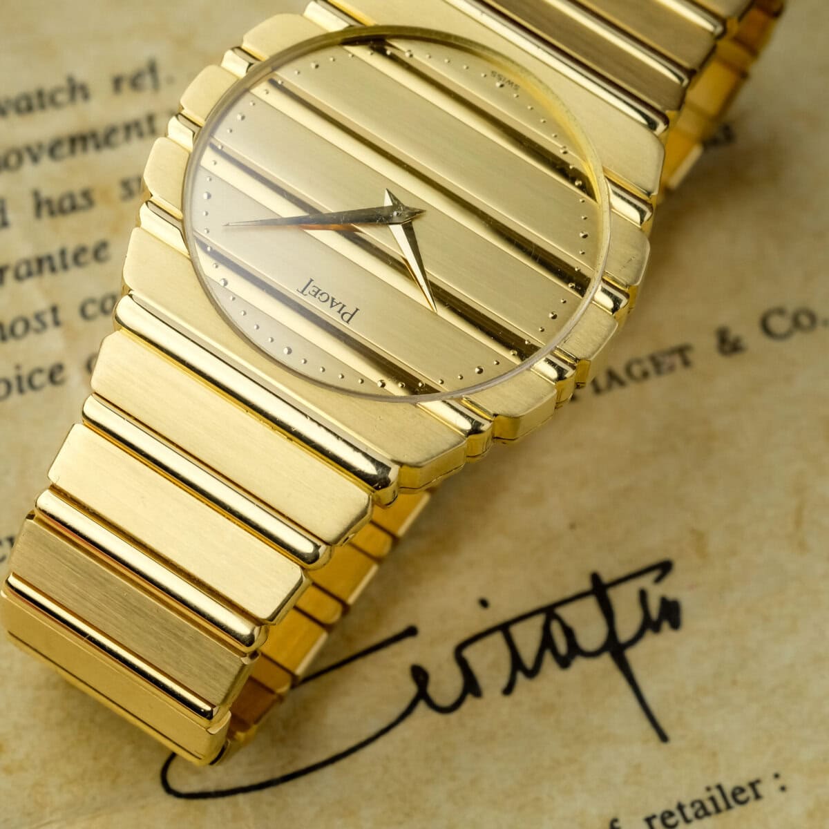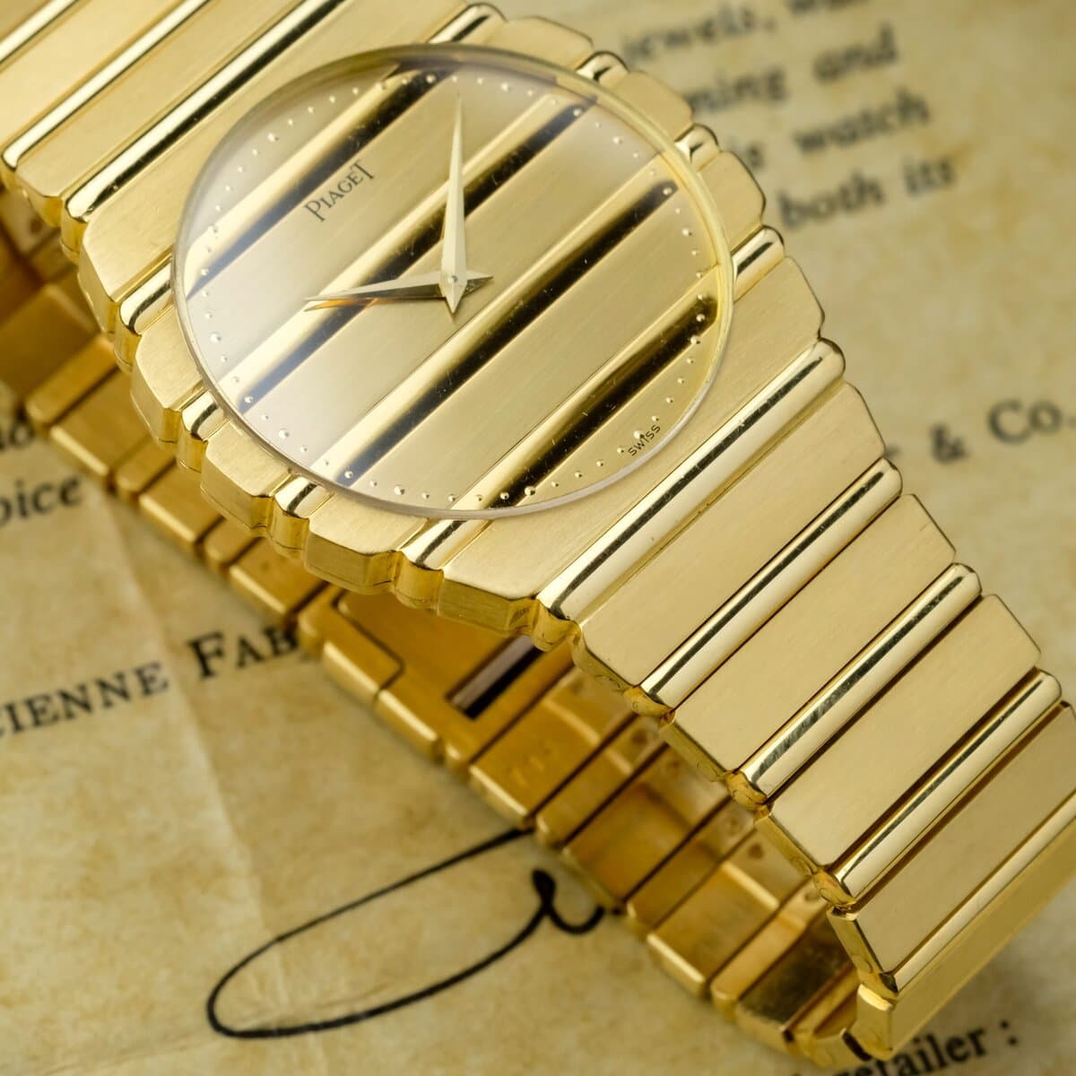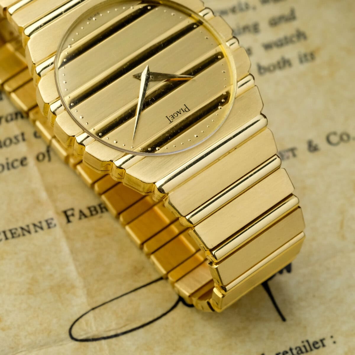 Piaget Polo Jumbo reference 7661 in 18k yellow gold, powered by a quartz movement and fitted with the desirable no quartz dial, giving the watch a cleaner and more traditional appearance. The integrated gold bracelet measures approximately 18.5 centimeters in length, offering a strong and well balanced wrist presence typical of the Jumbo execution.