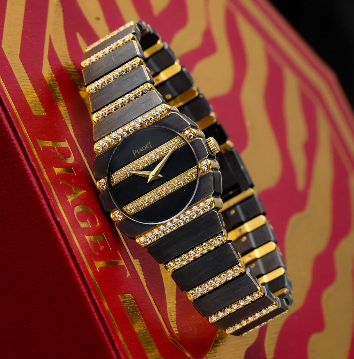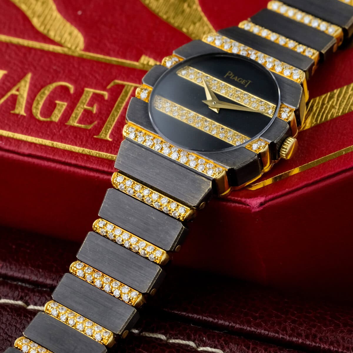 This Piaget Polo Mini PVD reference 861 C 705 is an exceptionally rare and striking interpretation of the maison’s iconic design. Crafted in 18k yellow gold and enhanced with a black PVD coating, the watch measures 23 millimeters and is lavishly set with diamonds across the bracelet, case and dial, creating a dramatic contrast between the dark finish and the brilliance of the stones.