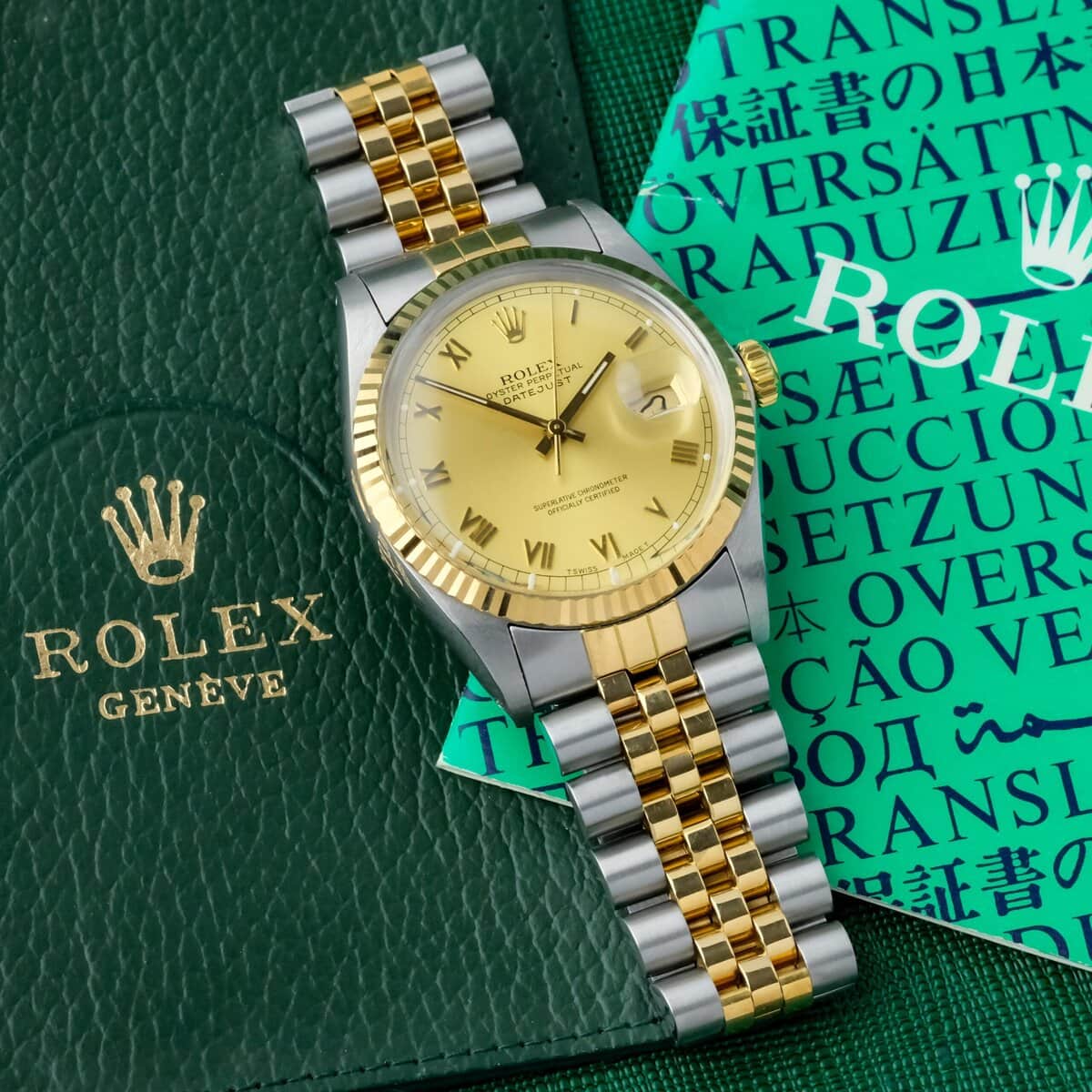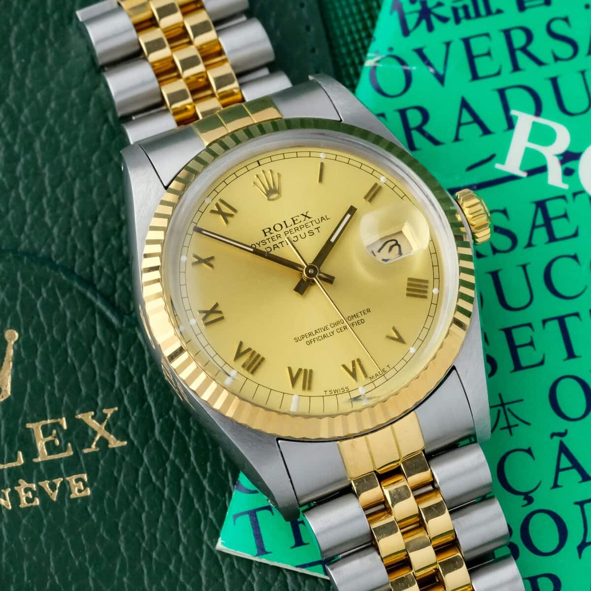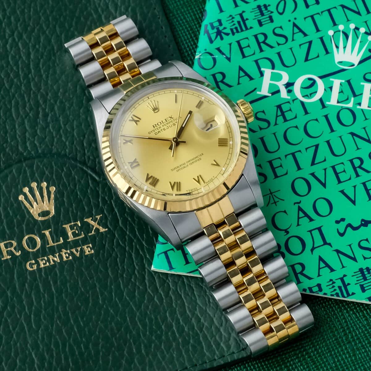 The watch is offered with its original booklet and leather wallet, otherwise watch only. A classic and elegant Datejust configuration combining two tone construction, a Roman dial and practical automatic functionality.