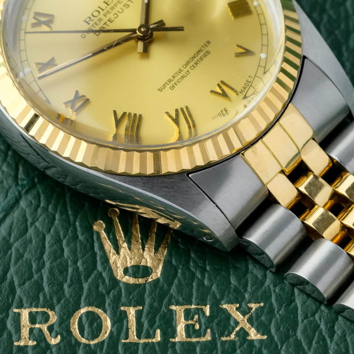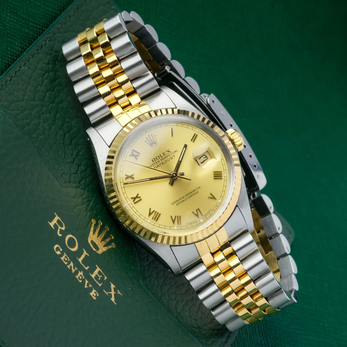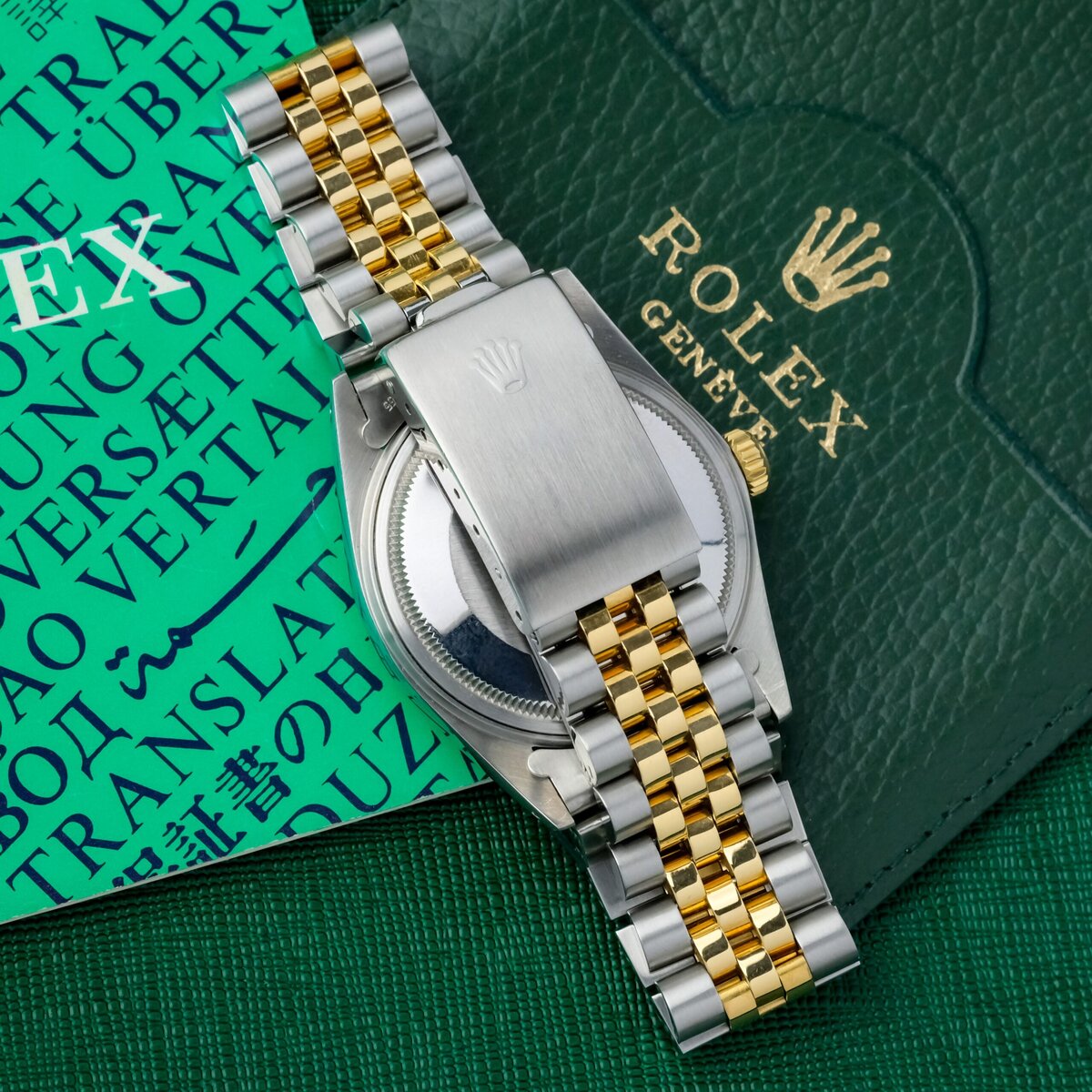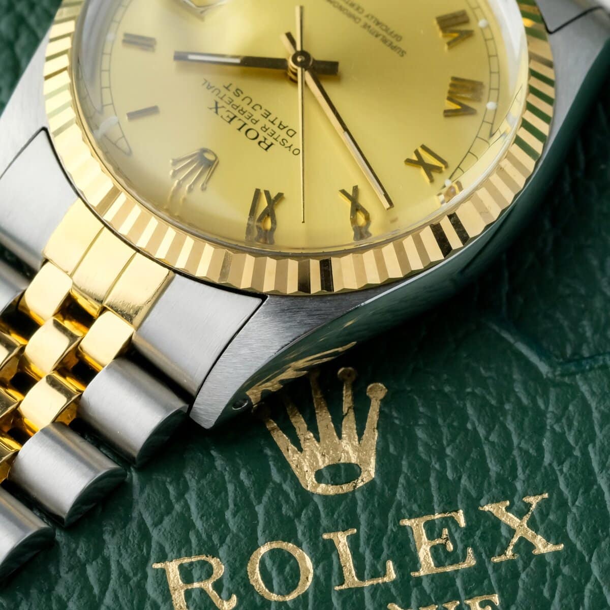 The watch is offered with its original booklet and leather wallet, otherwise watch only. A classic and elegant Datejust configuration combining two tone construction, a Roman dial and practical automatic functionality.