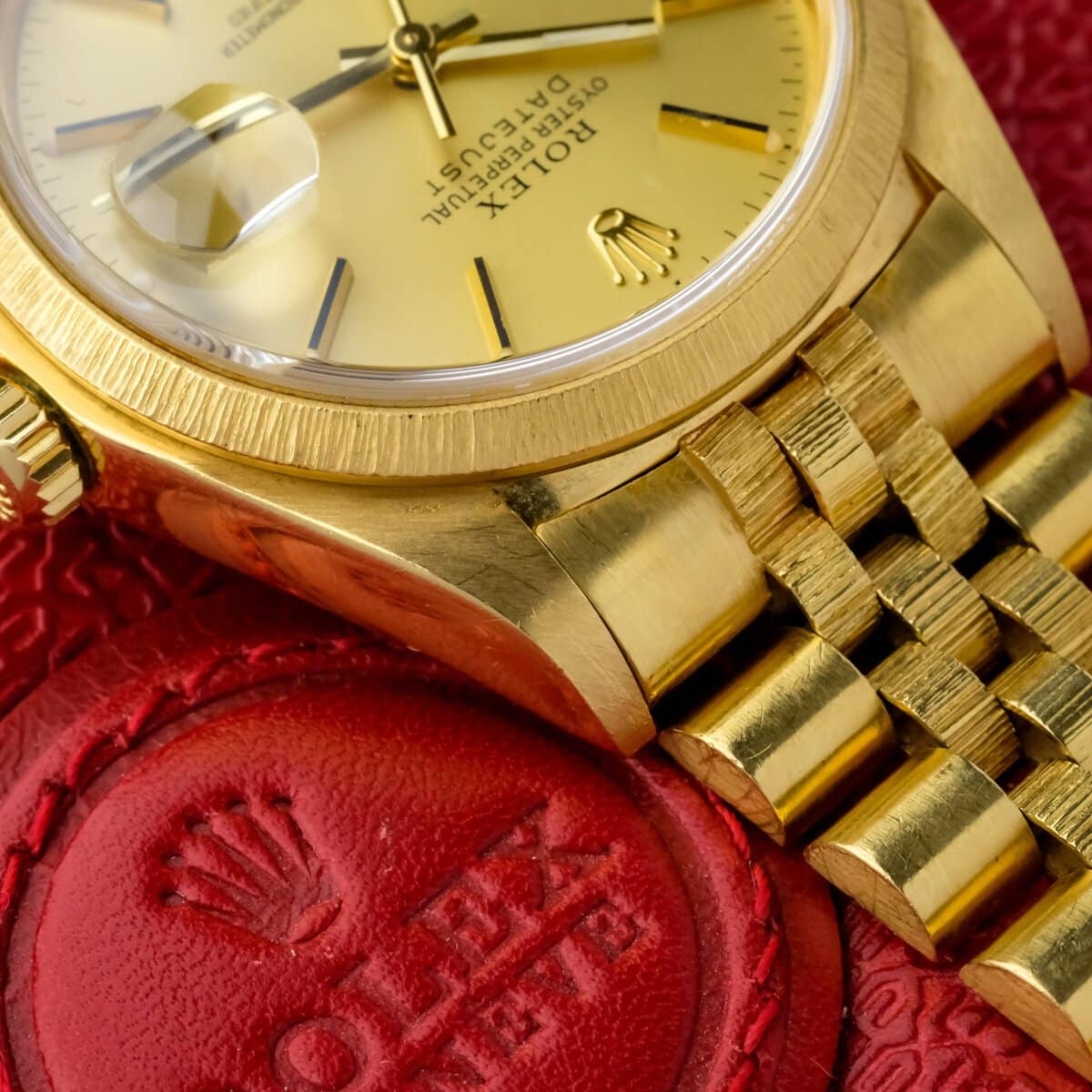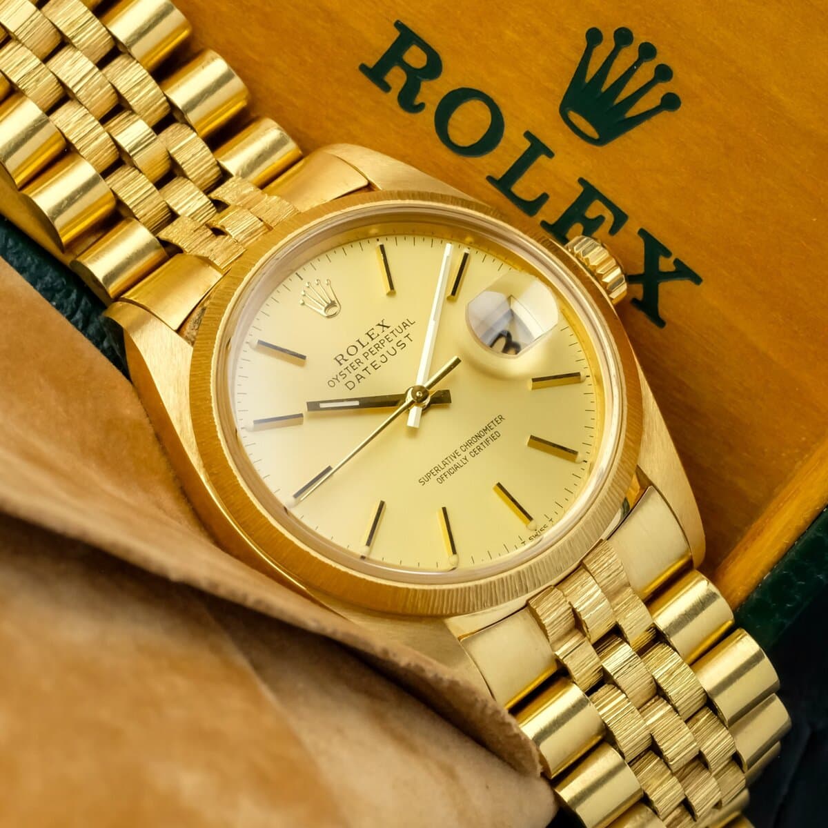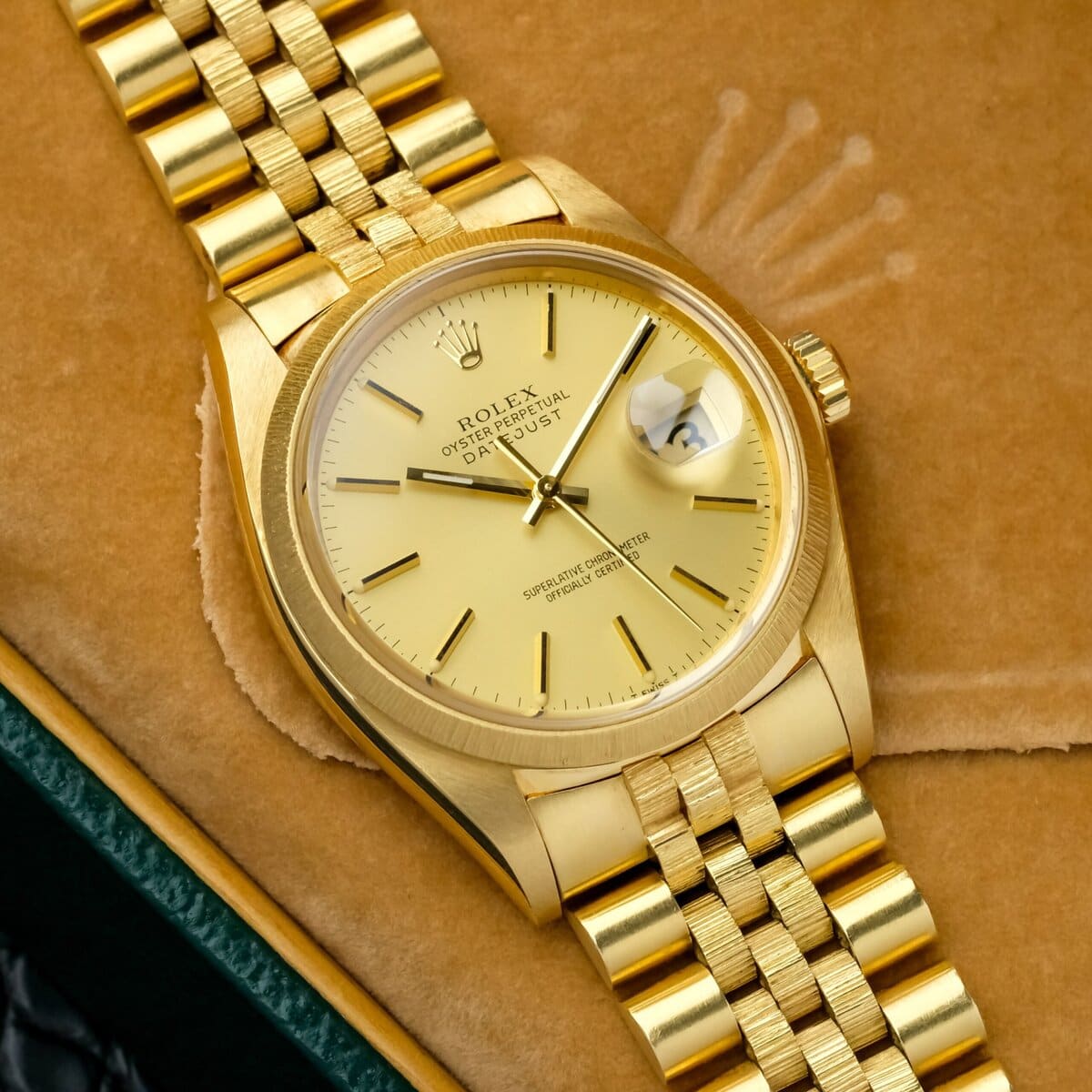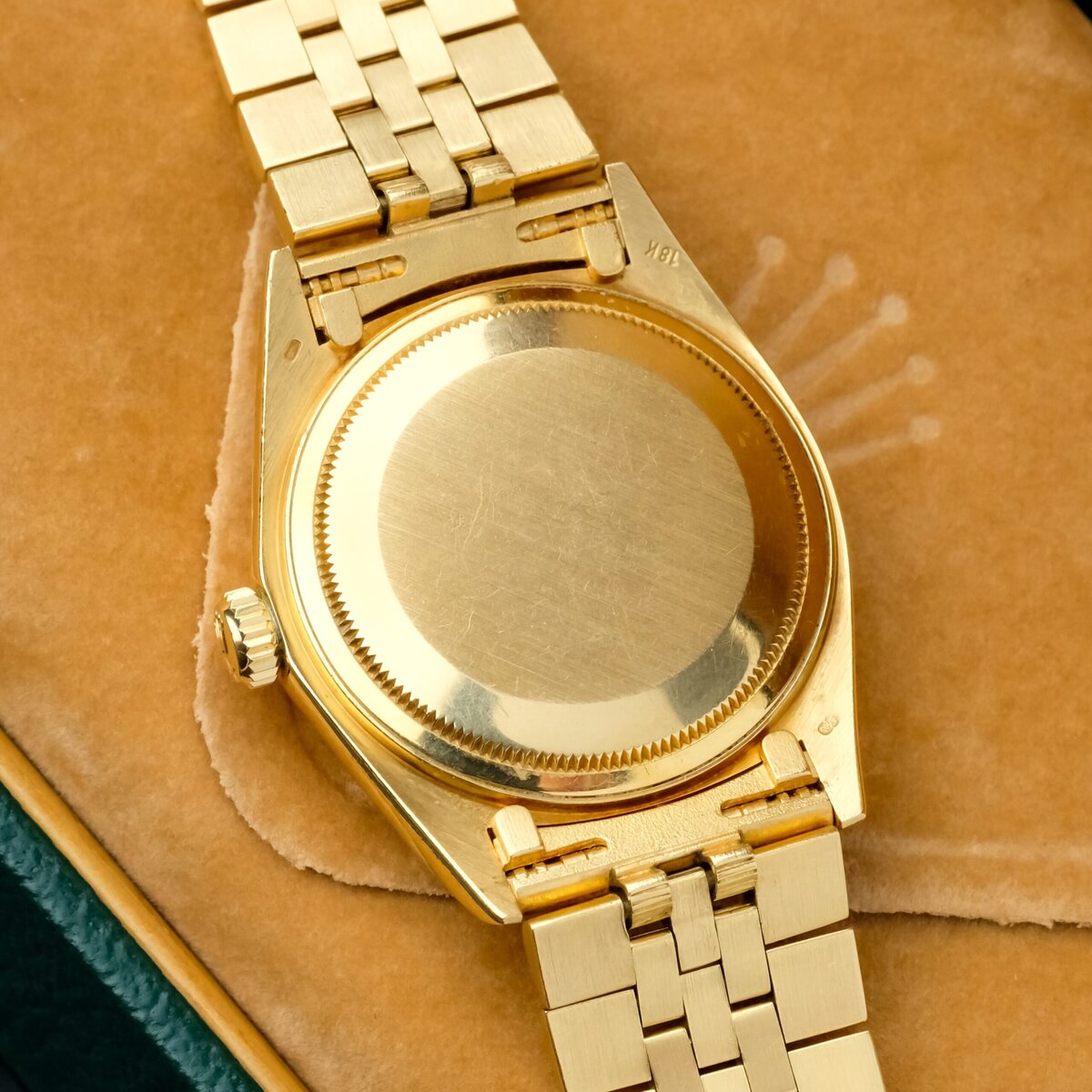 A classic and recognizable Datejust configuration in full yellow gold, combining the bark finish, warm dial tone and solid vintage appeal.