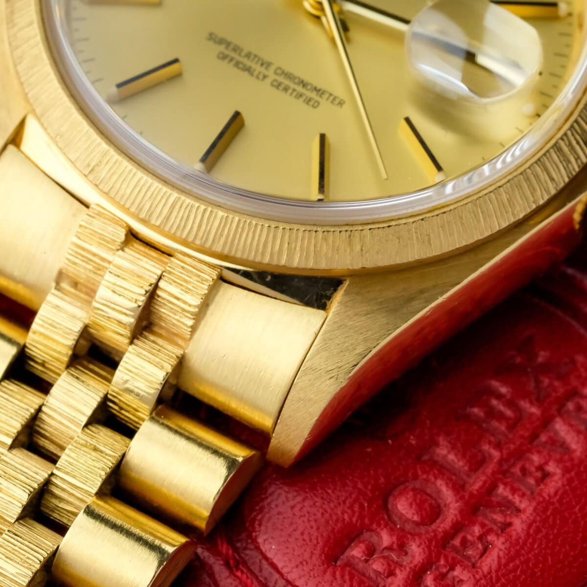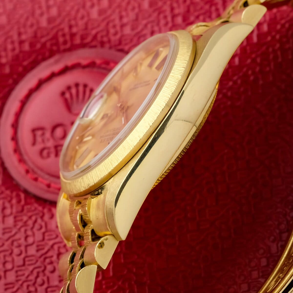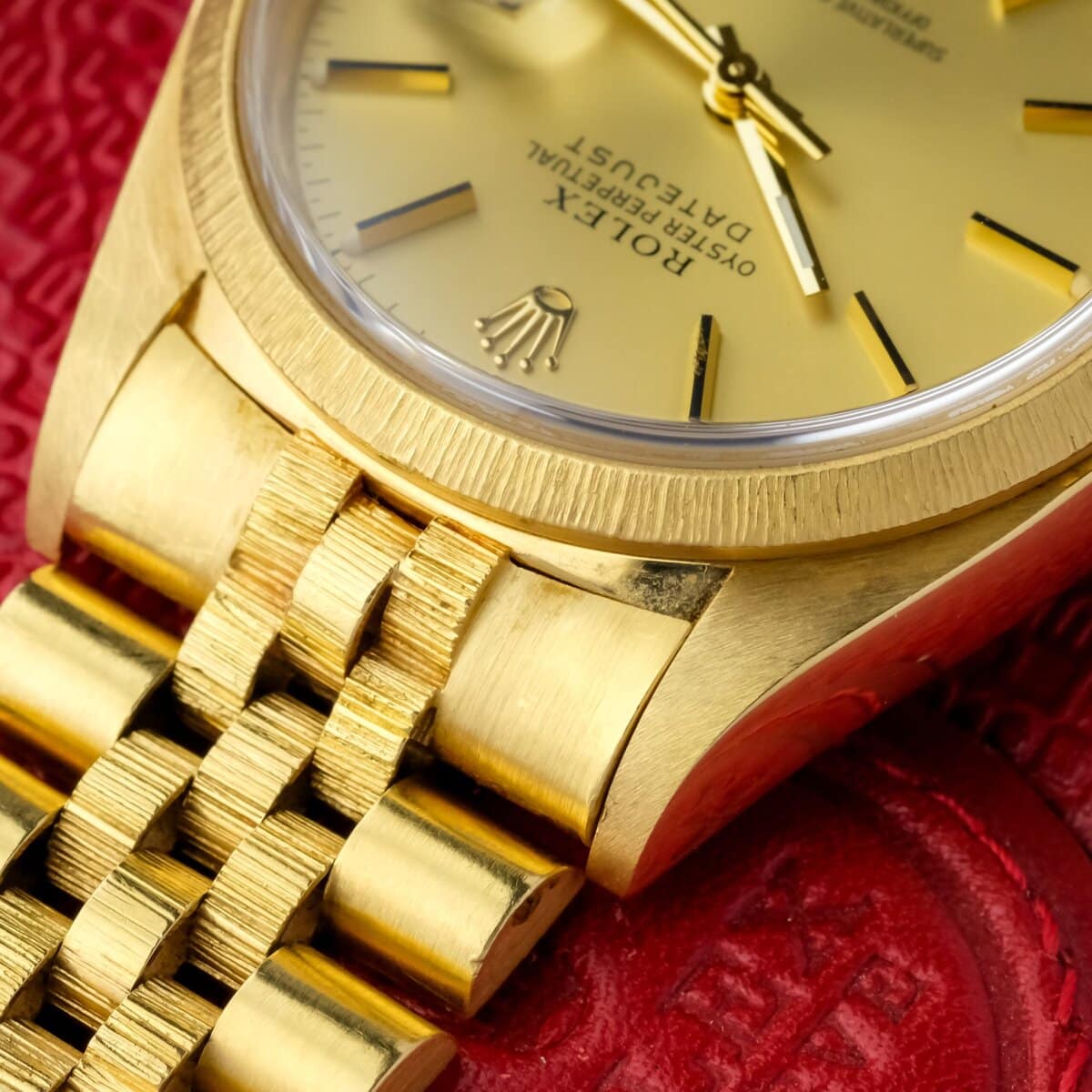 A classic and recognizable Datejust configuration in full yellow gold, combining the bark finish, warm dial tone and solid vintage appeal.