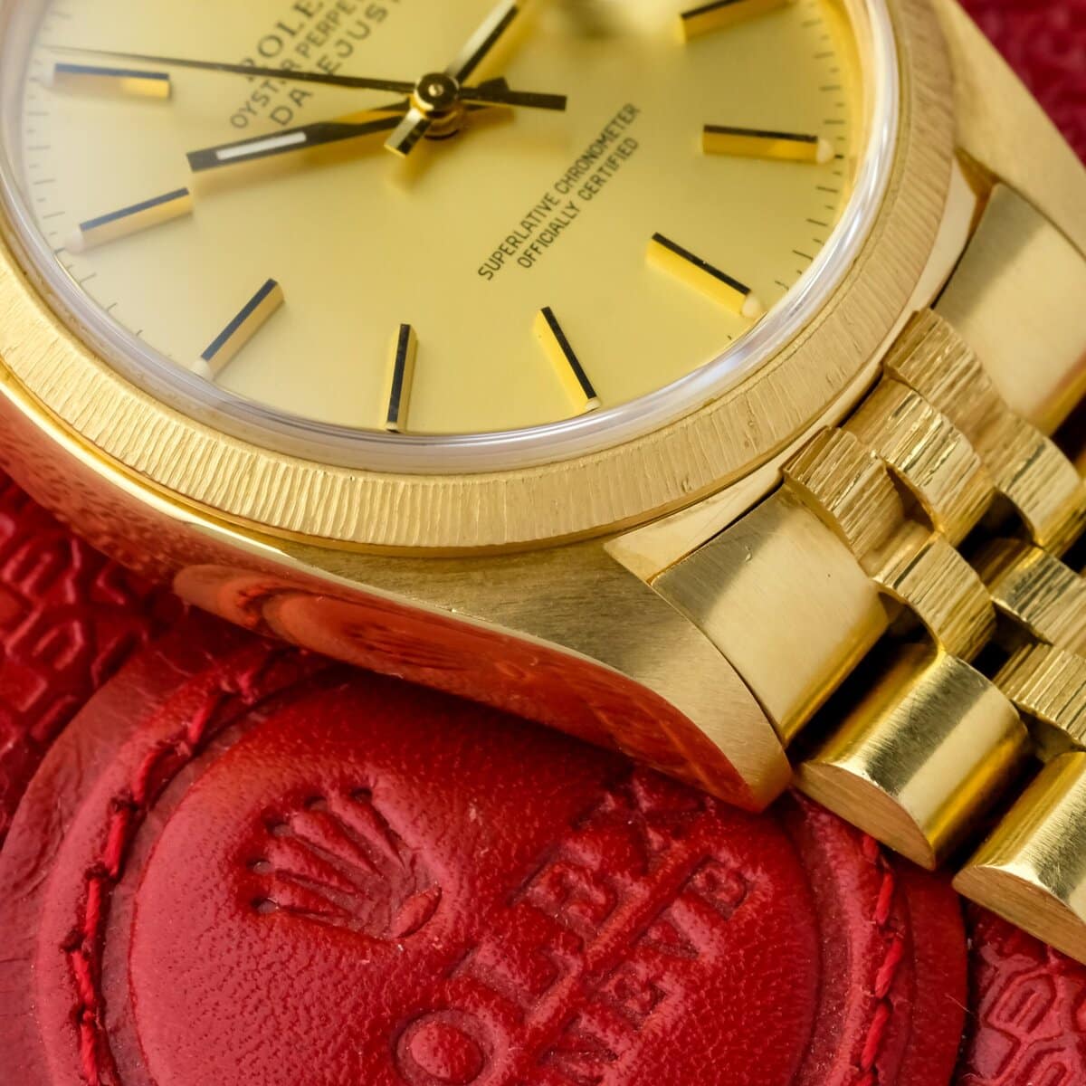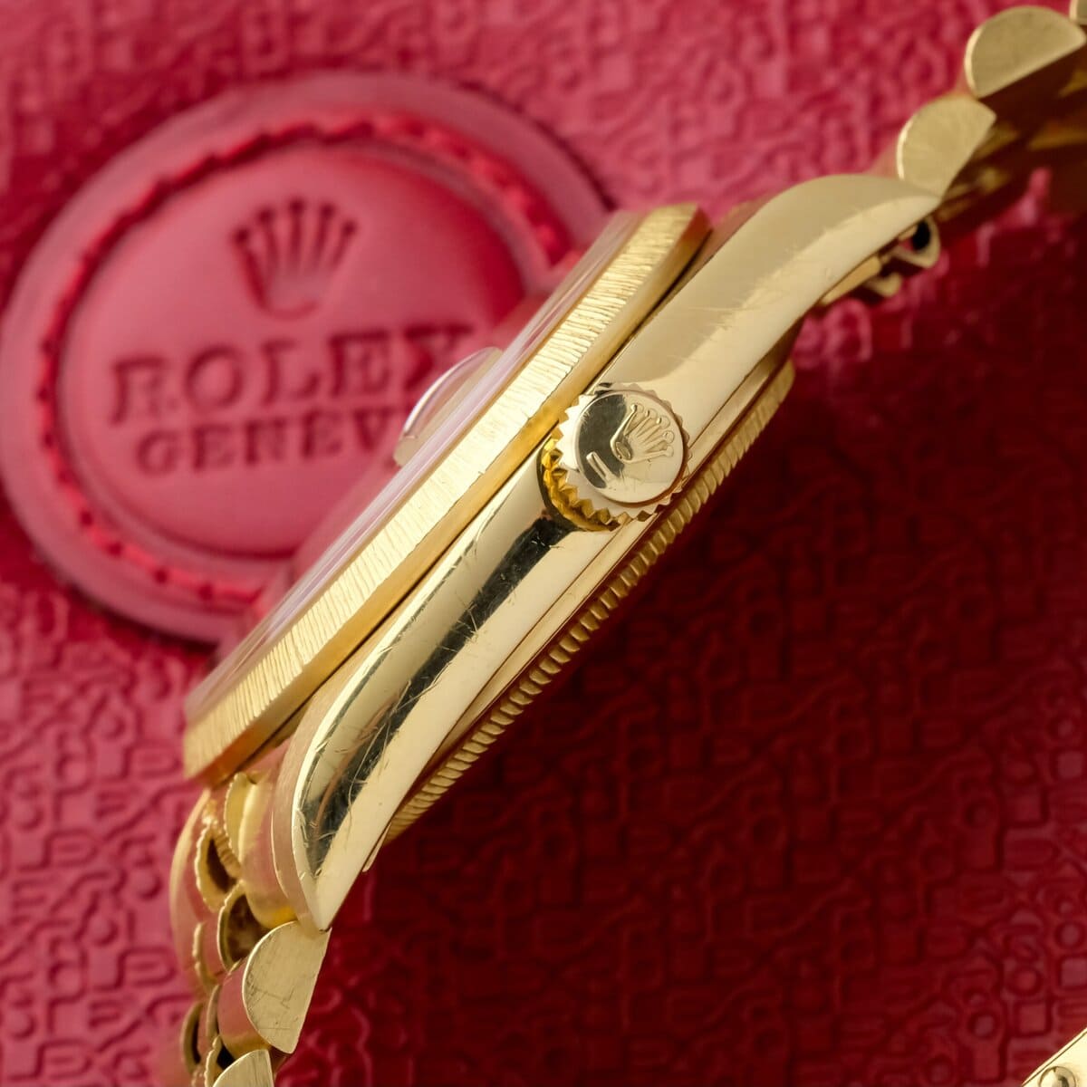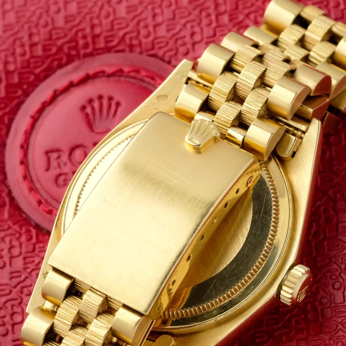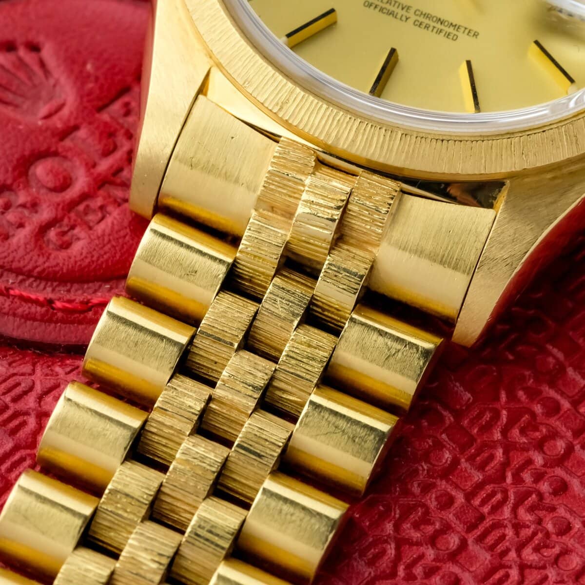 A classic and recognizable Datejust configuration in full yellow gold, combining the bark finish, warm dial tone and solid vintage appeal.