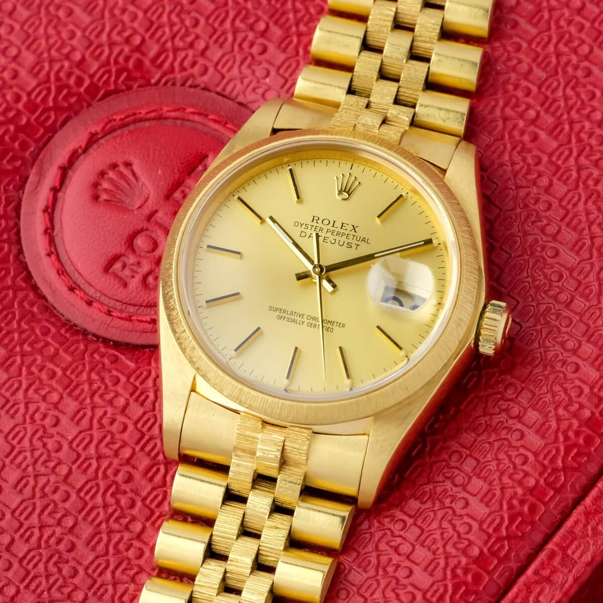 Rolex Datejust reference 16078 in 18k yellow gold, measuring 36 millimeters and powered by an automatic movement. This example dates from around 1980 and features the distinctive bark finish on the bezel and center bracelet links, a decorative technique Rolex used during this period.