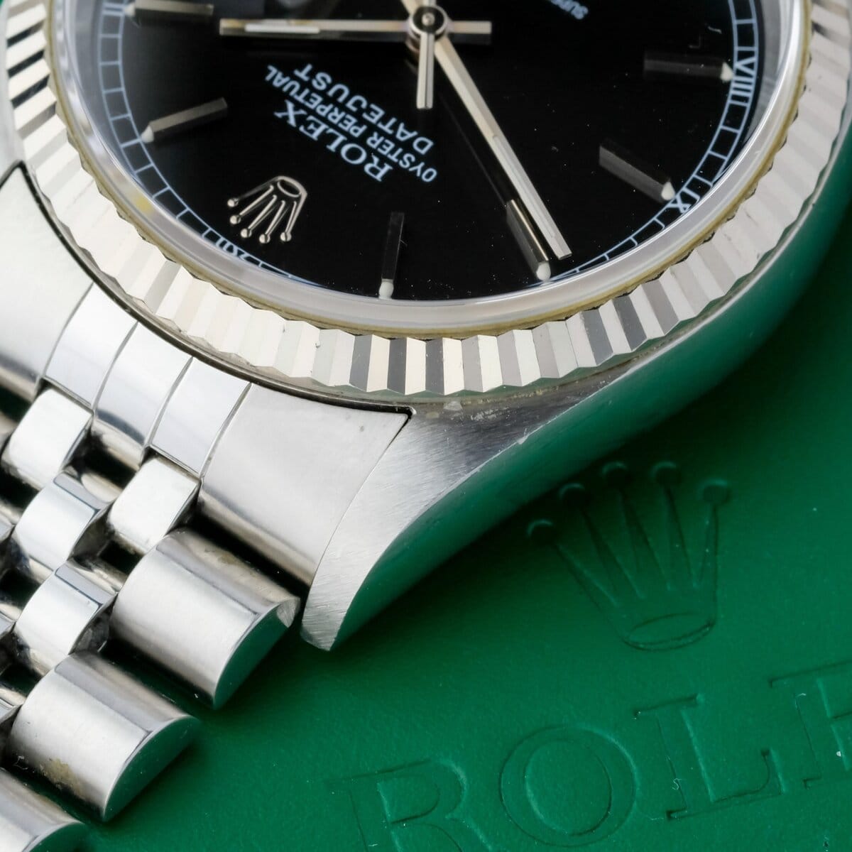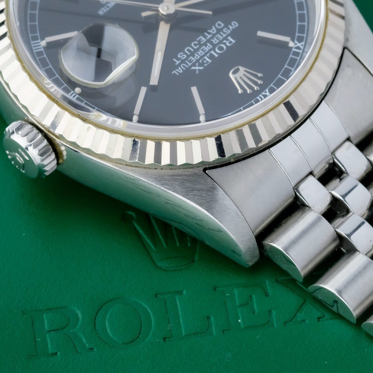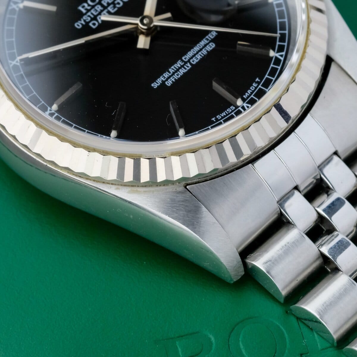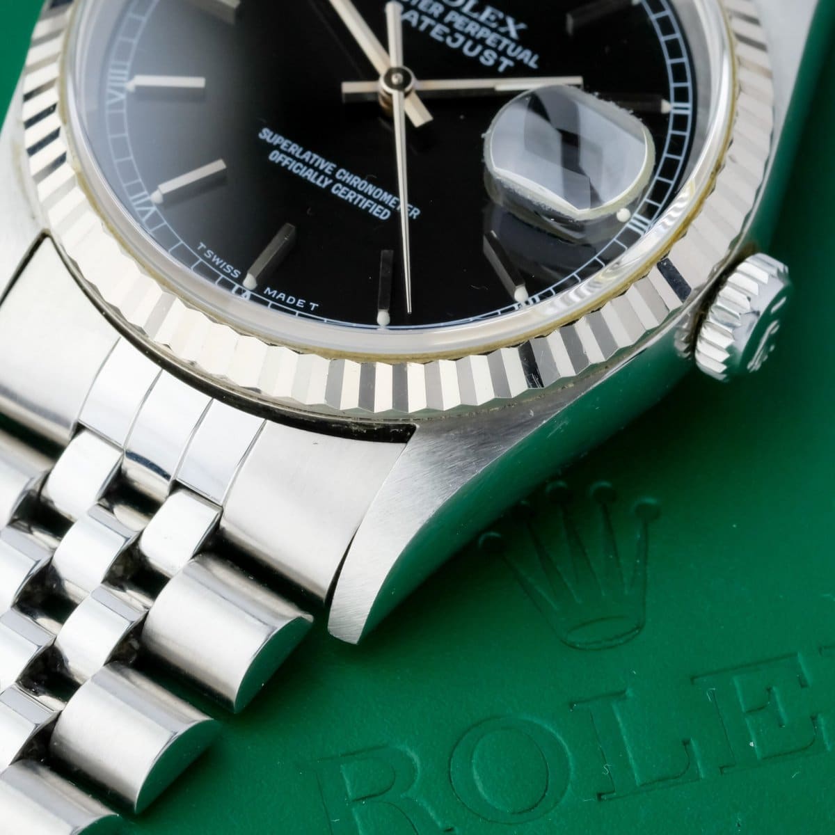 The black dial is in excellent condition with clean printing and strong color. The white gold fluted bezel remains crisp, and the automatic movement runs reliably with smooth setting and winding.