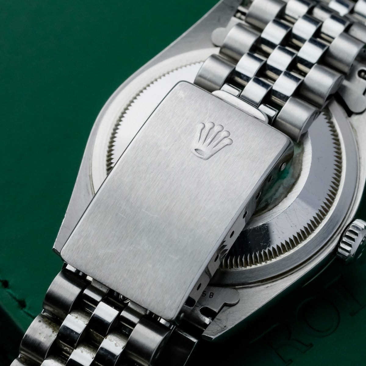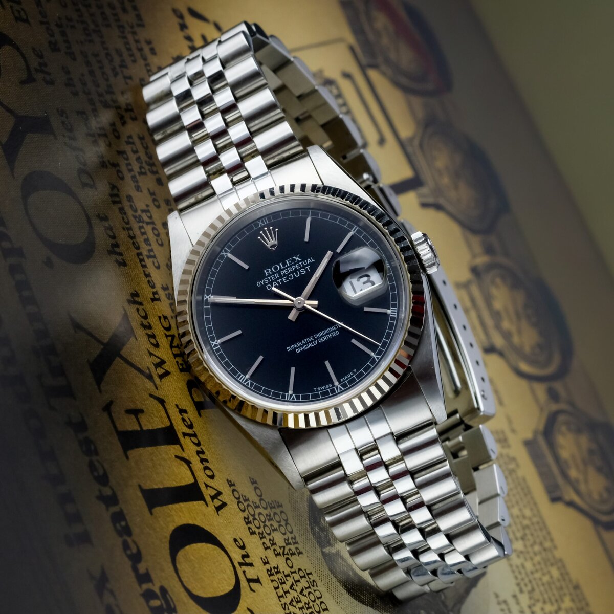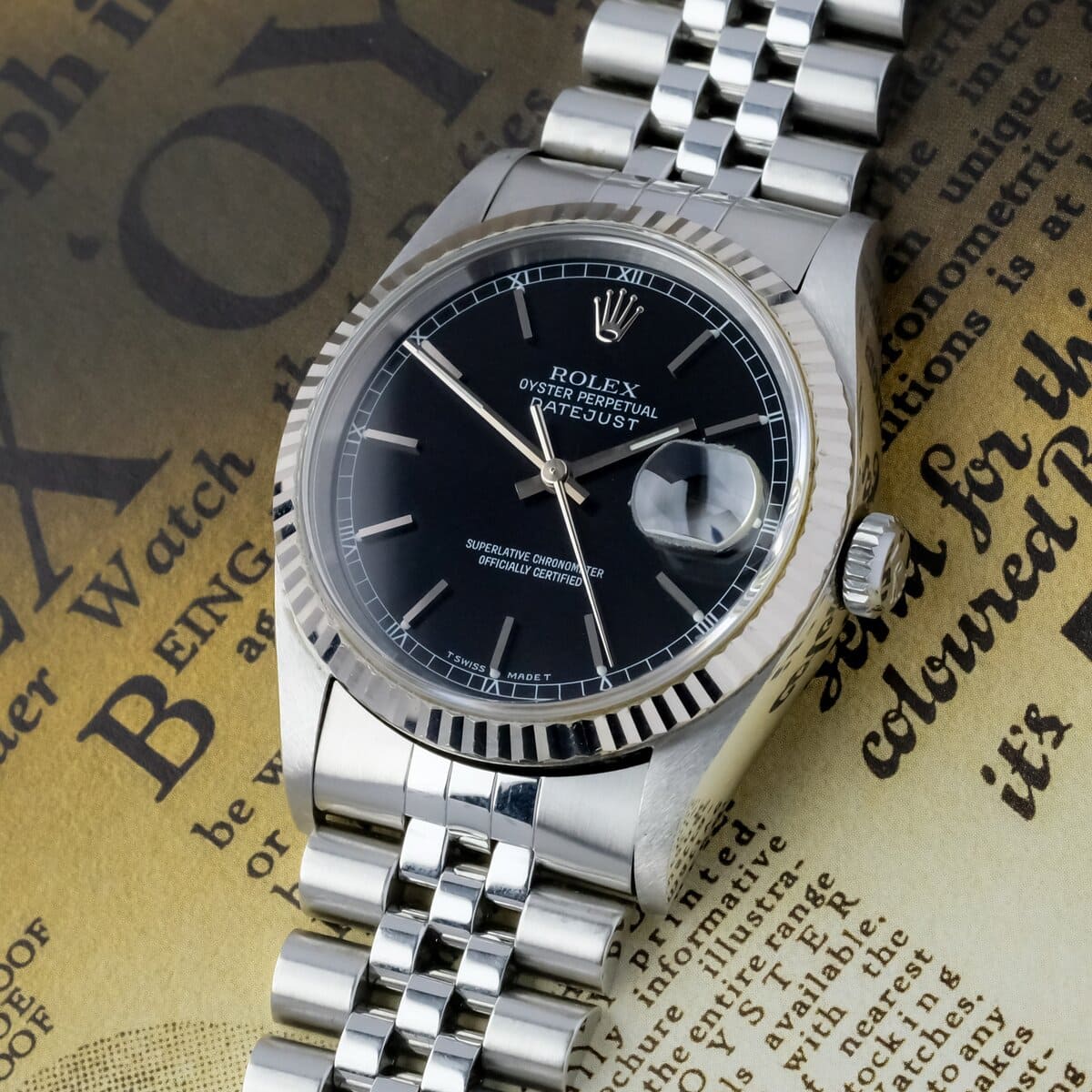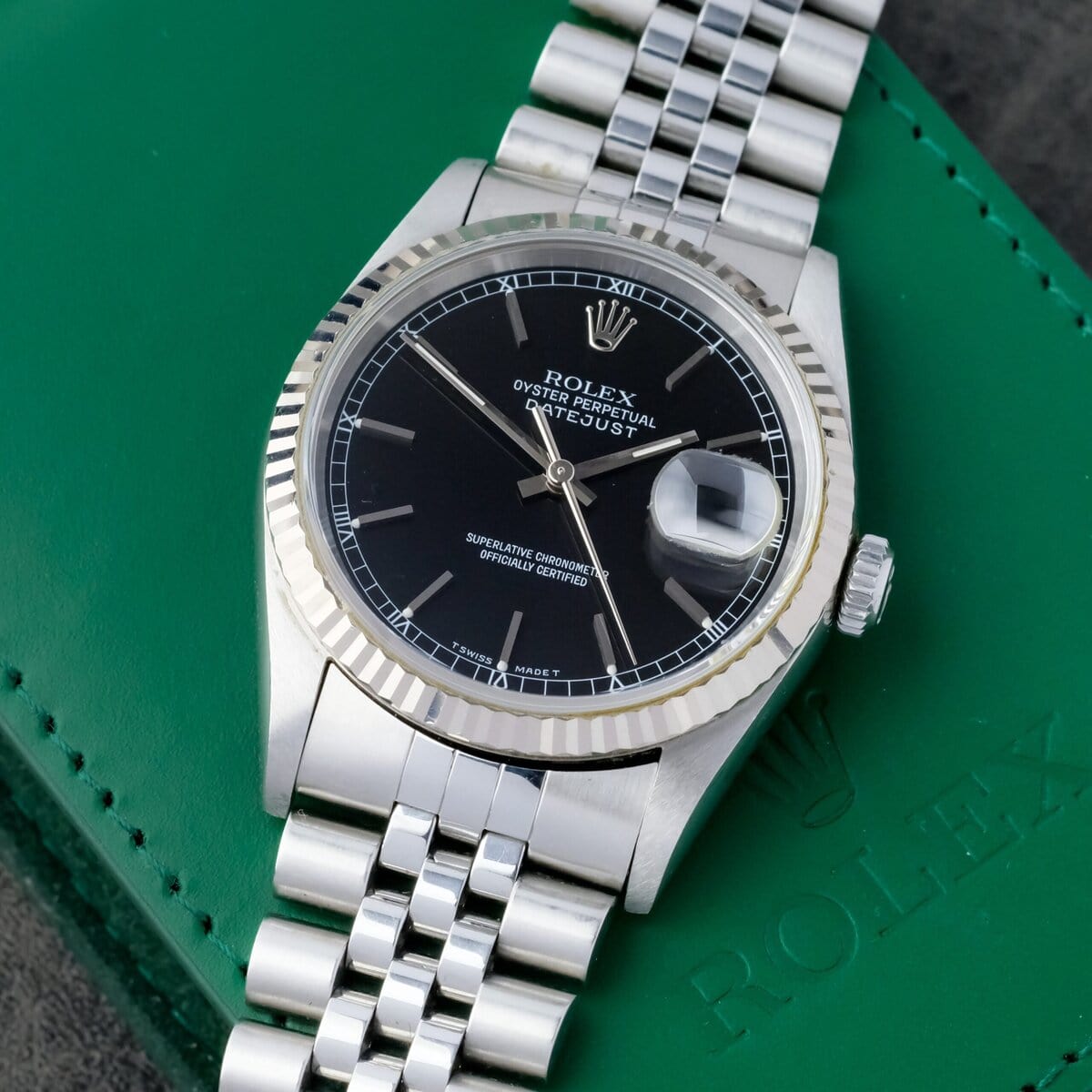 The black dial is in excellent condition with clean printing and strong color. The white gold fluted bezel remains crisp, and the automatic movement runs reliably with smooth setting and winding.