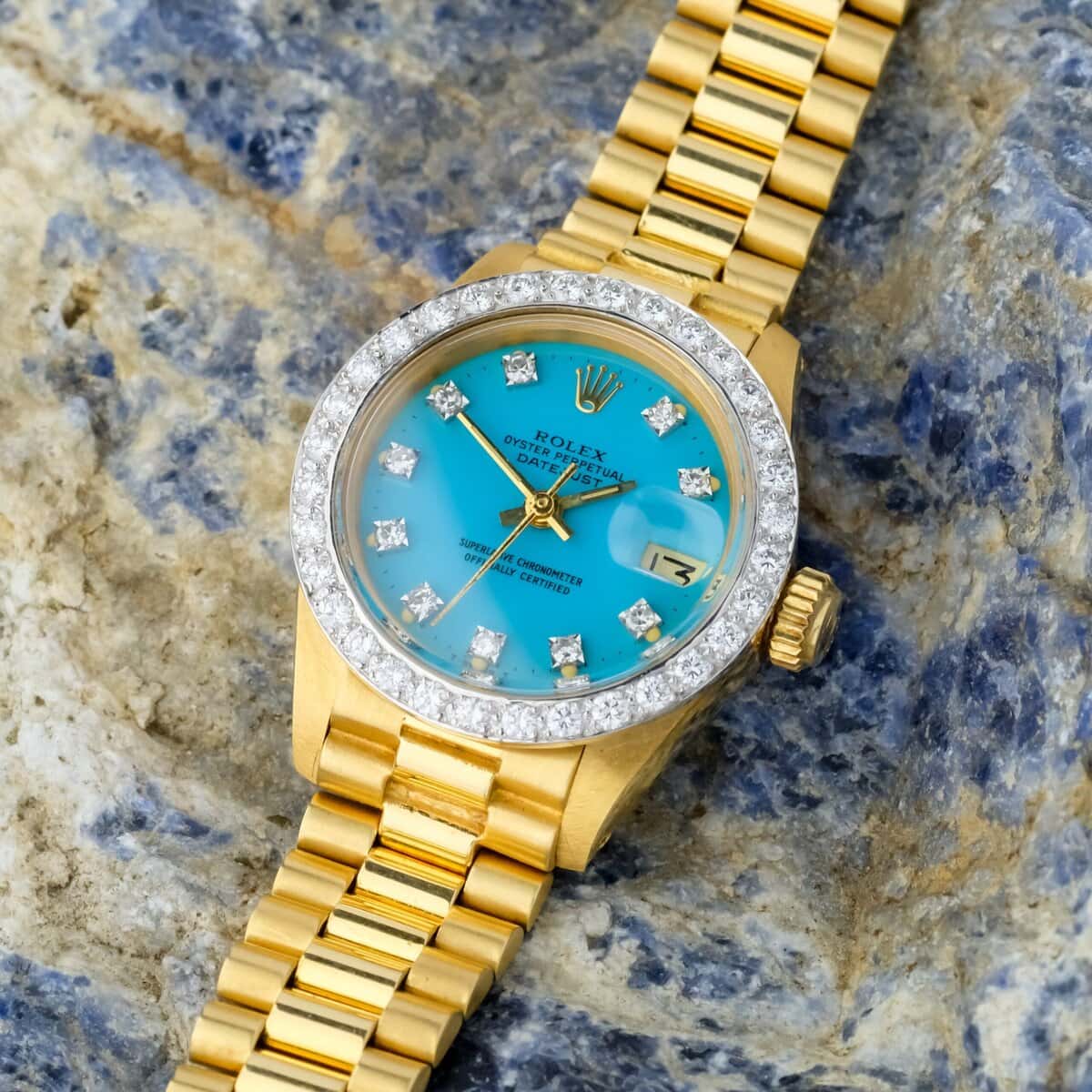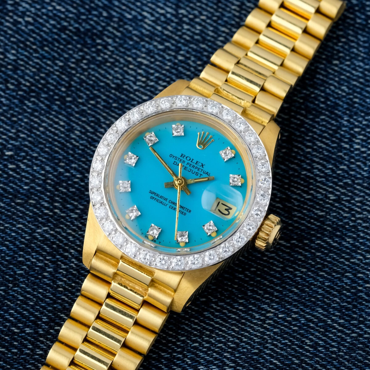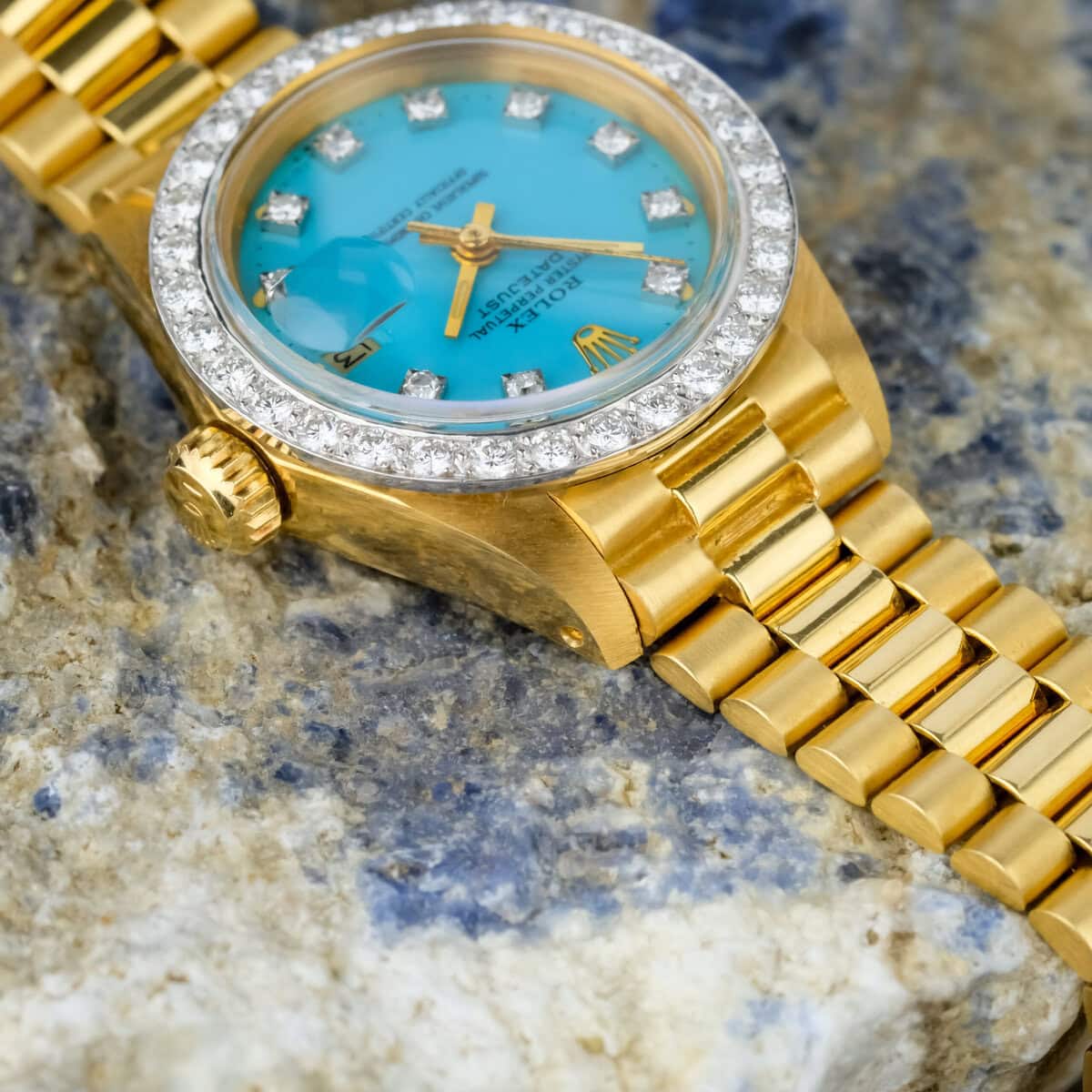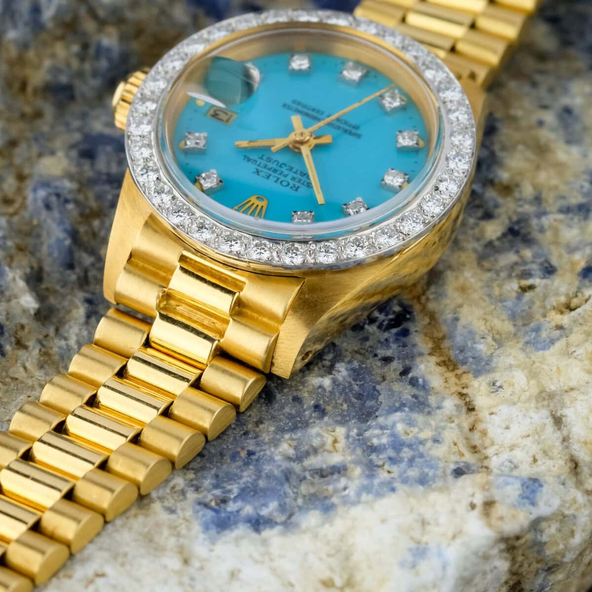 The factory diamond set bezel and diamond hour markers elevate the watch’s presence, adding a luxurious sparkle that complements the vivid turquoise hue of the dial. Powered by an automatic movement, it delivers both mechanical sophistication and timeless reliability.