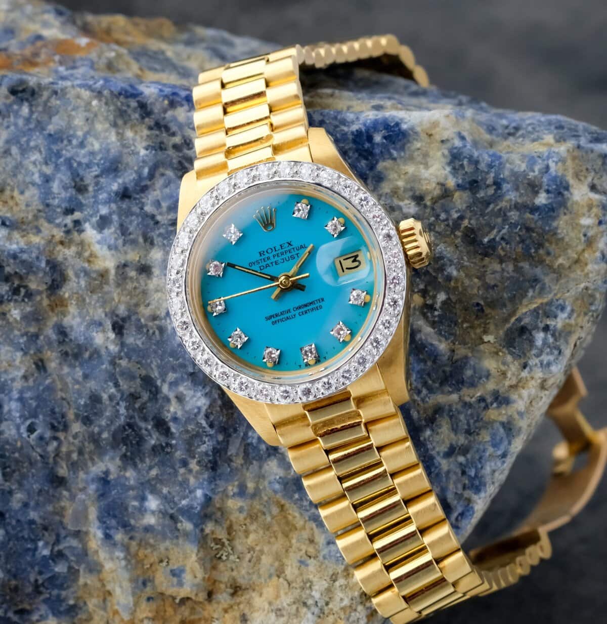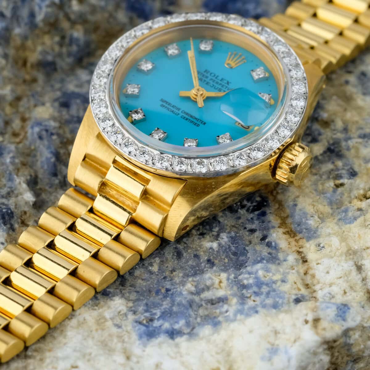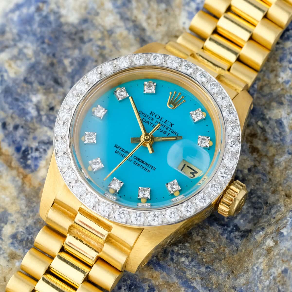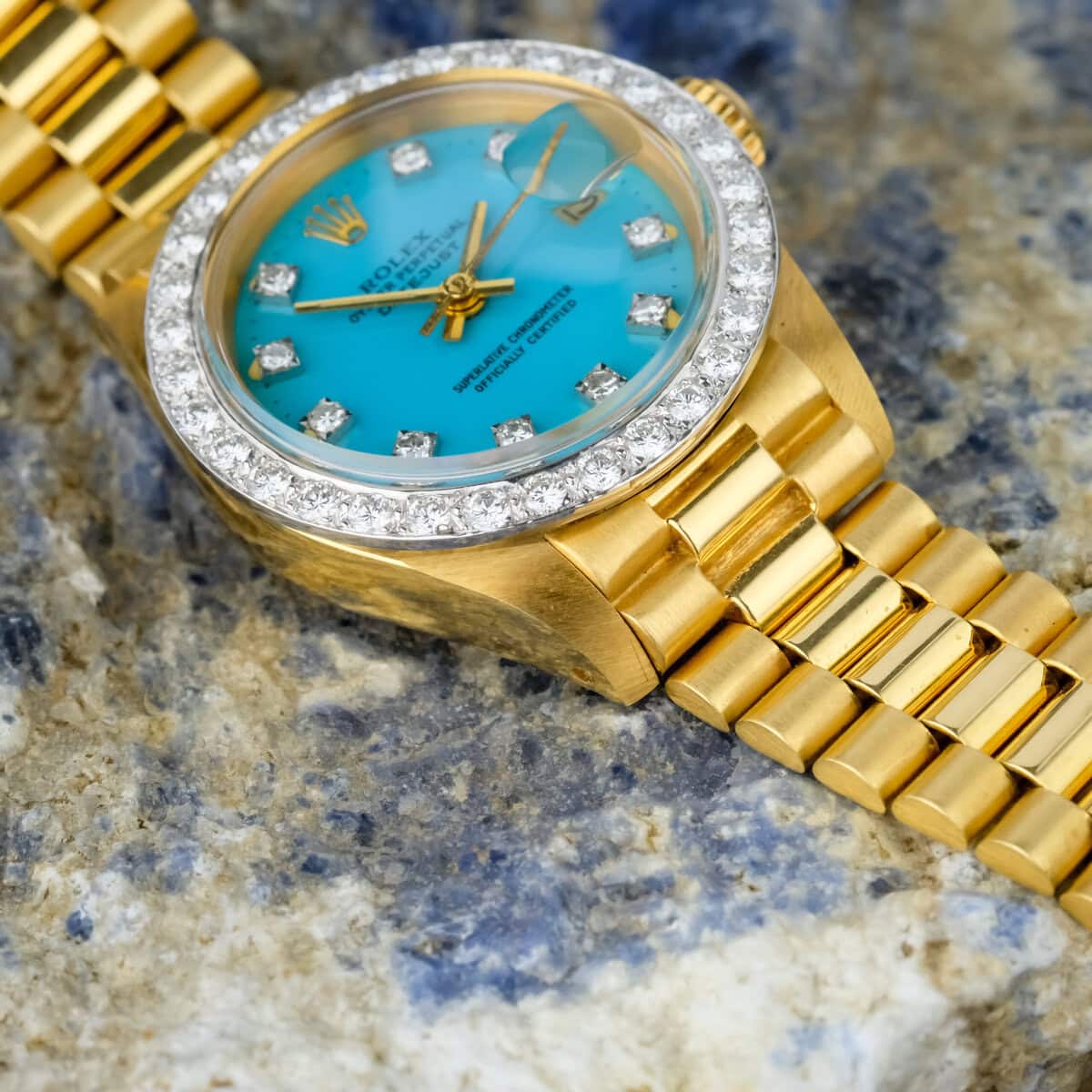 The factory diamond set bezel and diamond hour markers elevate the watch’s presence, adding a luxurious sparkle that complements the vivid turquoise hue of the dial. Powered by an automatic movement, it delivers both mechanical sophistication and timeless reliability.