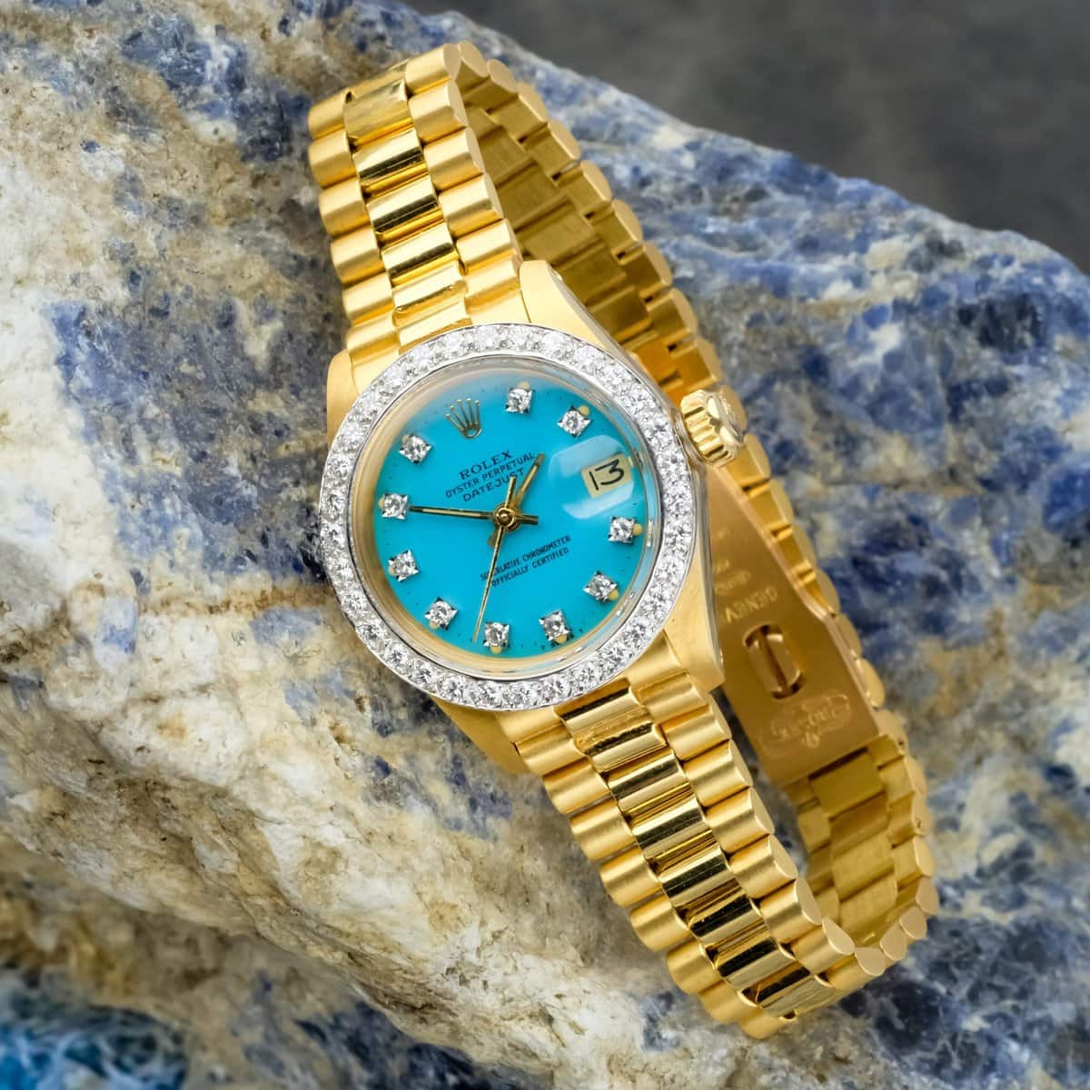 This Rolex Lady Datejust reference 6917 is an exceptionally rare and eye catching example of the model, crafted in 18k yellow gold and fitted with a striking turquoise Stella dial. Measuring 26 millimeters, the watch combines the elegance of the Lady Datejust design with the vibrant artistry of Rolex’s coveted lacquered dials.