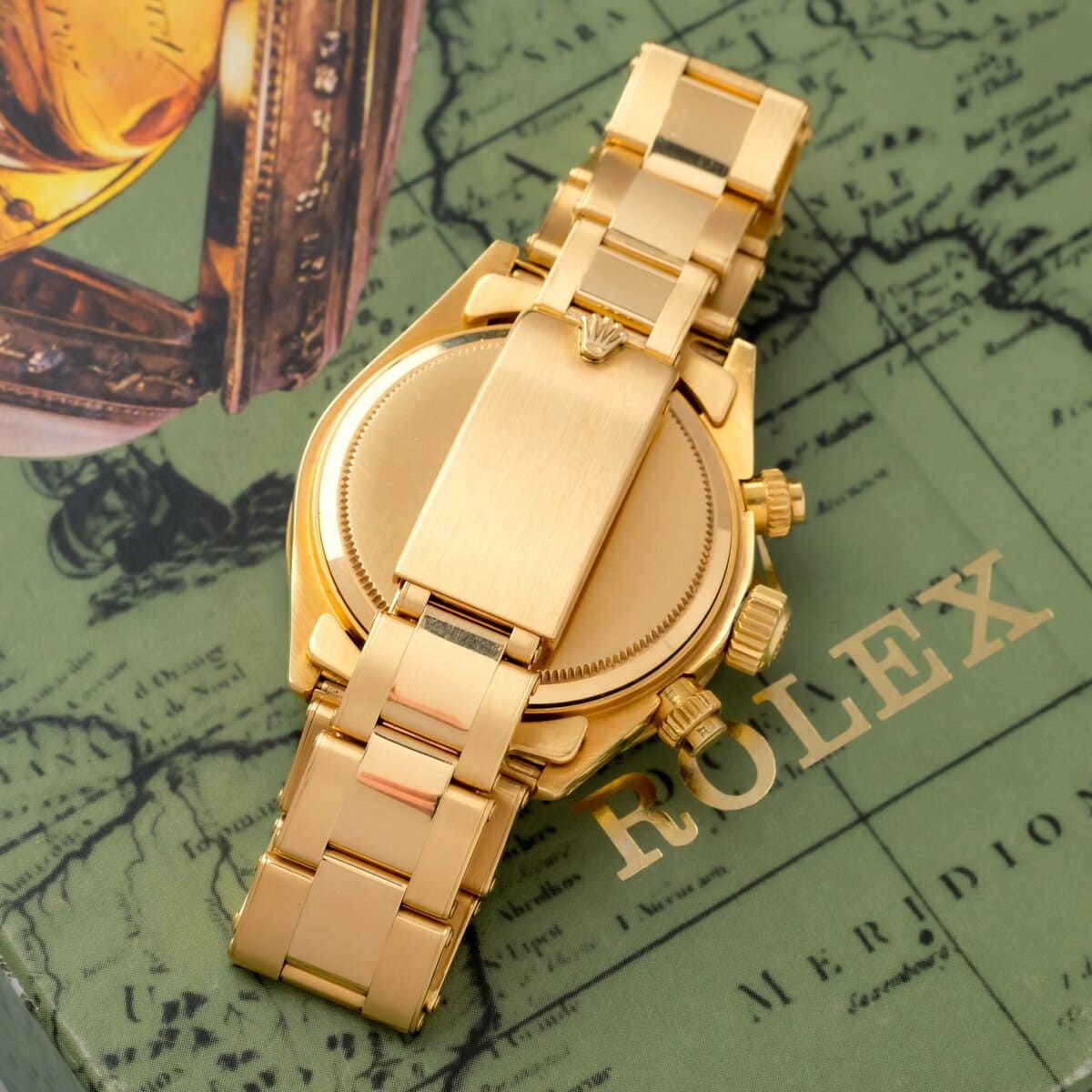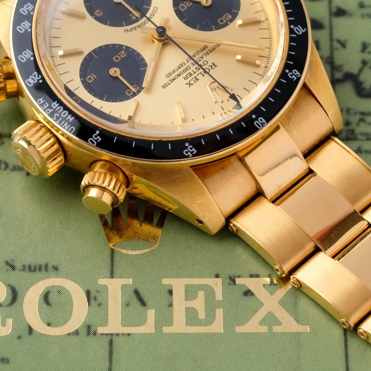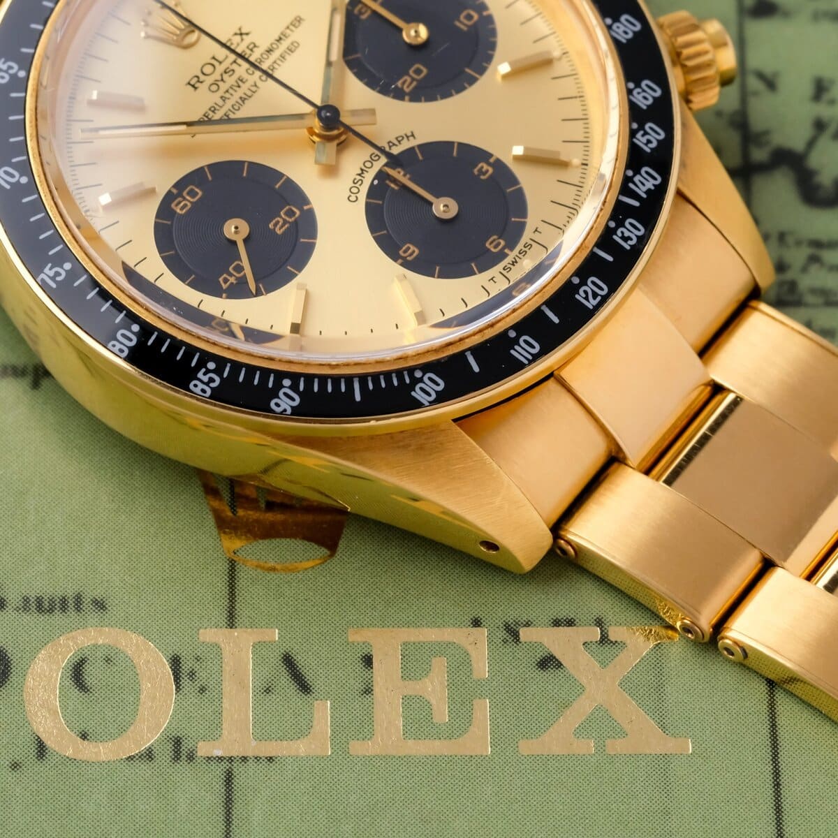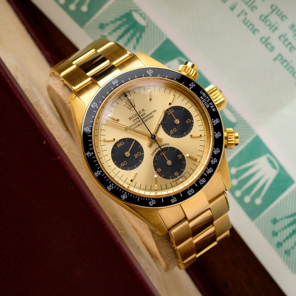 This example is offered as a full set, including its original guarantee dated July 31, 1985, product literature, presentation box and outer packaging. A cornerstone reference in Rolex history and one of the most desirable Daytona models ever produced, especially in this rare and complete yellow gold configuration.