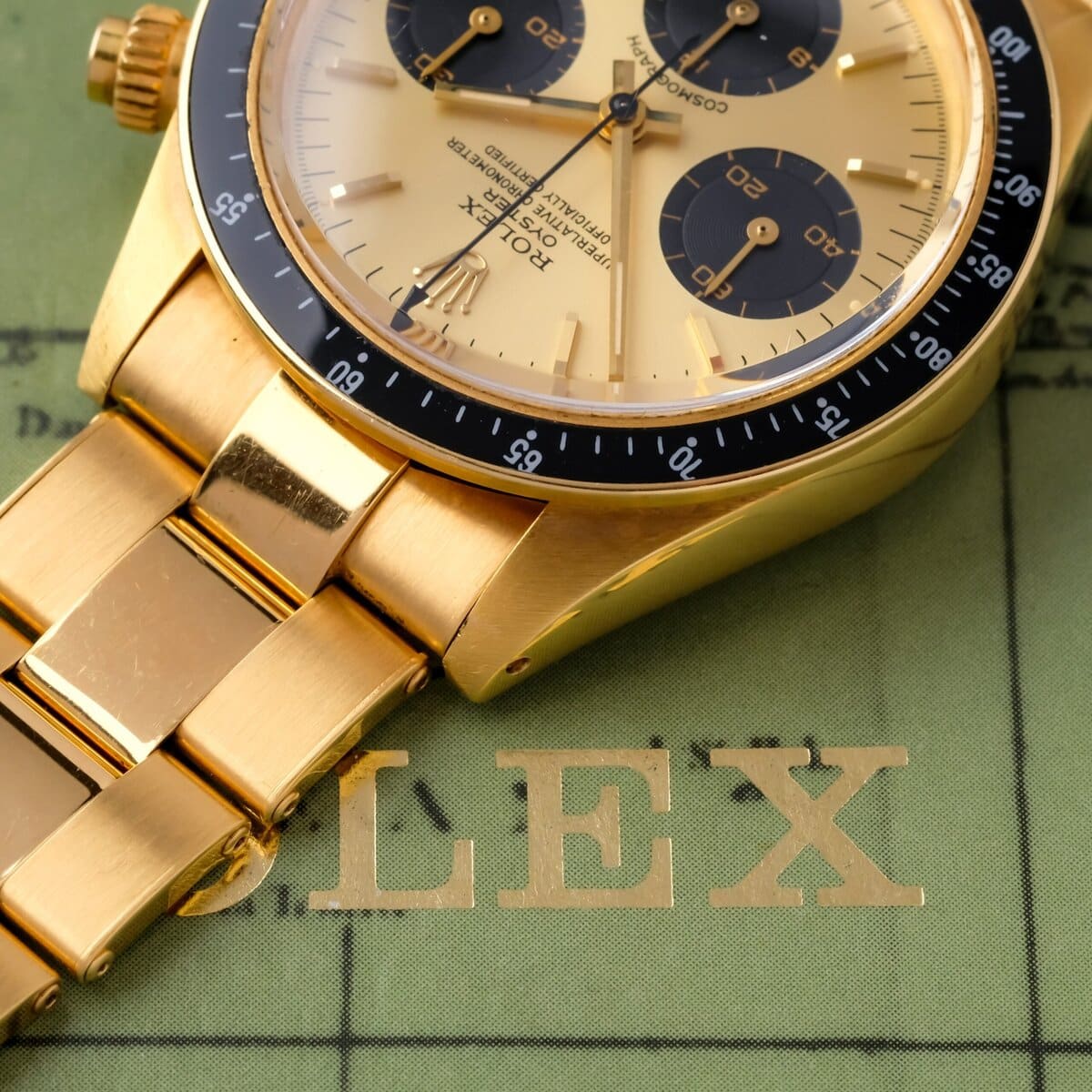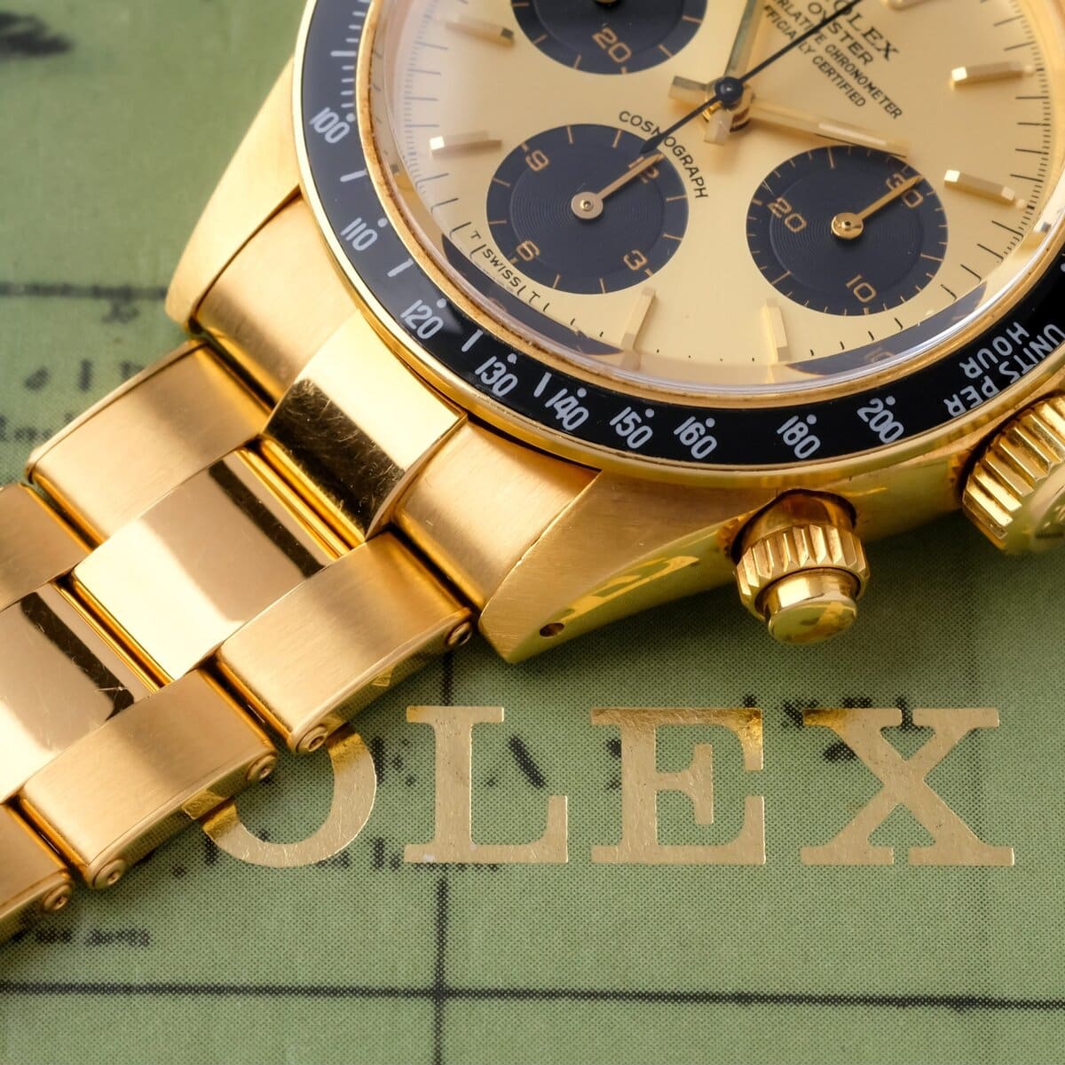 Gold examples of the 6263 were produced in very small numbers and were unconventional for a tool oriented chronograph, making them exceptionally rare and highly collectible today. This watch is fitted with a champagne dial with black subsidiary counters, a configuration that creates strong contrast and pairs exceptionally well with the yellow gold case and black bezel.
