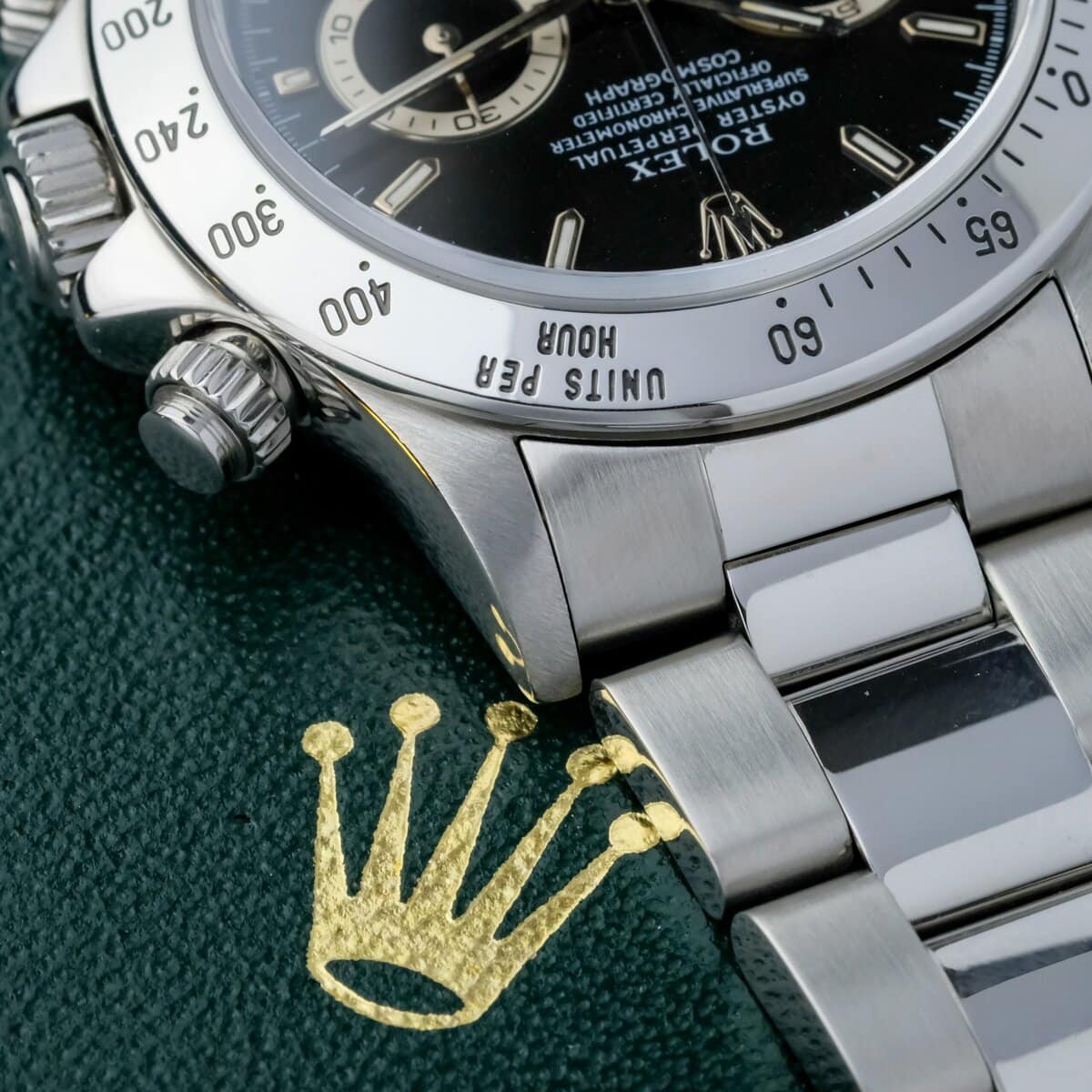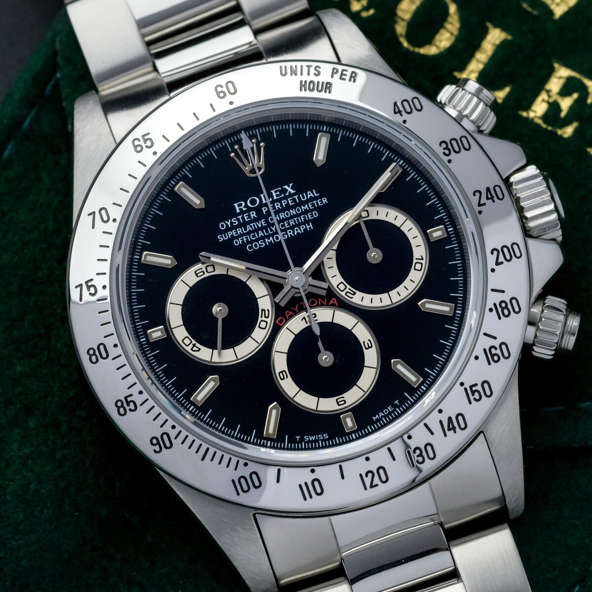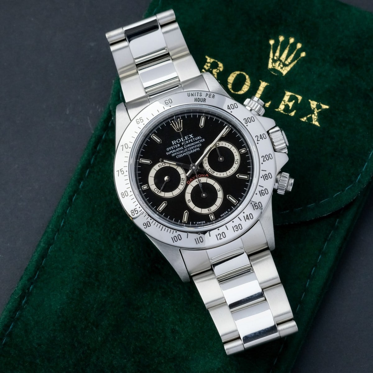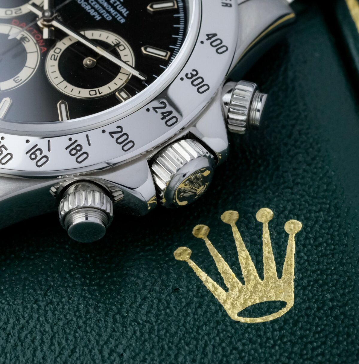 Rolex Daytona reference 16520 with black dial, powered by the Zenith based automatic caliber 4030. The 40 millimeter stainless steel case, screw down pushers and tachymeter bezel give the watch its unmistakable Daytona presence.