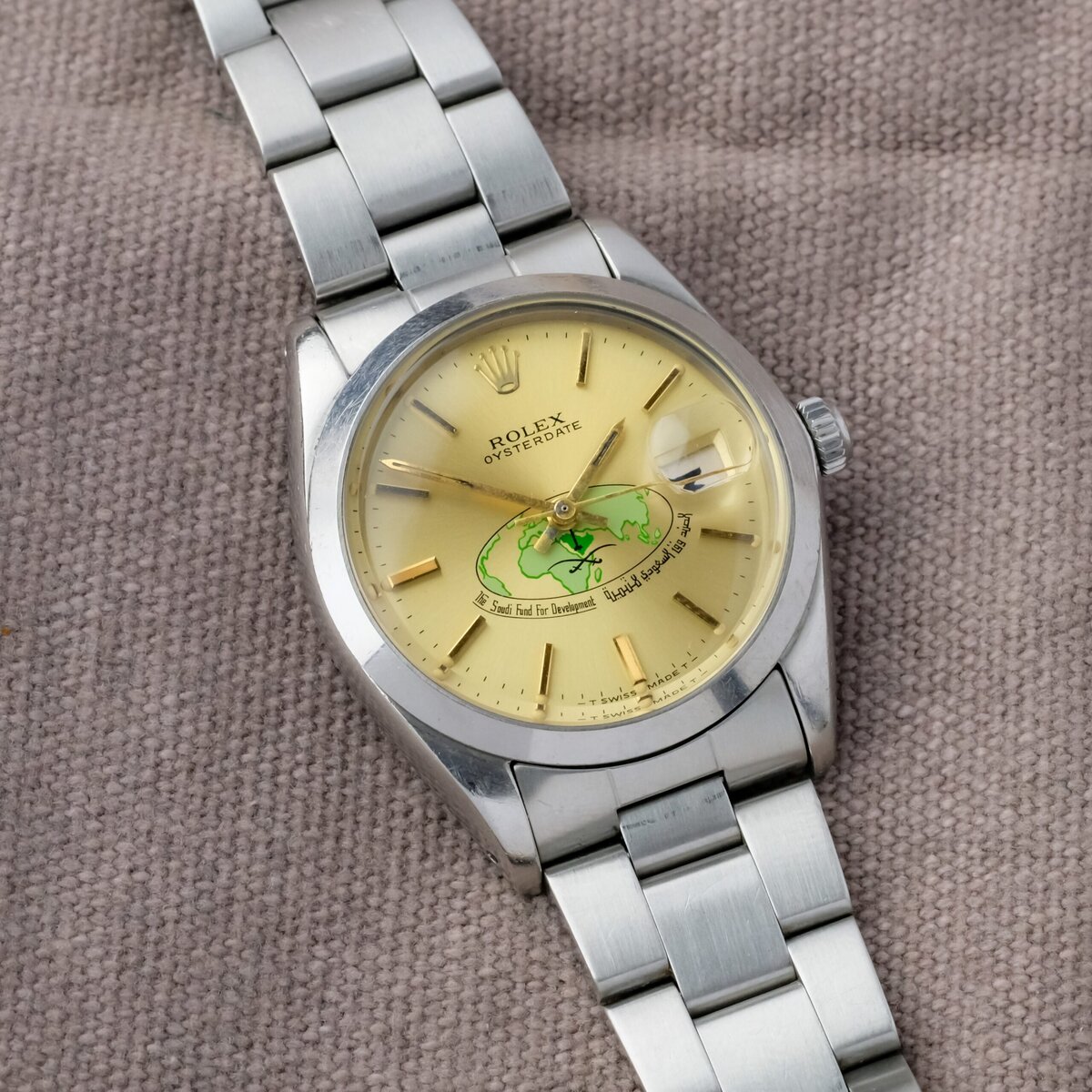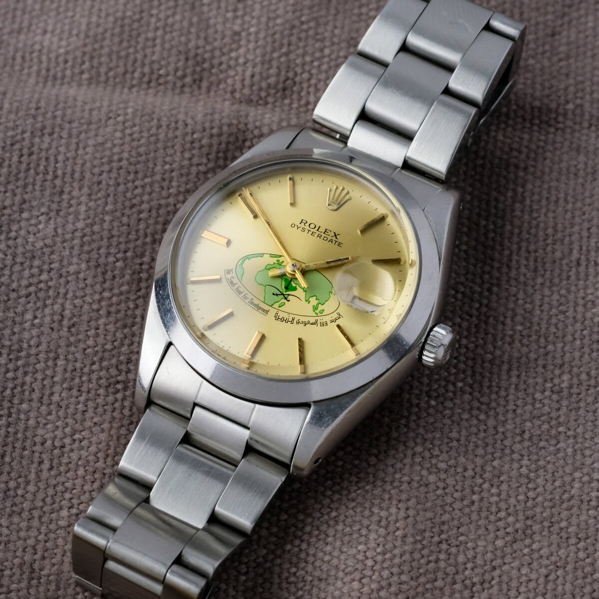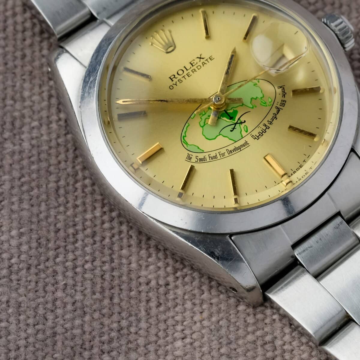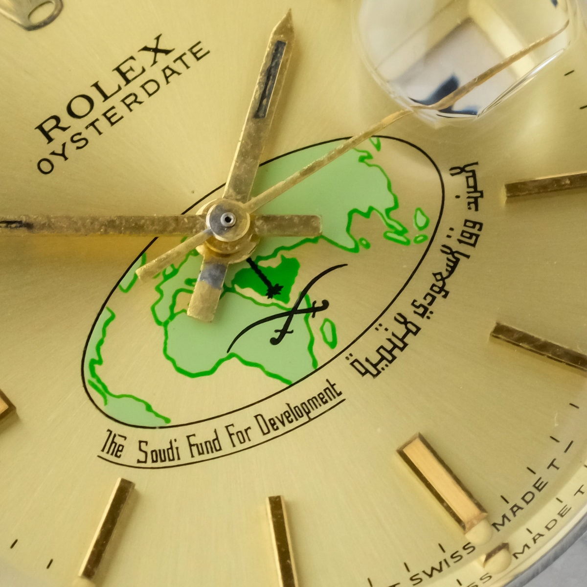 What makes this piece especially noteworthy is its exceptionally rare dial, printed with the emblem of the Saudi Fund for Development. The champagne-toned surface remains in outstanding condition with crisp, perfectly preserved printing, giving the watch both historical and collectible appeal.