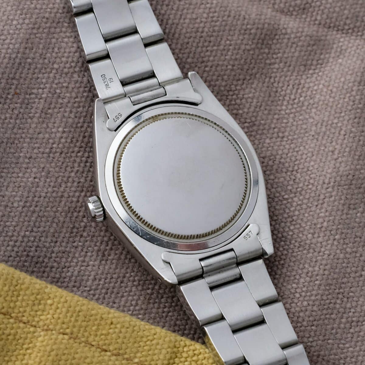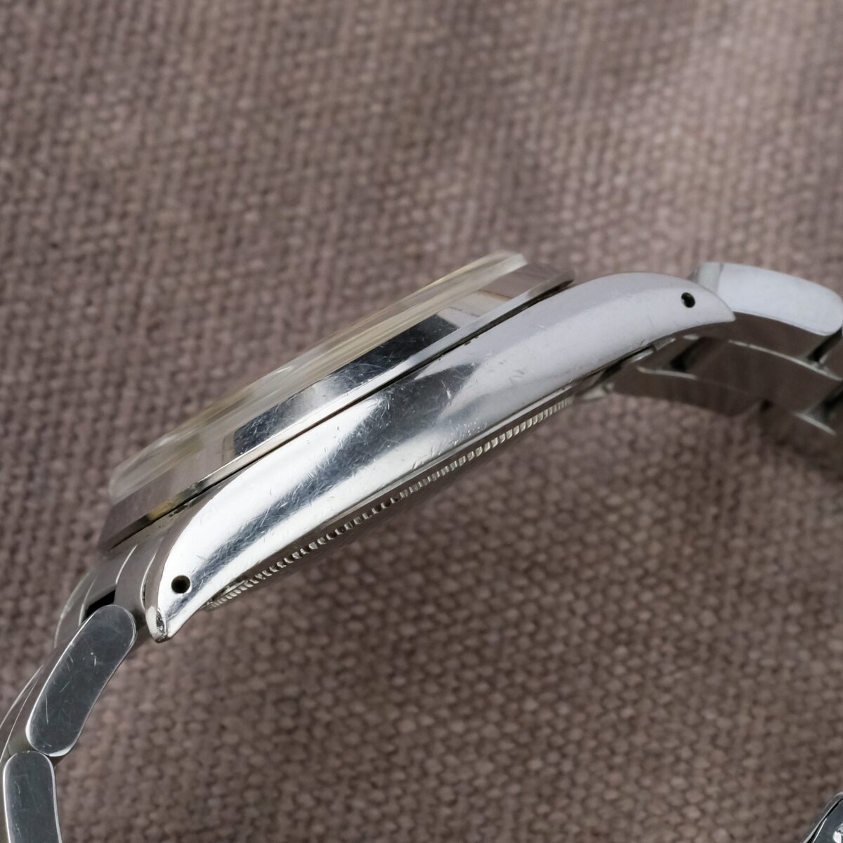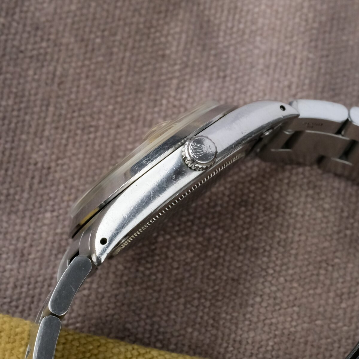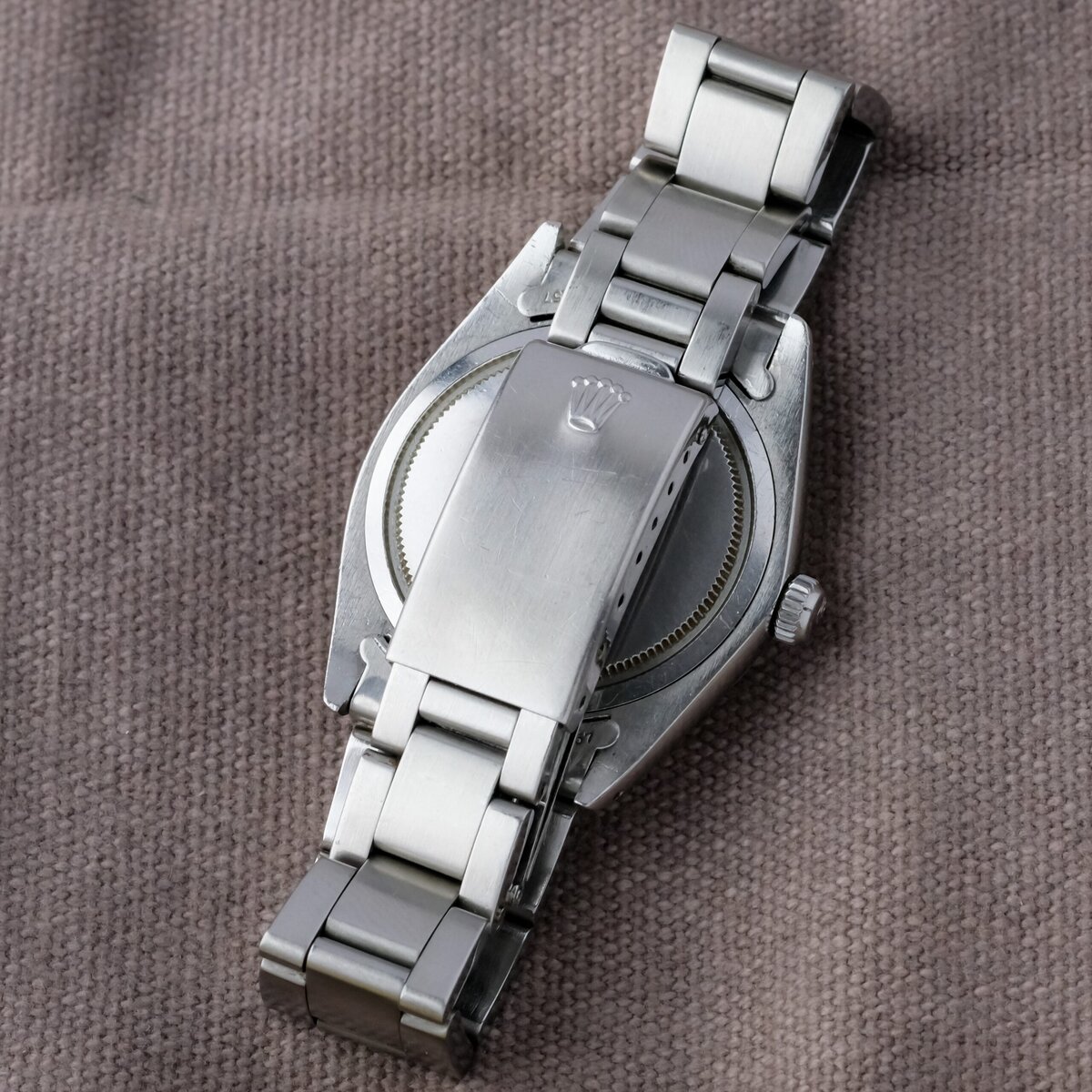 This Rolex Oysterdate reference 6694 is a rare and beautifully preserved example of one of the brand’s most distinctive vintage models. Crafted in stainless steel with a 34 millimeter case, it features a solid smooth bezel and the classic Oyster bracelet, offering the timeless proportions and durability that define mid-century Rolex design.